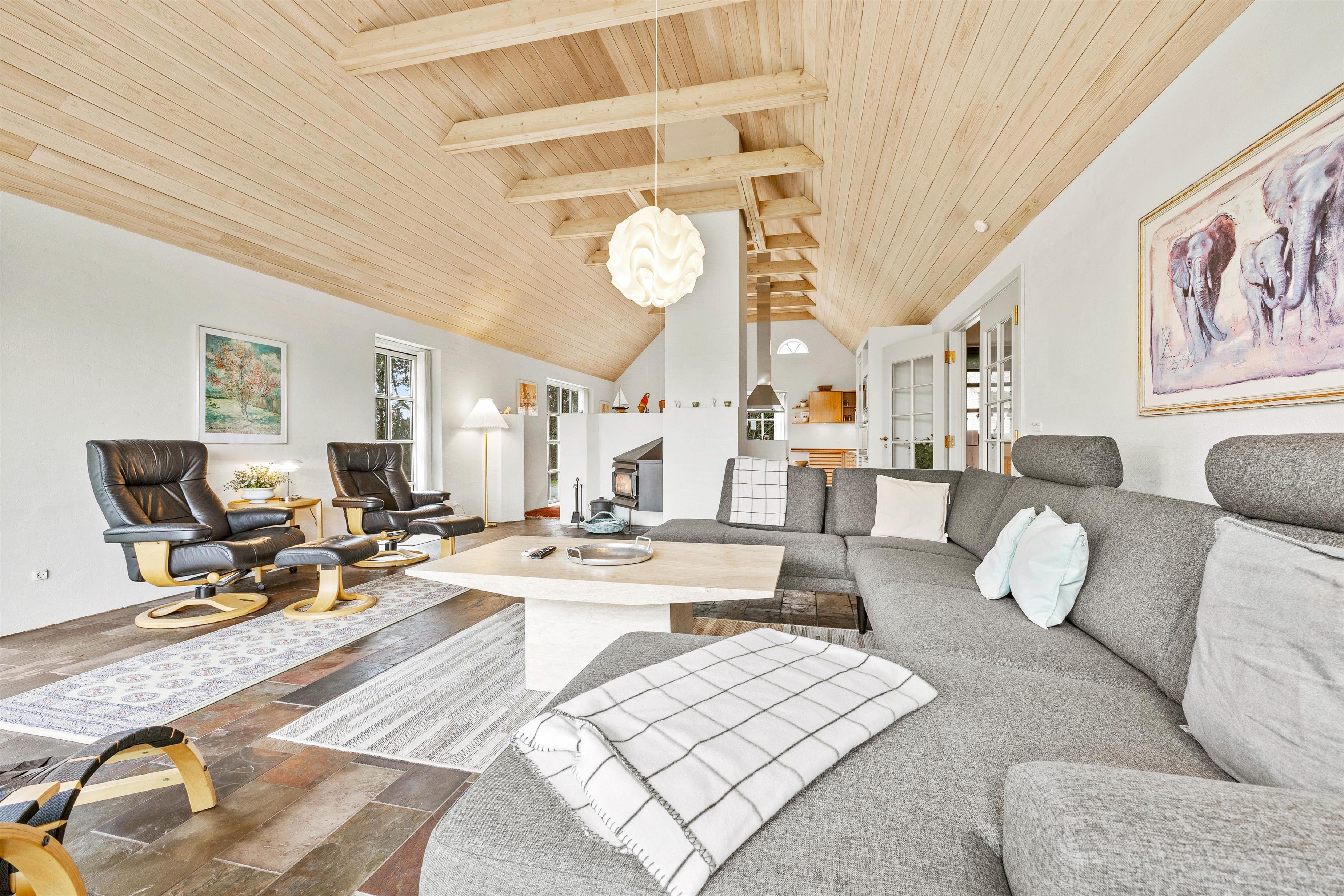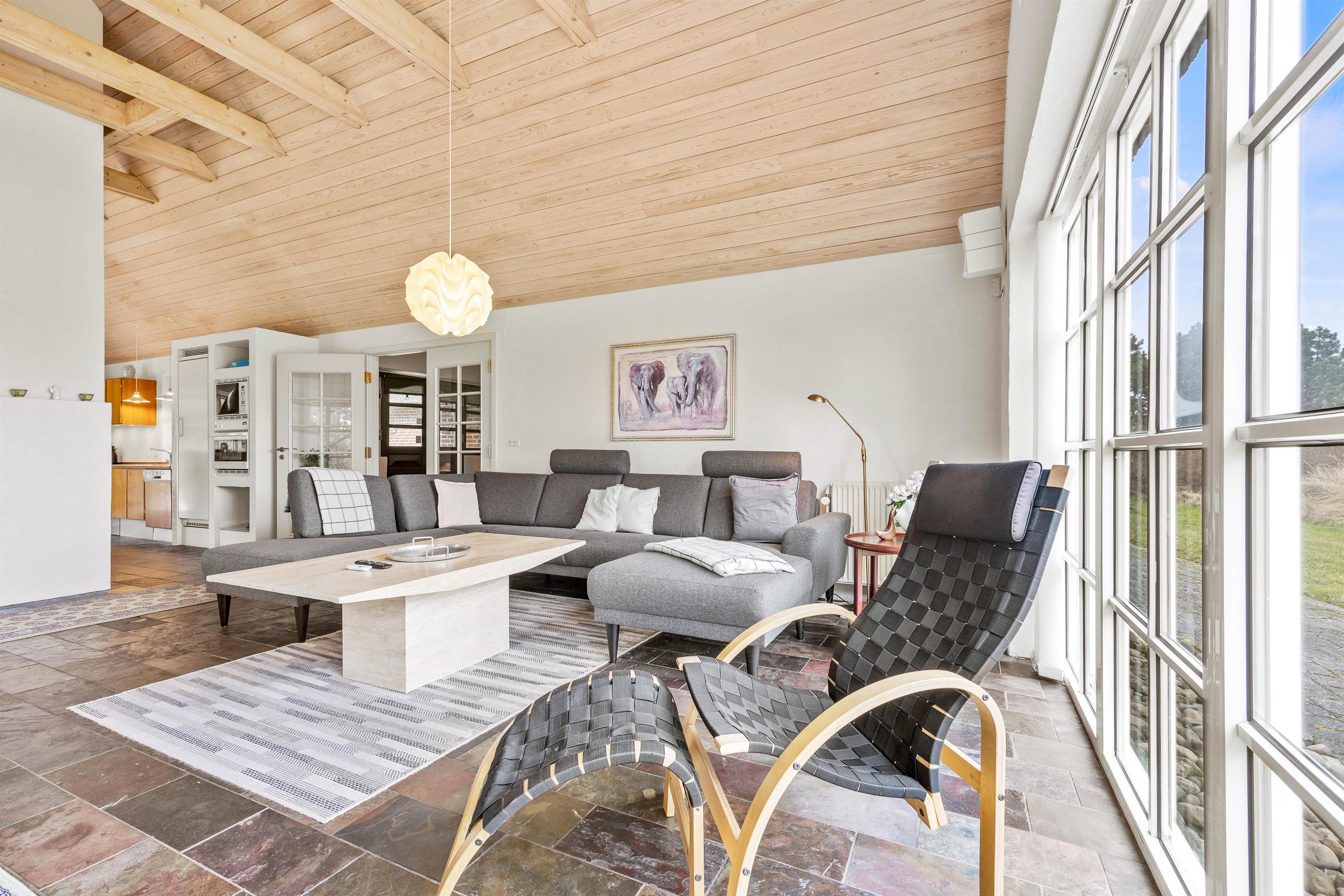 På A M Listsvej 15 kompletterer sprossevinduer og -døre samt de små buede ruder øverst det indtryk, I får udefra, og I føler jer velkommen, straks I træder indenfor. Det rustikke og harmoniske materialevalg med pudsede vægge, hanebånd og træbeklædte lofter op i kip giver en dejlig feriestemning, og man får lyst til at udforske sommerhuset nærmere. Det fine lysindfald gennem det brede vinduesparti i stuen løfter stemningen, og samtidig har I en vidunderlig udsigt over de grønne områder. Her kan I slappe af i sofaen og nyde en TV-serie eller trække jer tilbage i en stol med jeres yndlingslæsestof.