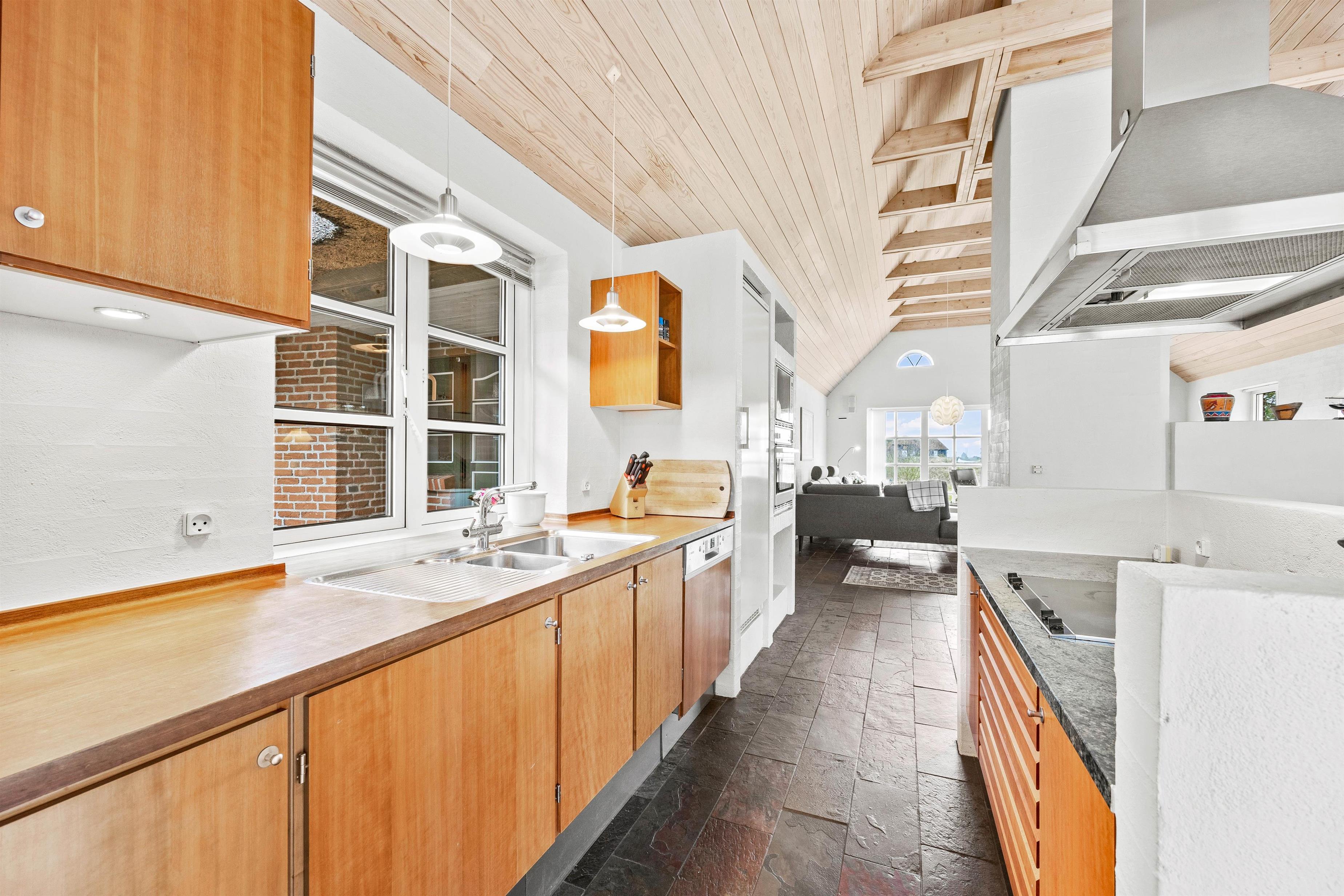 Det hyggelige køkken med spiseplads indeholder alt, hvad I behøver for at forkæle hinanden med lækre hjemmelavede måltider. Det er udstyret med køleskab, opvaskemaskine, fryser på 60 liter og mikroovn. Det smukke klinkegulv giver køkkenet og opholdsstuen et elegant præg.