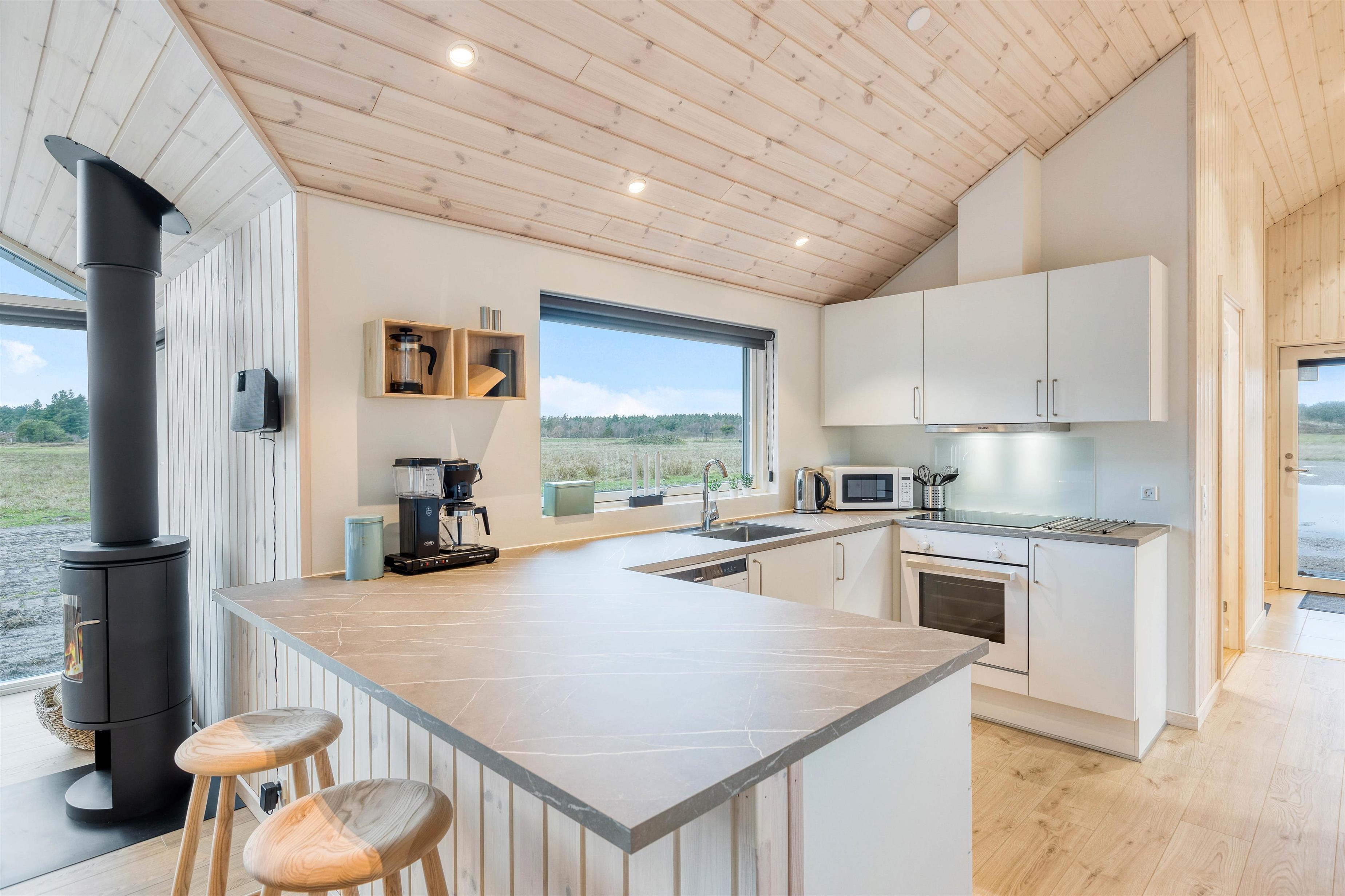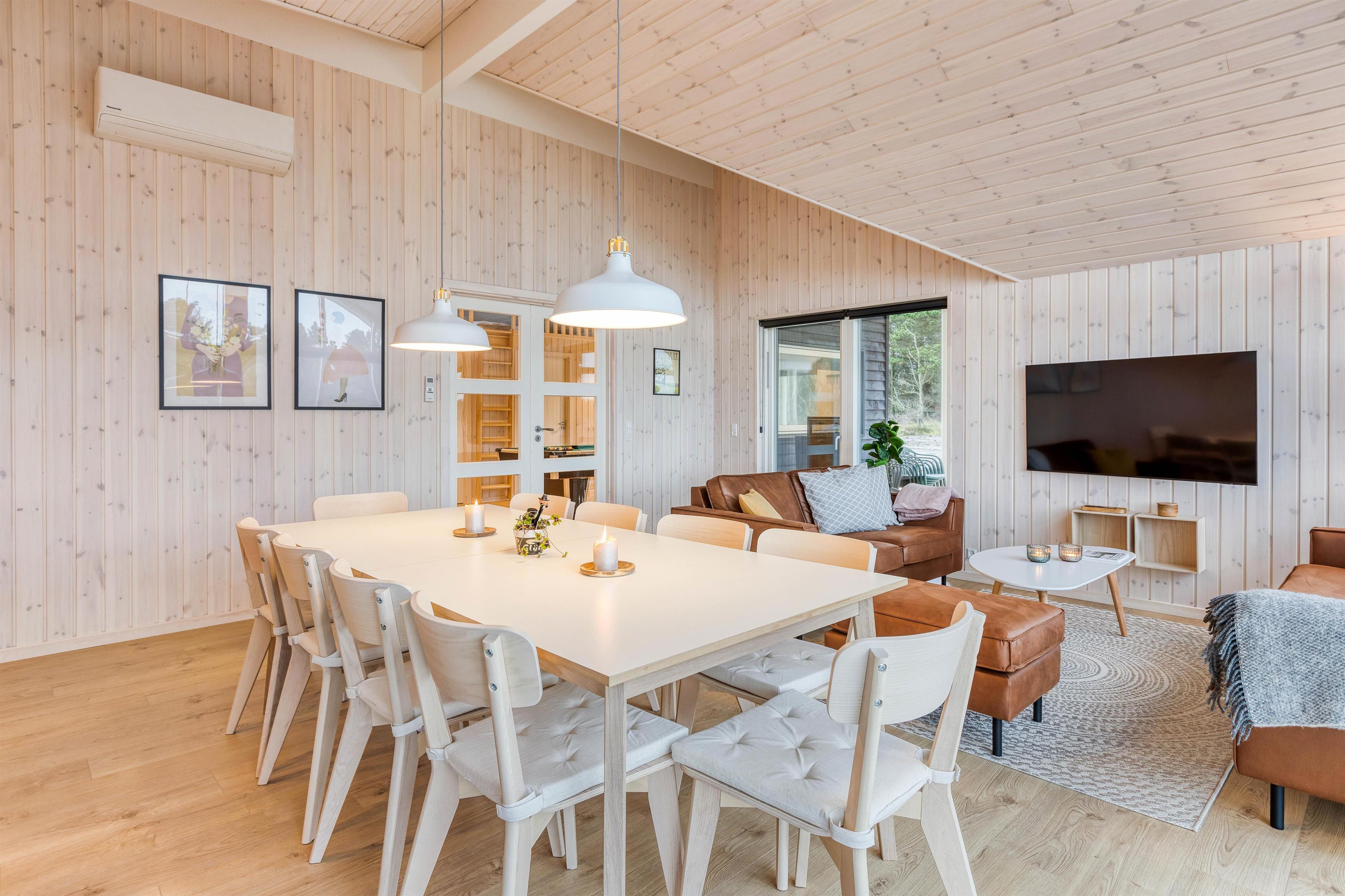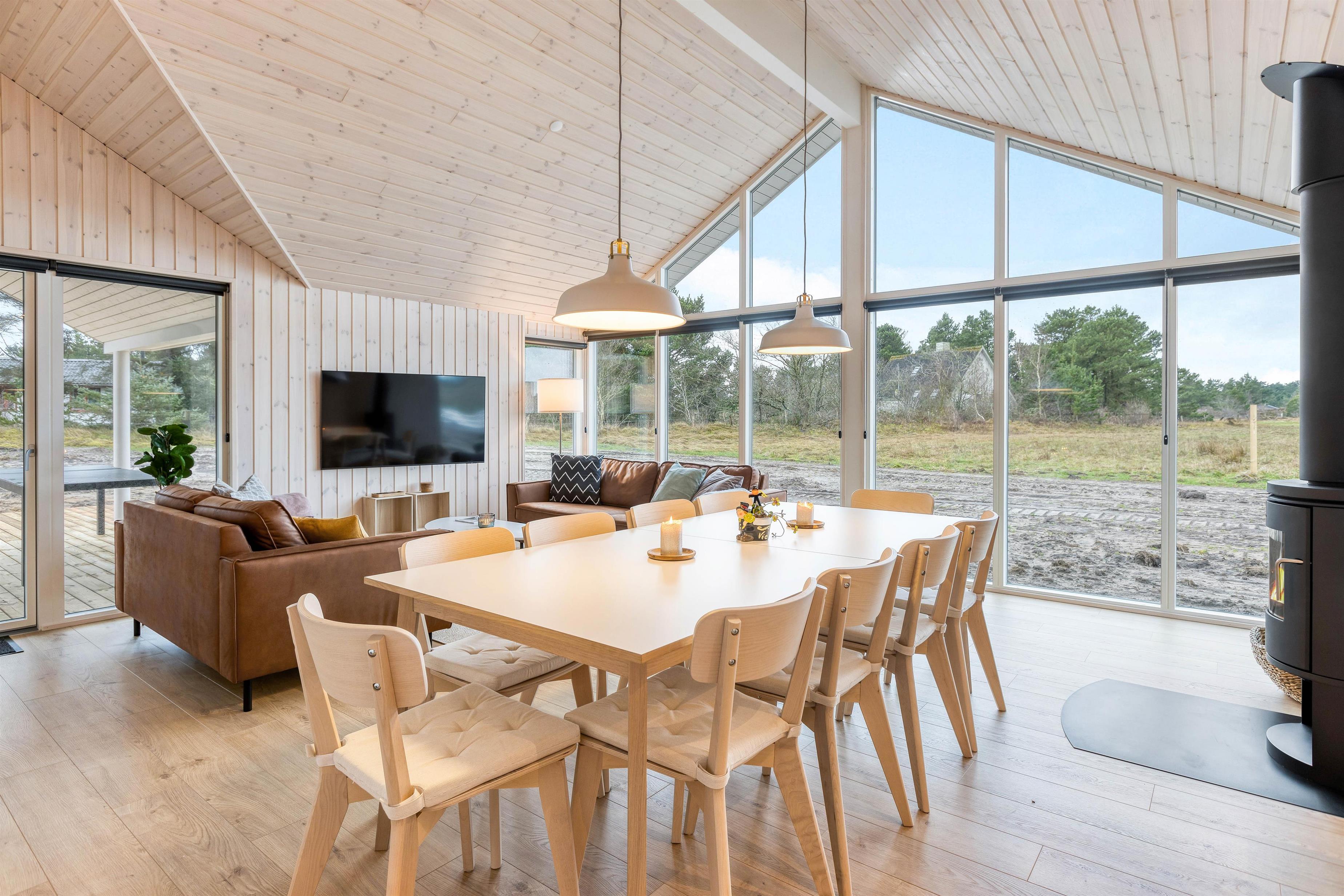 Er I på ferie med 10 personer inviterer køkkenet jer til fælles madlavning, og opvaskemaskinen tager sig af det praktiske arbejde efterfølgende. Hermed får i tid til samvær med familien, og den hyggelige stue danner den perfekte ramme hertil. Spil nogle brætspil omkring bordet, eller hyg jer med en afslappende filmaften, mens brændeovnen omfavner jer med sin varme. Ved behov kan I tænde for den energibesparende varmepumpe.