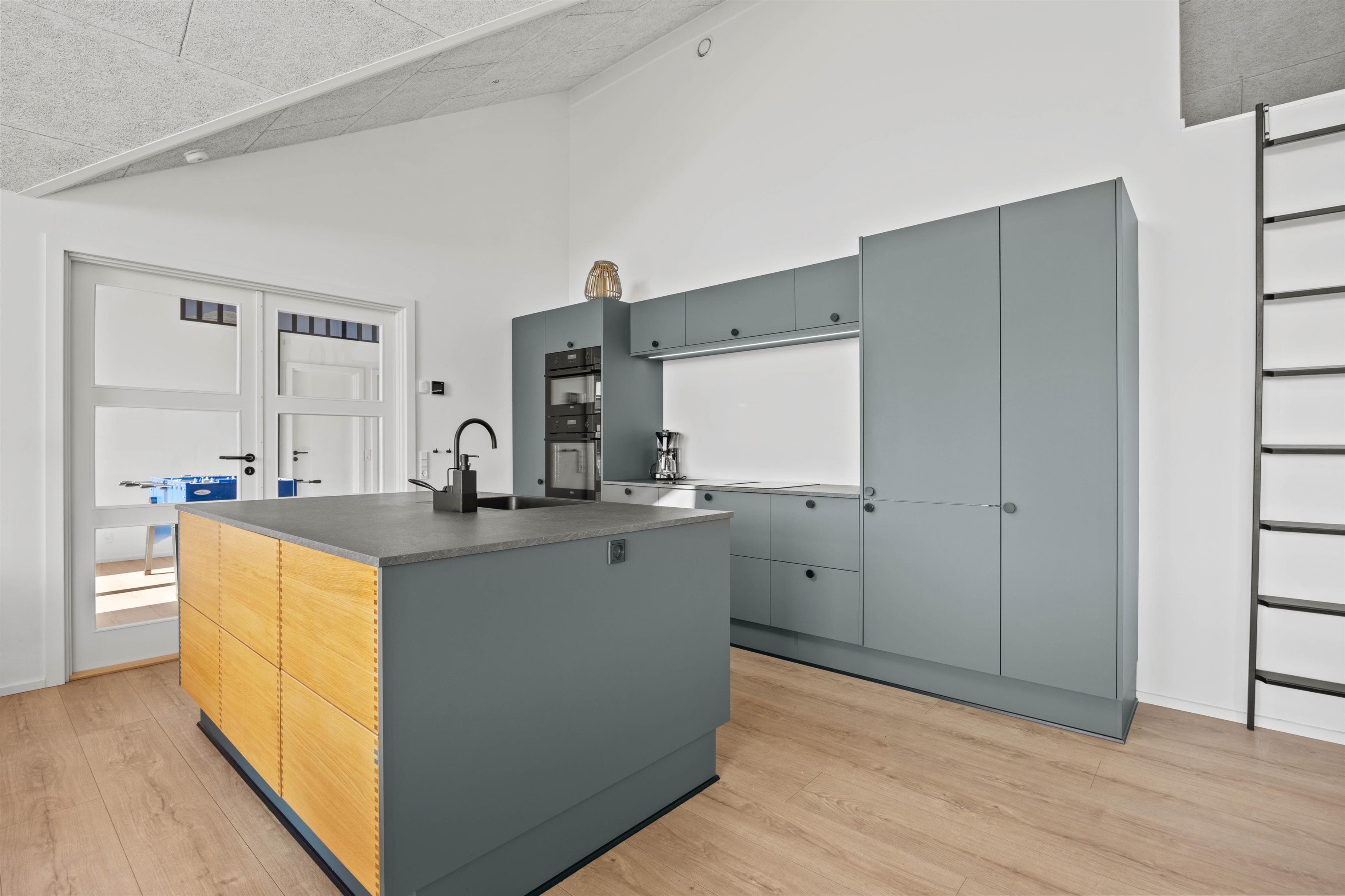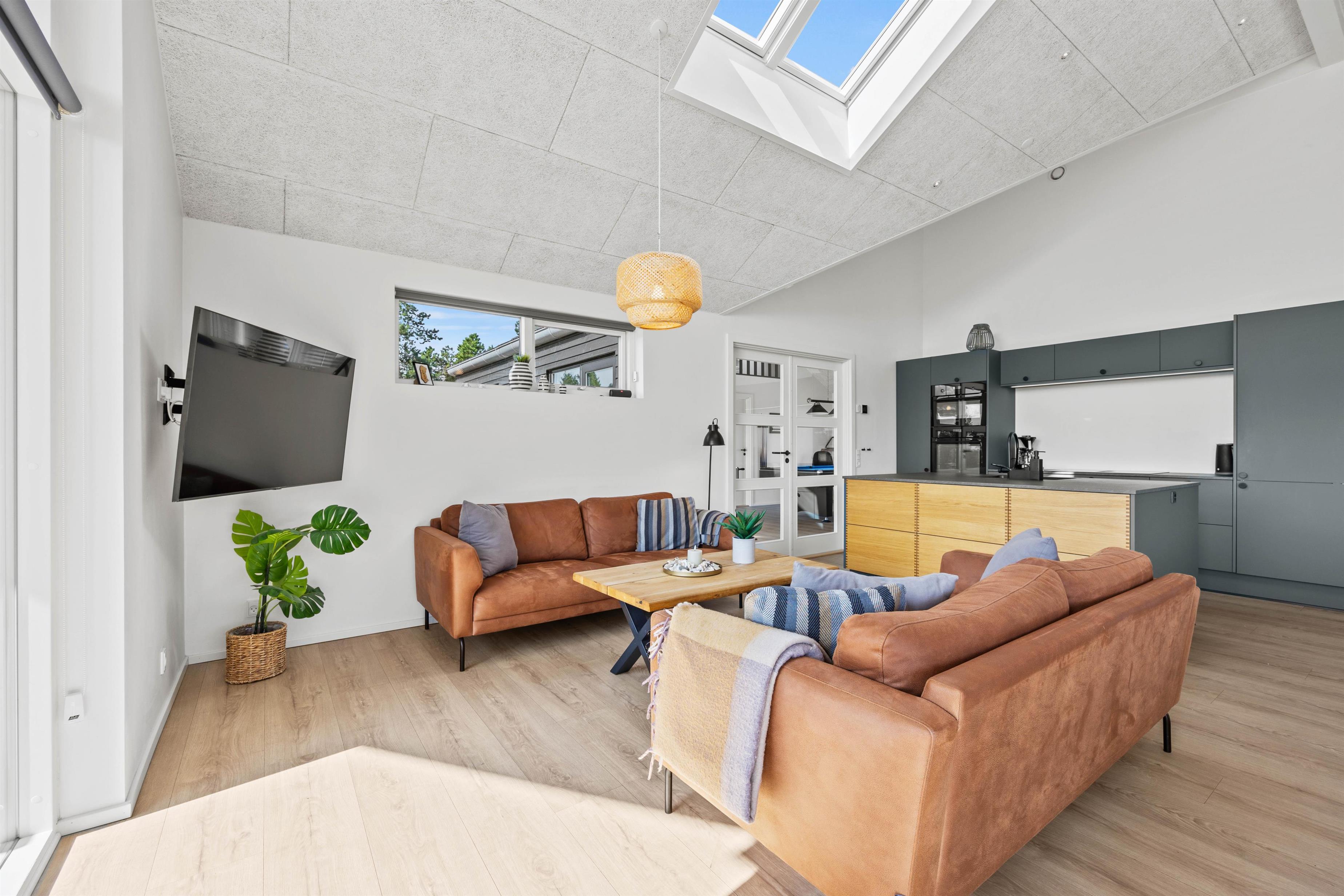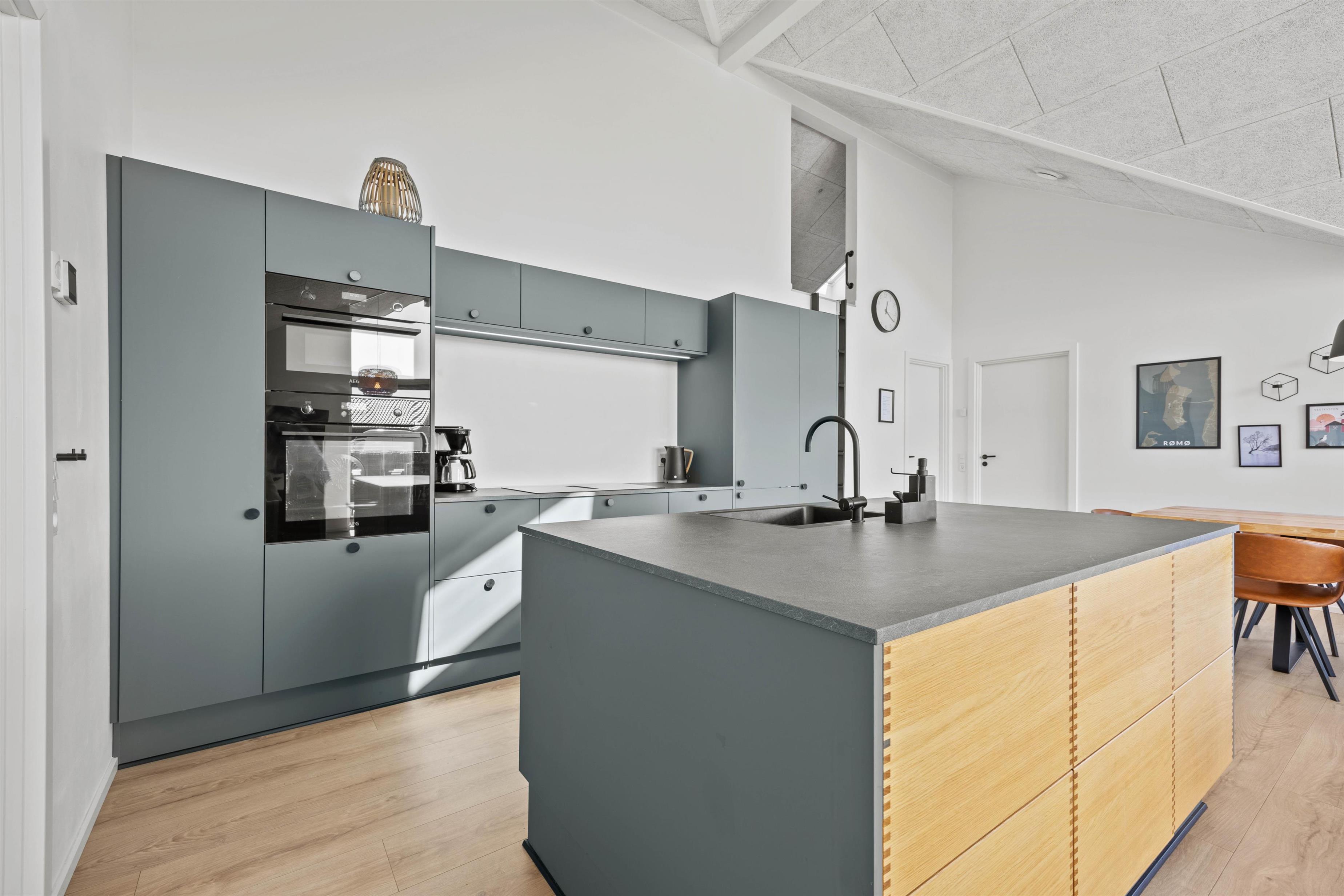 Hjertet i sommerhuset er det store køkkenalrum, hvor de rene linjer fra det veludstyrede køkken med opvaskemaskine står i skarp kontrast til det rå udtryk fra spisepladsen og opholdsstuen. Her har I det perfekte samlingssted for hele familien med gode muligheder for samvær.