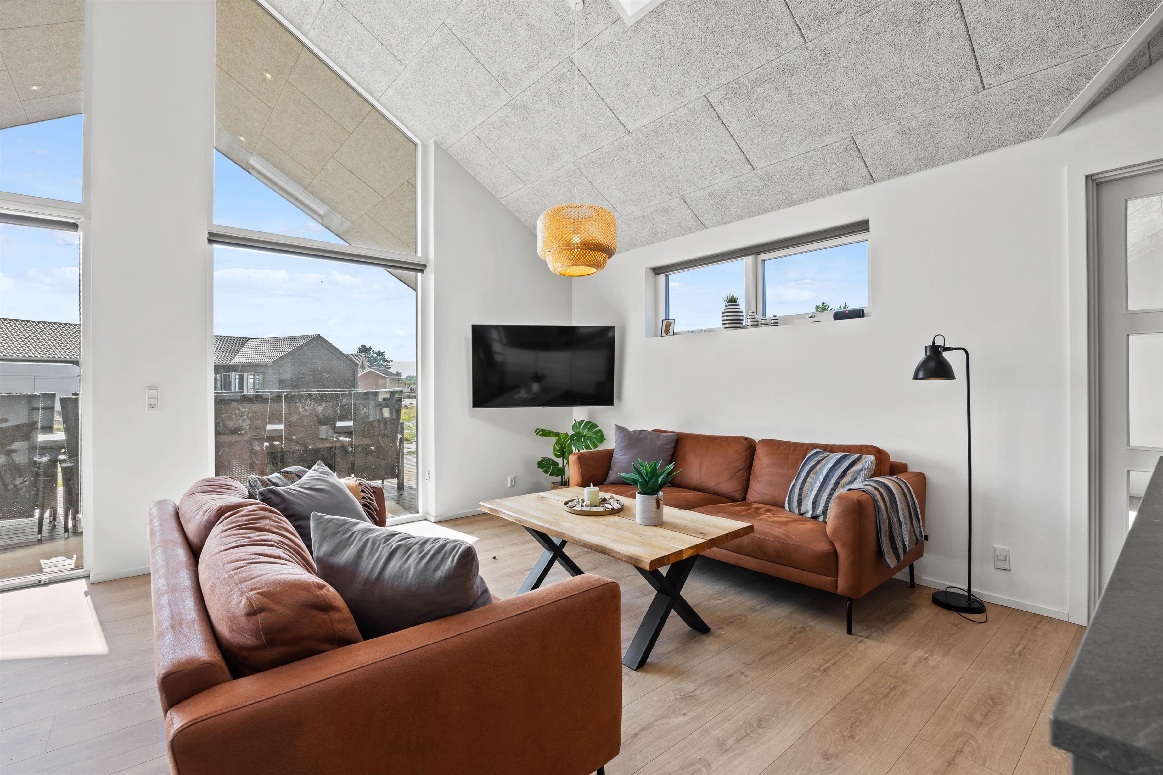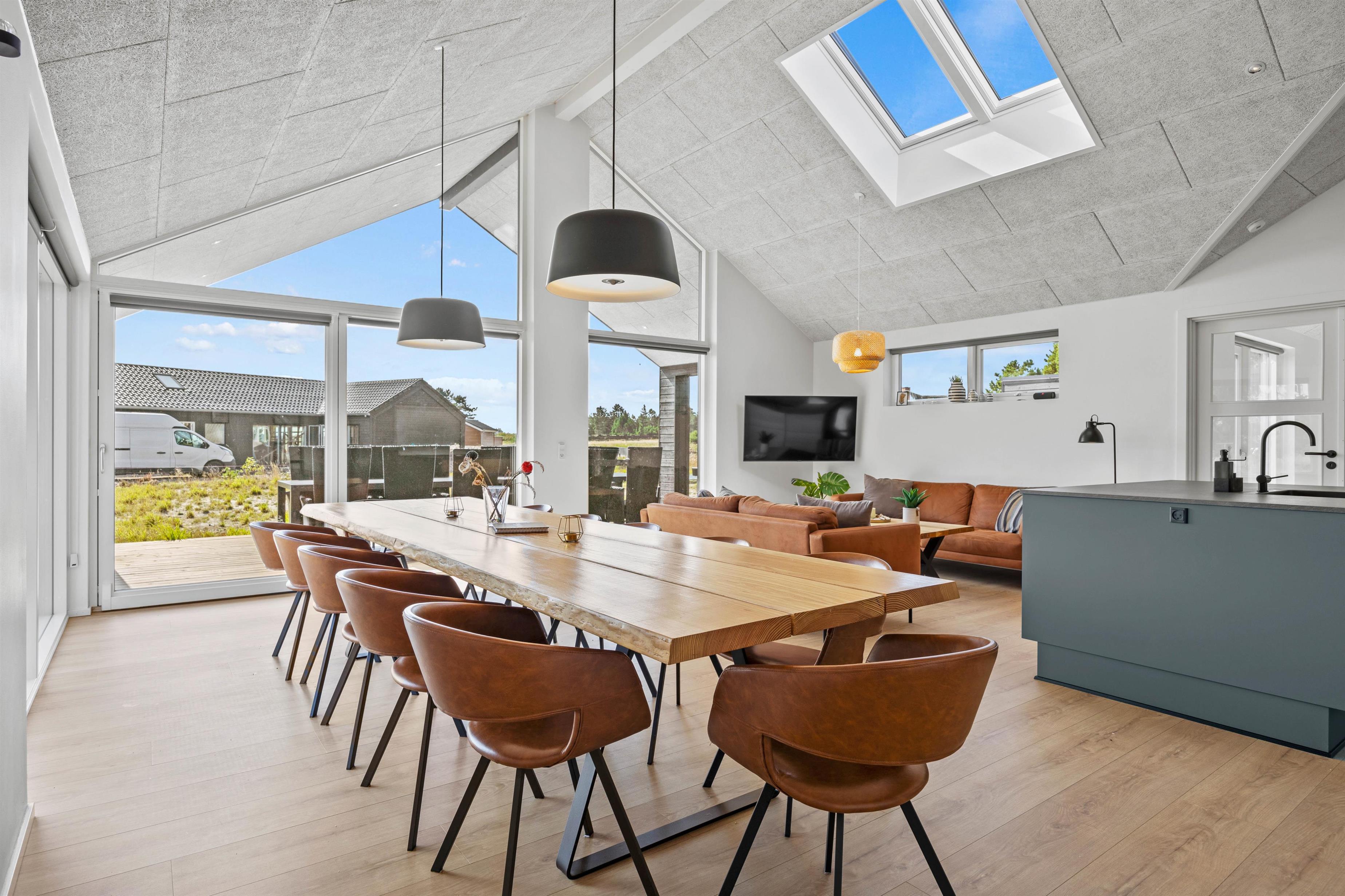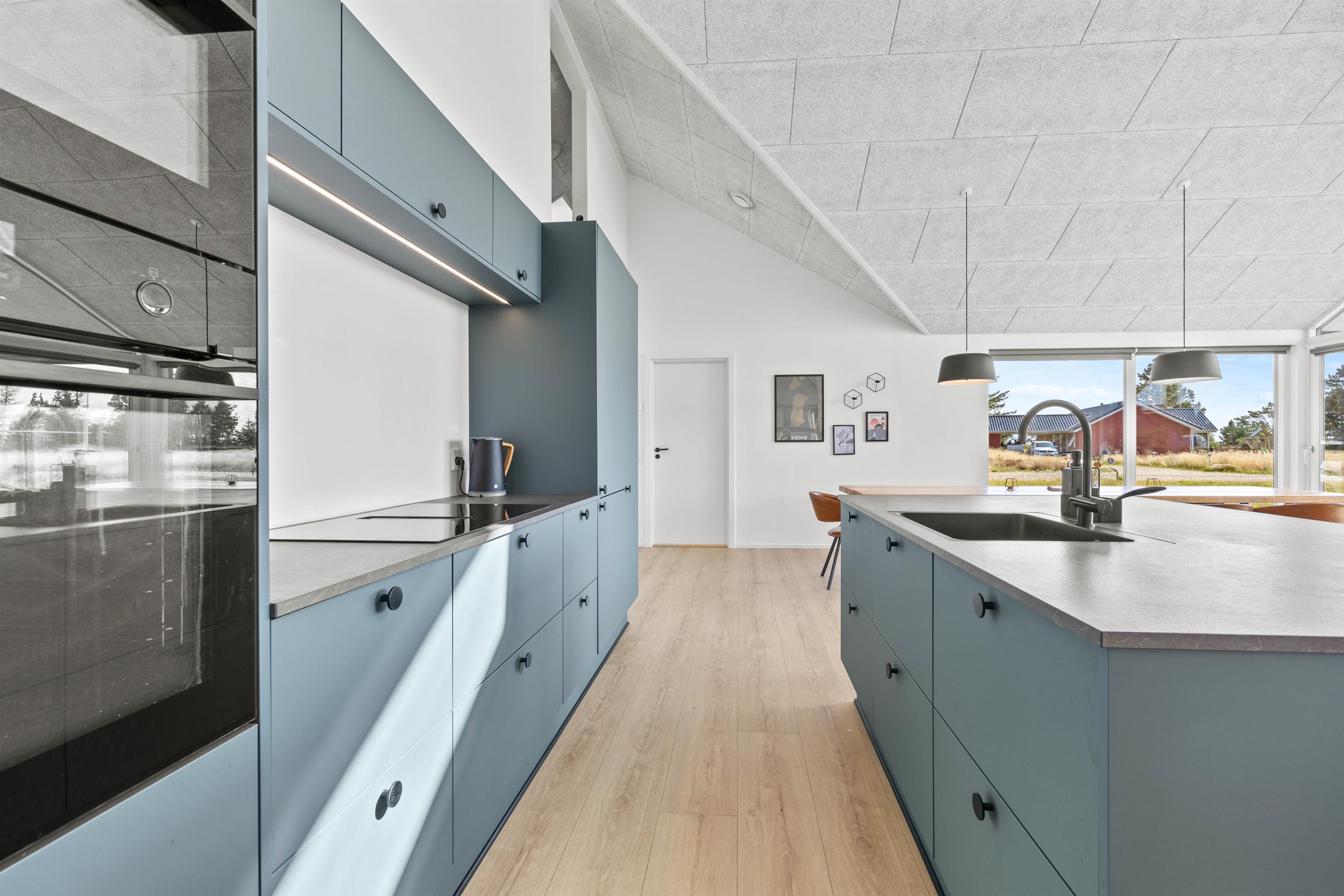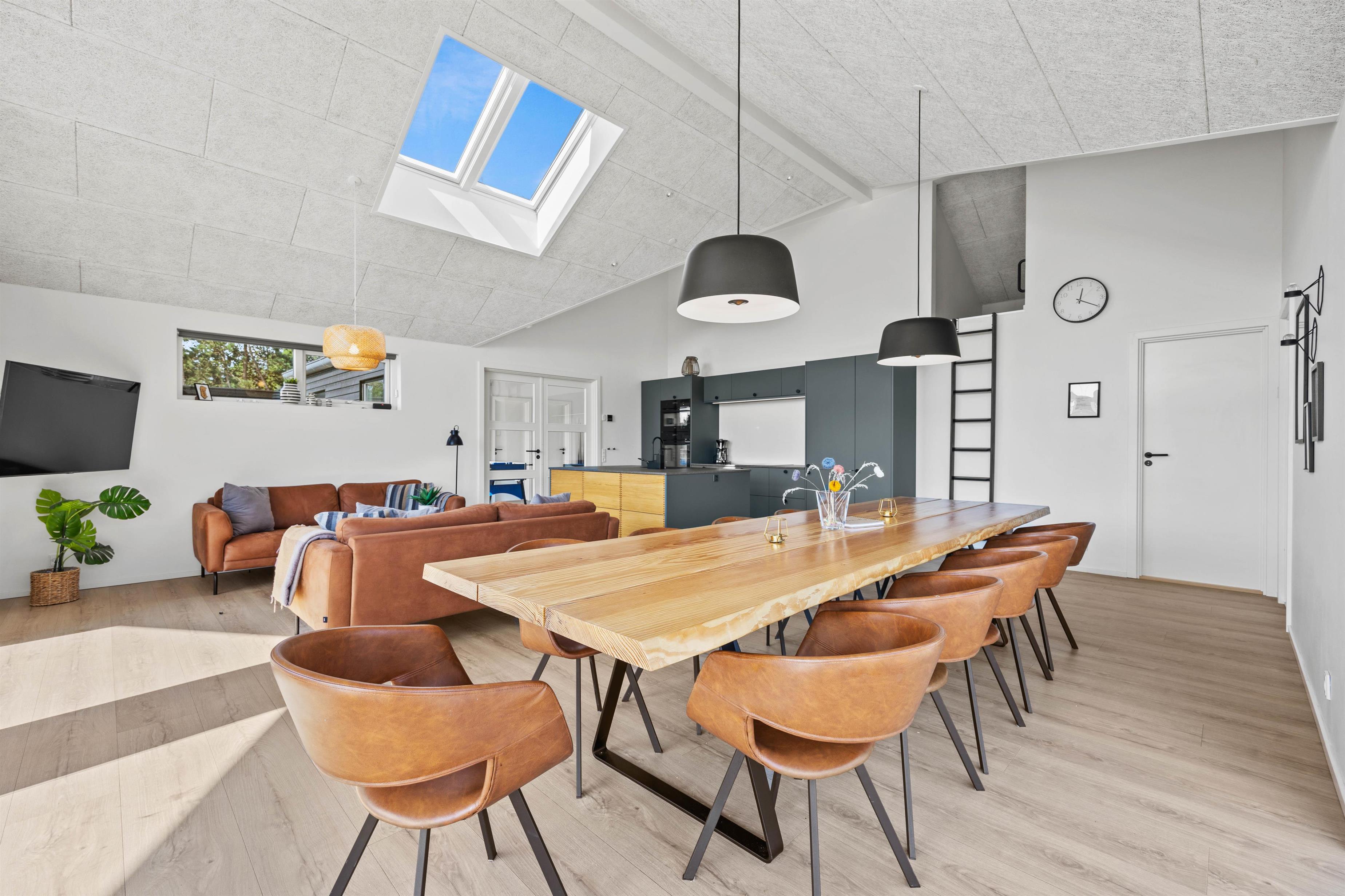 Hjertet i sommerhuset er det store køkkenalrum, hvor de rene linjer fra det veludstyrede køkken med opvaskemaskine står i skarp kontrast til det rå udtryk fra spisepladsen og opholdsstuen. Her har I det perfekte samlingssted for hele familien med gode muligheder for samvær.