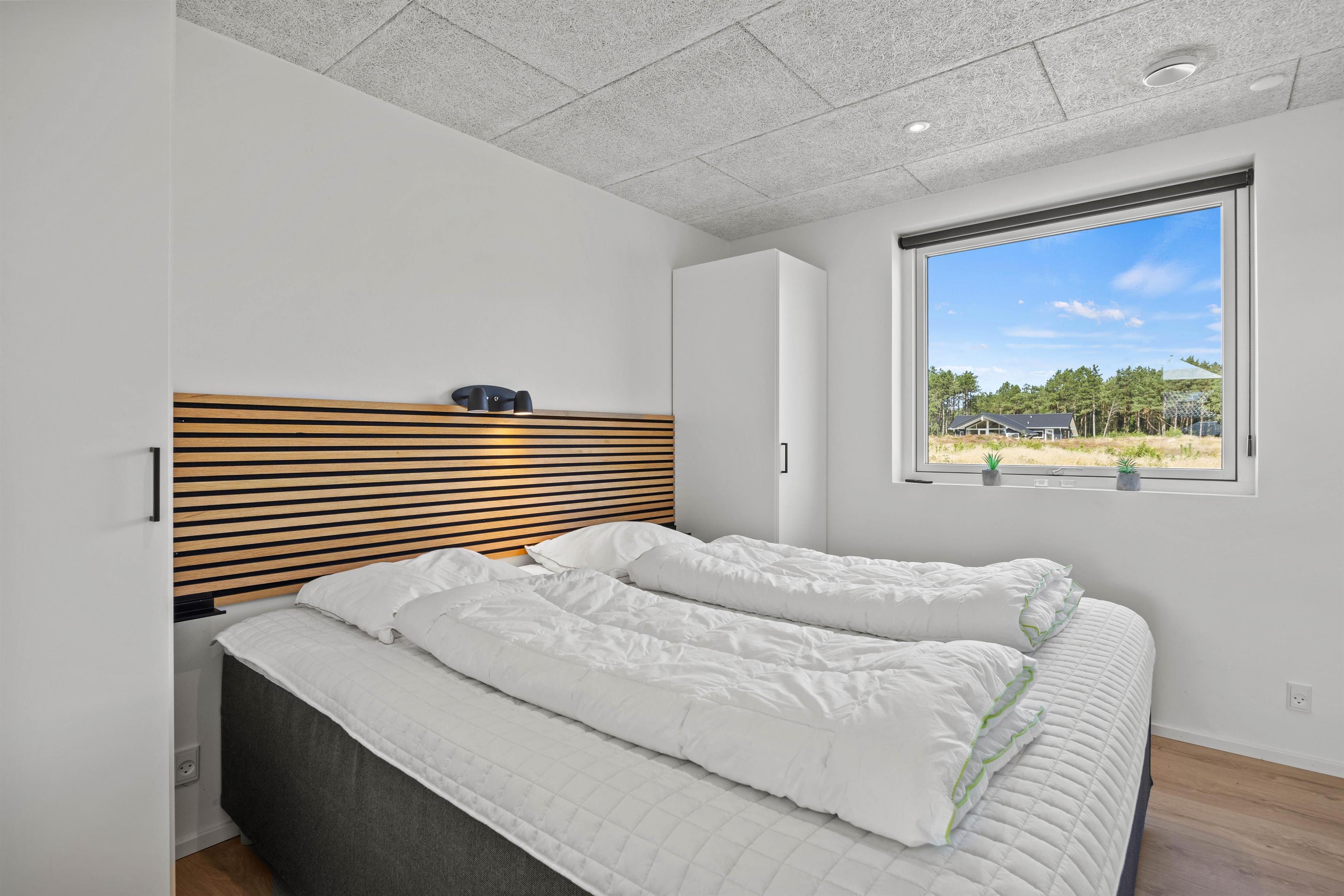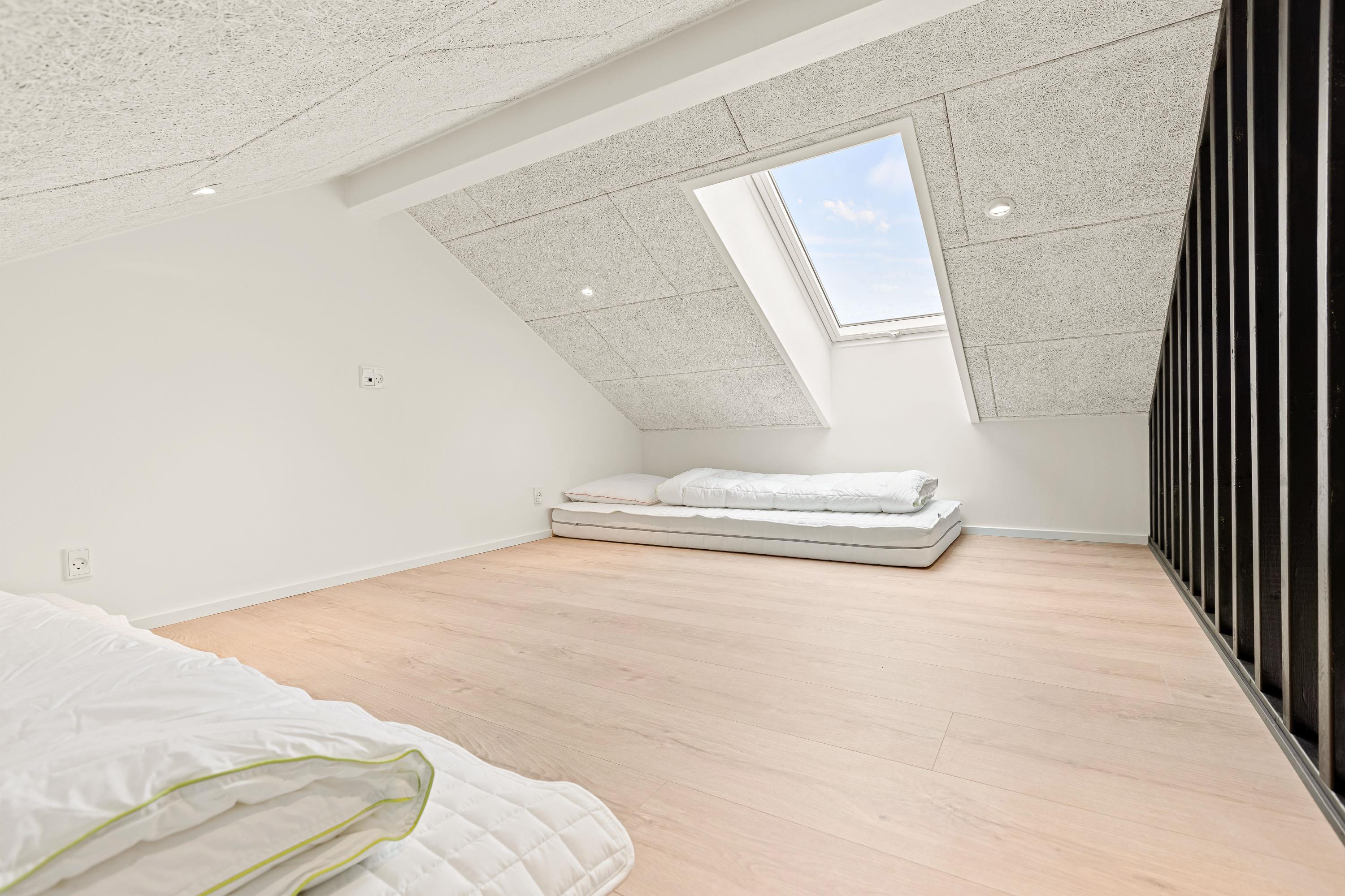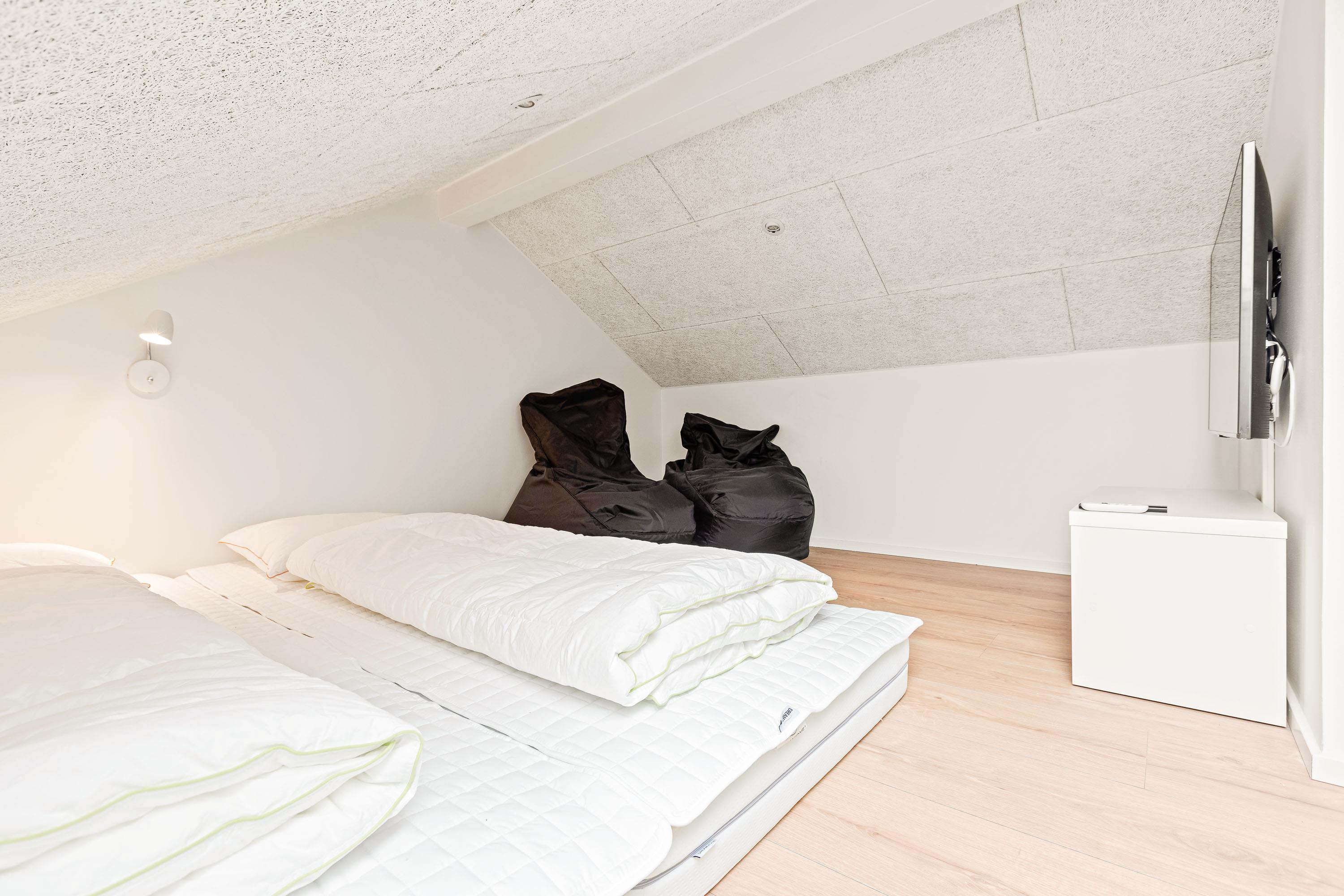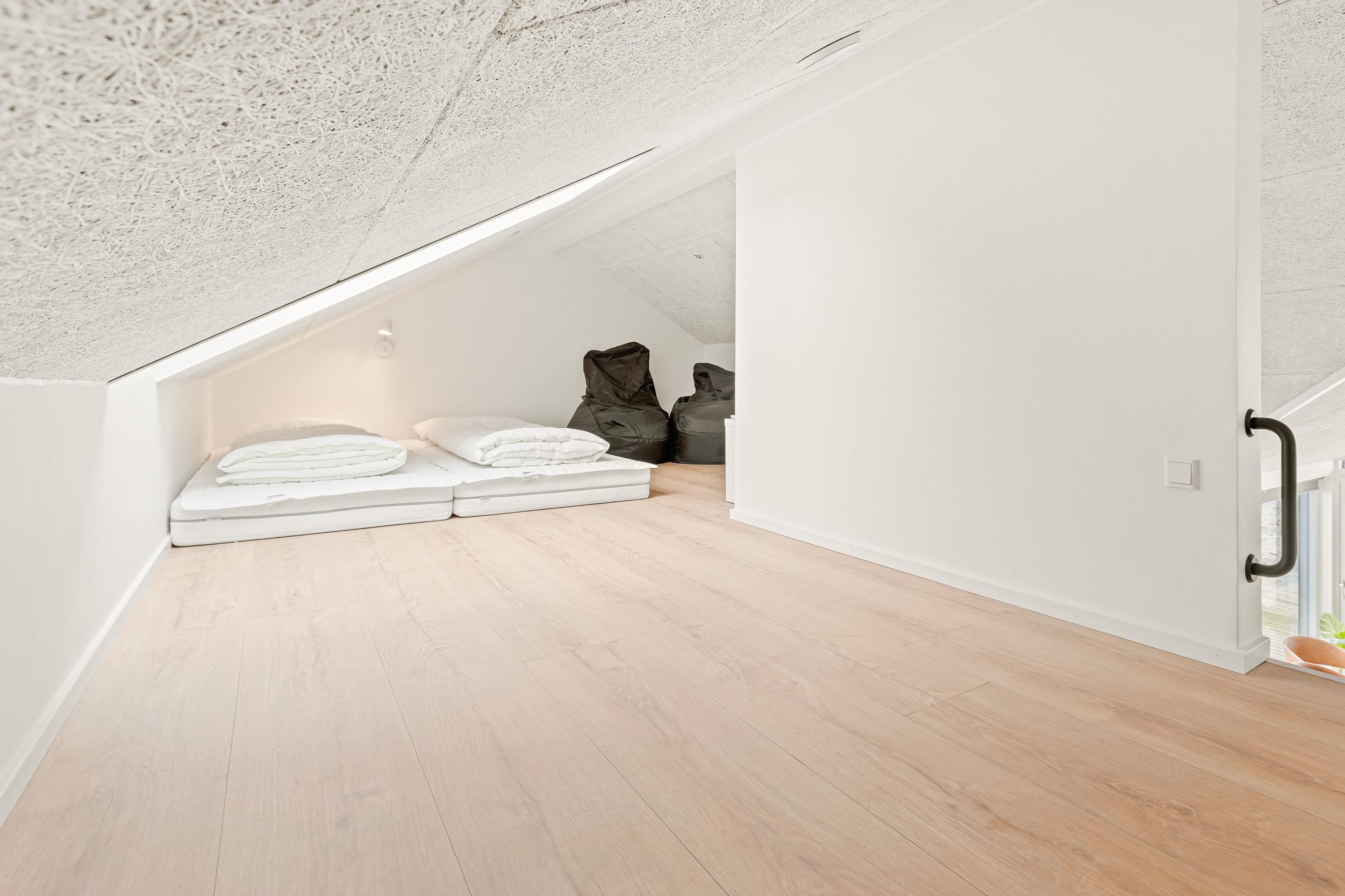 Sommerhuset indeholder 4 soverum, hvoraf 3 er indrettet med en 180x200cm dobbeltseng, mens det sidste har en 160x200cm dobbeltseng. De resterende 4 sovepladser forefindes på sommerhusets hems med opgang fra aktivitetsrummet.