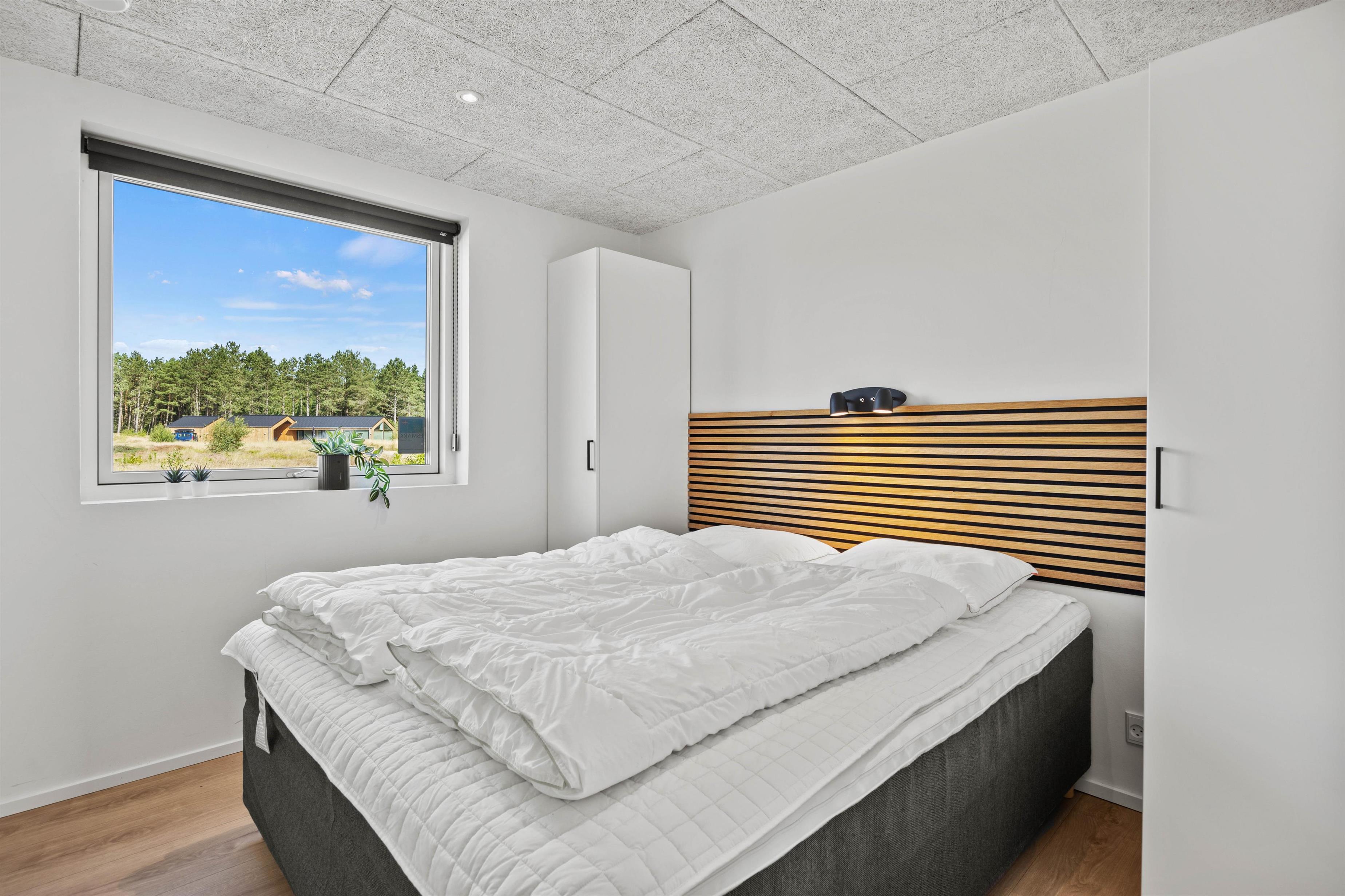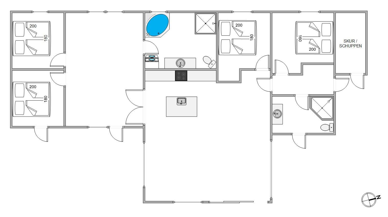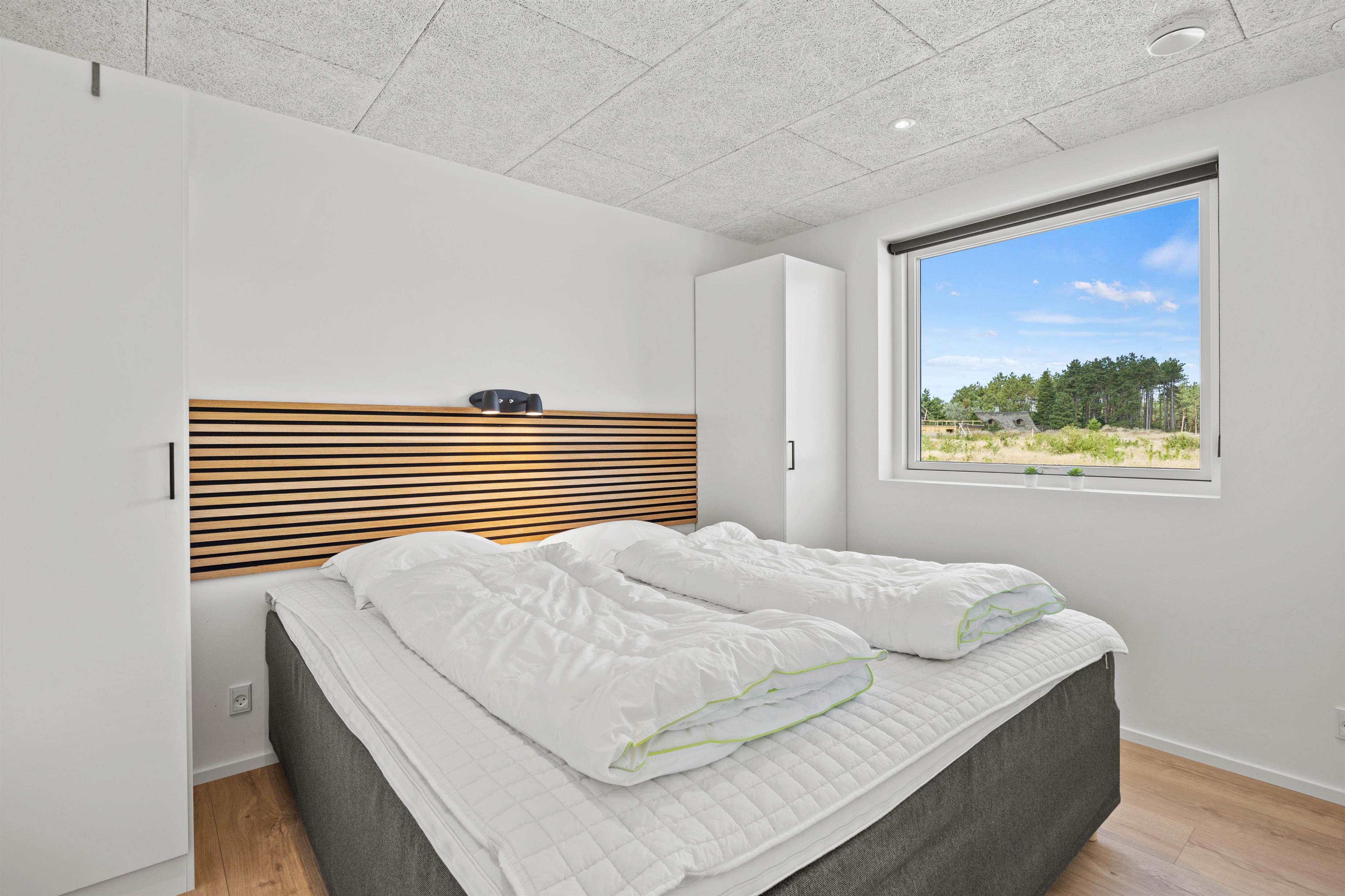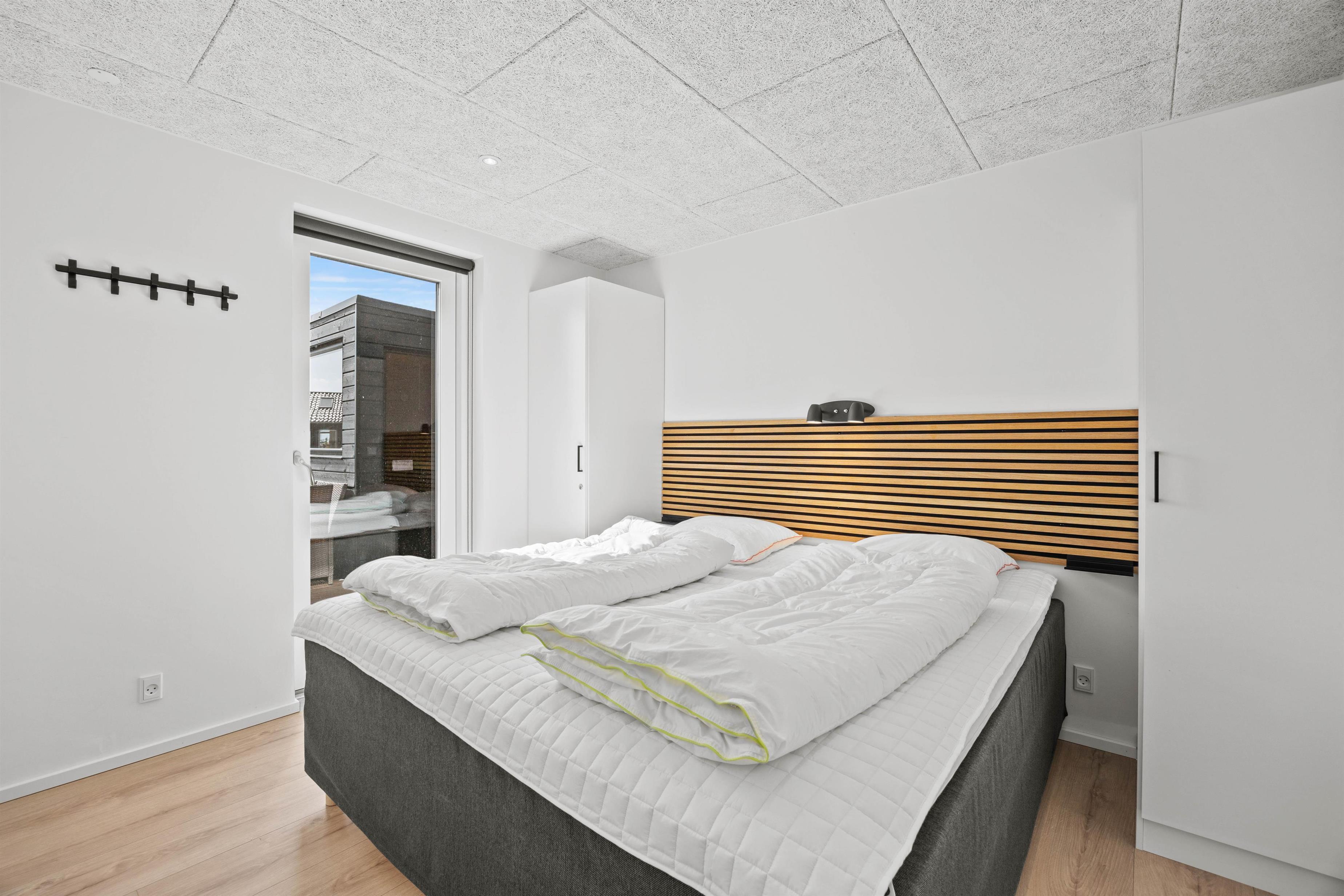 Sommerhuset indeholder 4 soverum, hvoraf 3 er indrettet med en 180x200cm dobbeltseng, mens det sidste har en 160x200cm dobbeltseng. De resterende 4 sovepladser forefindes på sommerhusets hems med opgang fra aktivitetsrummet.