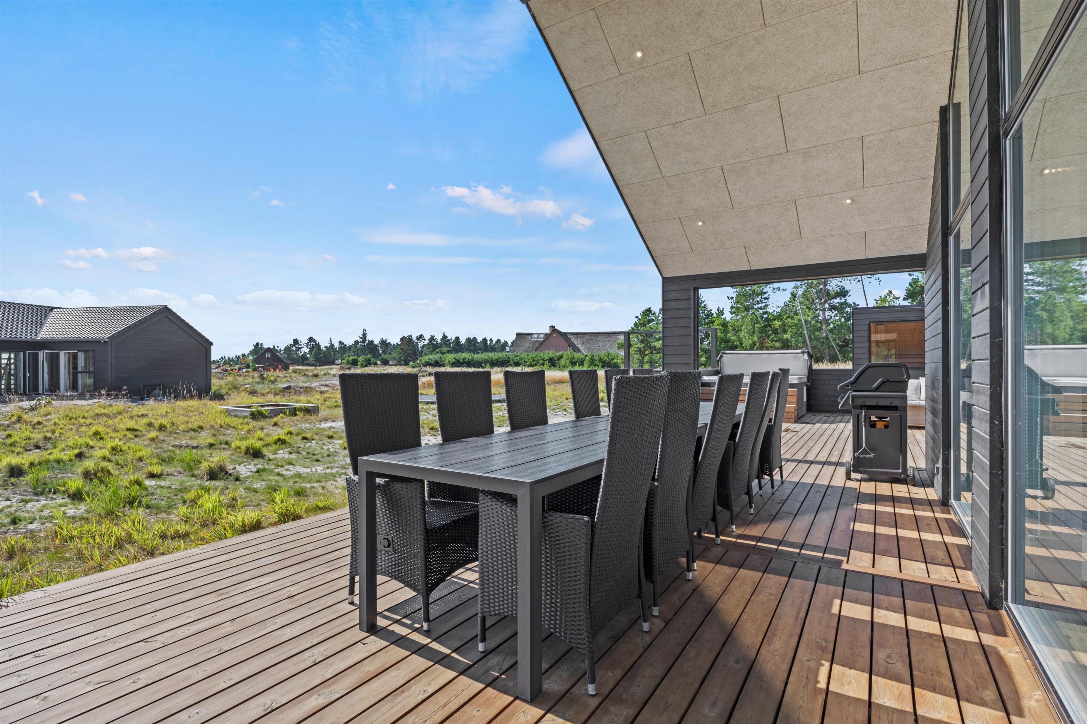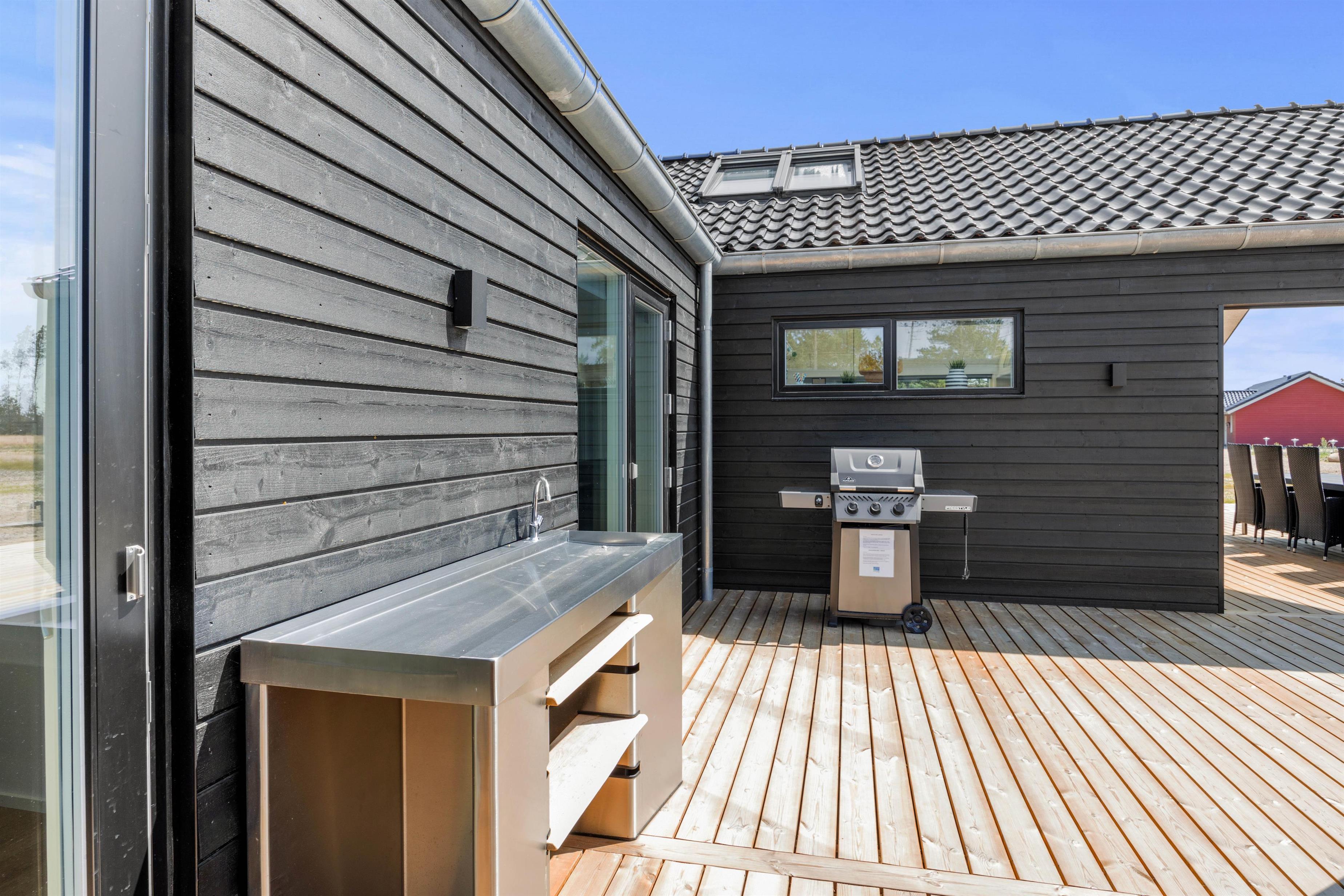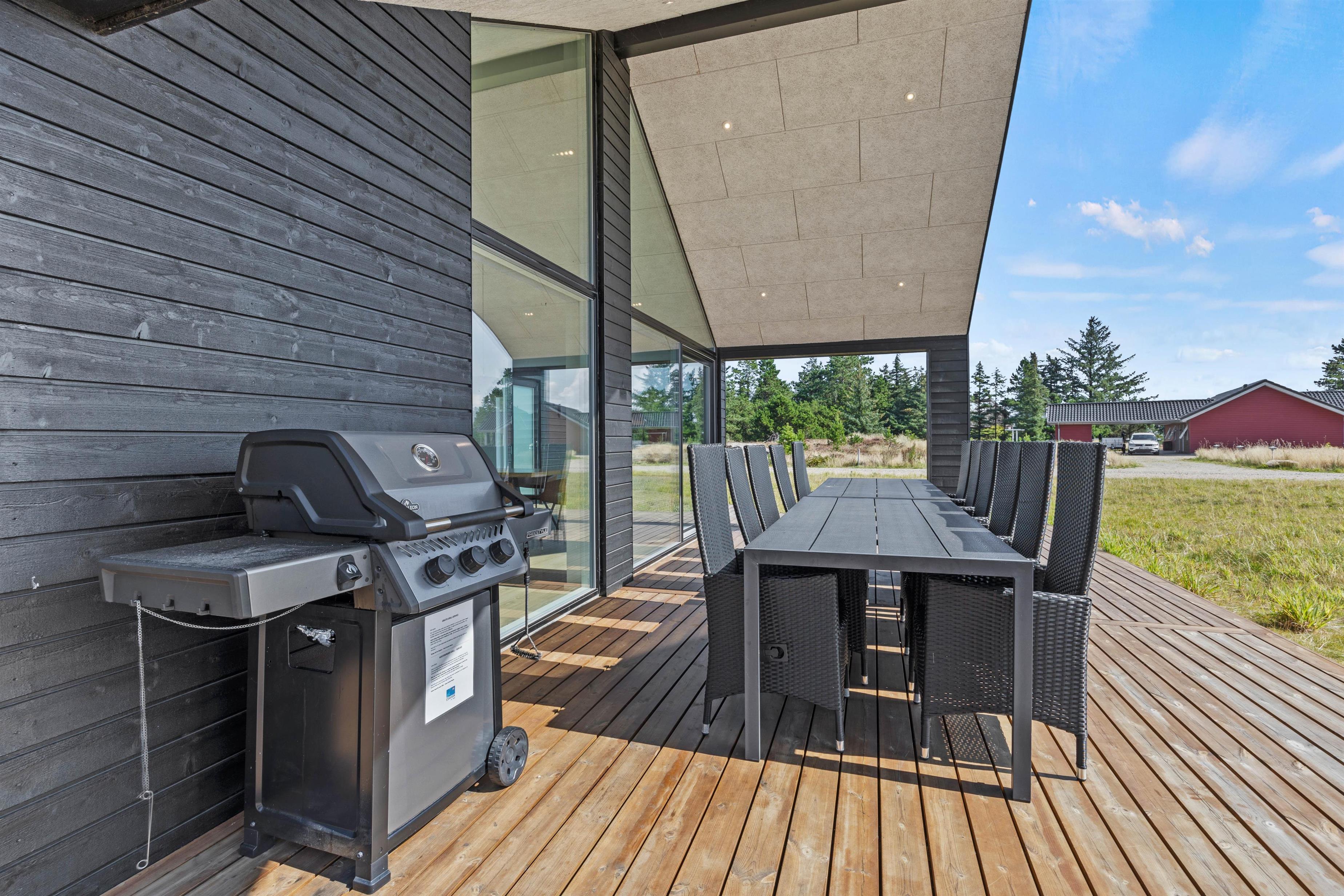 Med udgang fra aktivitetsrummet ligger sommerhusets skønne terrasse, der er indrettet med gode havemøbler og en gasgrill. Læn jer tilbage på solvognene og nyd feriestemningen, mens grillen syder i baggrunden. Her kan I indtage aftensmaden, mens de mange indtryk fra feriedagen diskuteres og næste dags udflugter planlægges.
