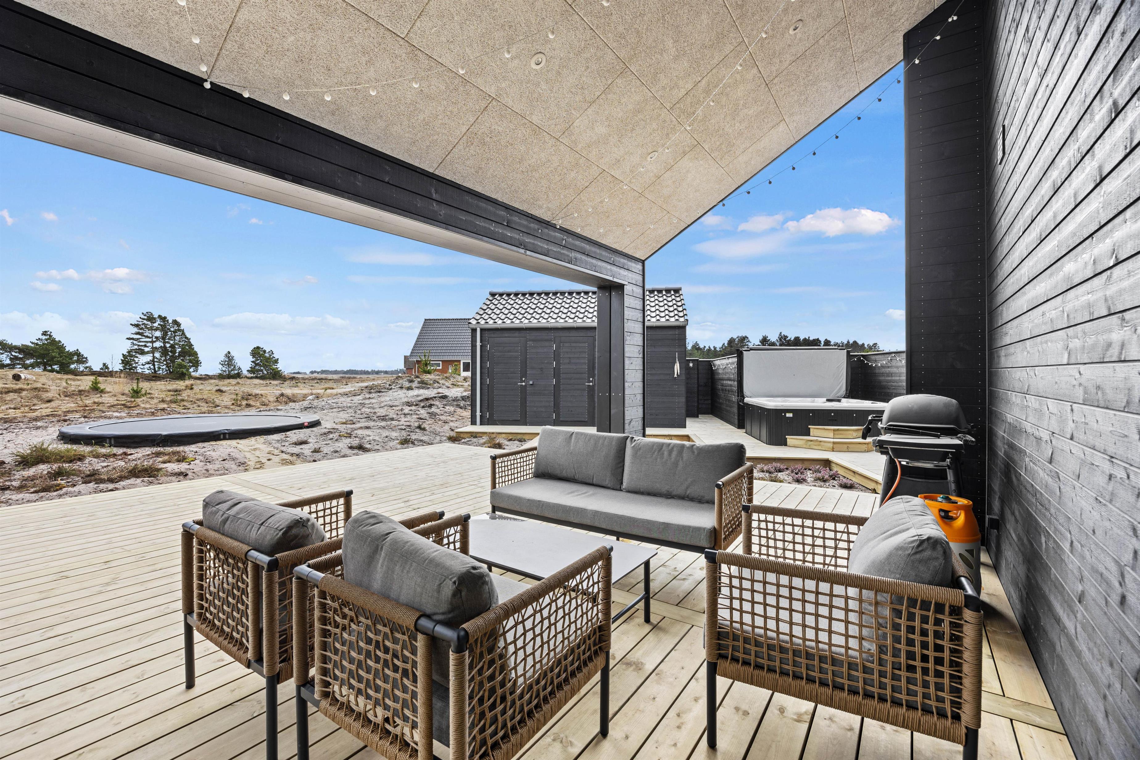 Børnevenlig have! Her er både trampolin, gynger og sandkasse. Her er også en beachvolleybane, hvor hele familien kan dyste! Ønsker man at kombinere ferie med wellness, tilbyder dette sommerhuset udespa og sauna, hvor afslapning er i højsædet – et perfekt afbræk fra hverdagen. Udebruseren kan benyttes fra april til november.