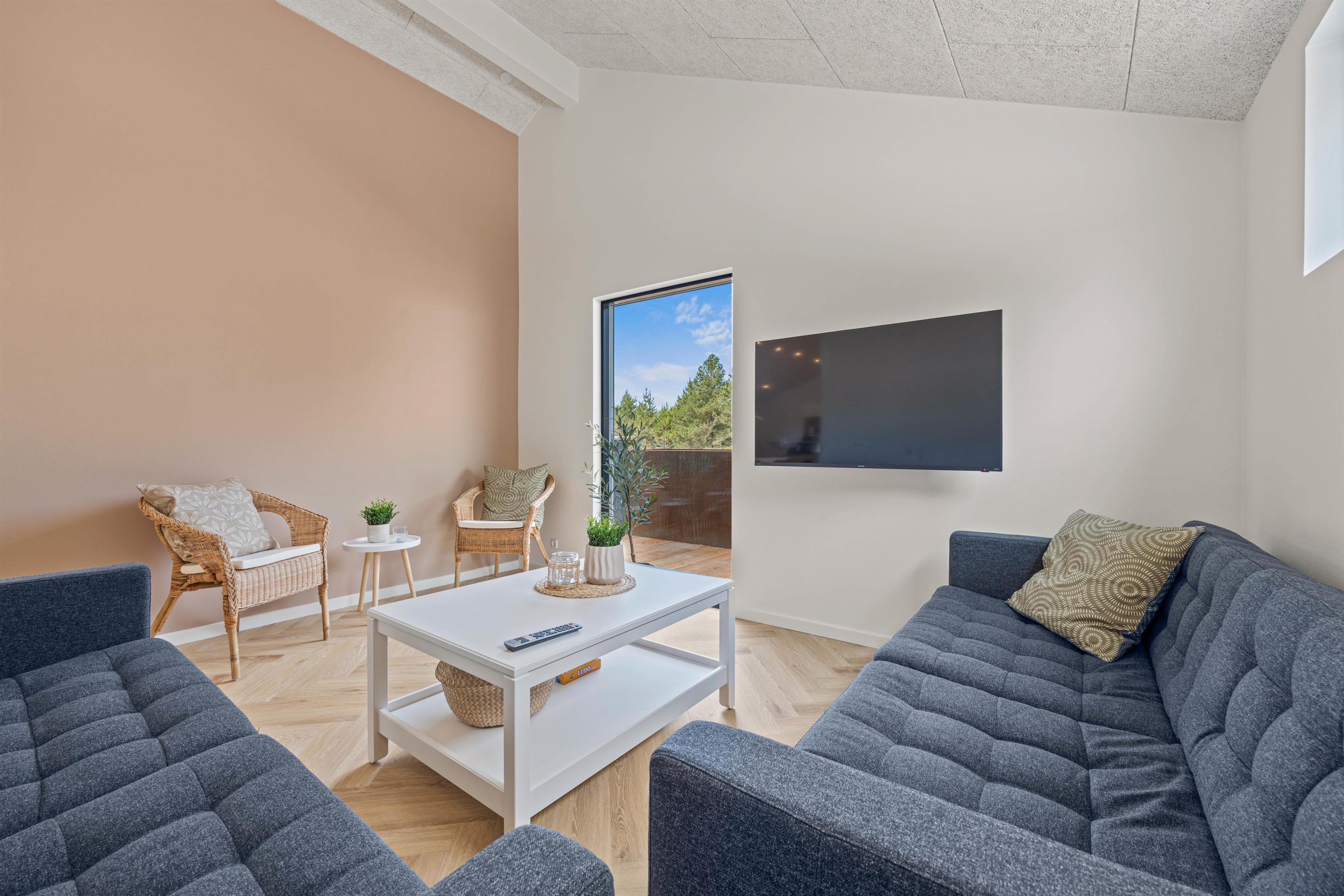 Det moderne sommerhus indbyder til sjove og hyggelige stunder med familien. Sommerhusets hjerterum er opholdsstuen, hvor hele familien kan samles til en hyggelig aften med et spil kort eller en god film i fjernsynet efter en lang og begivenhedsrig feriedag.