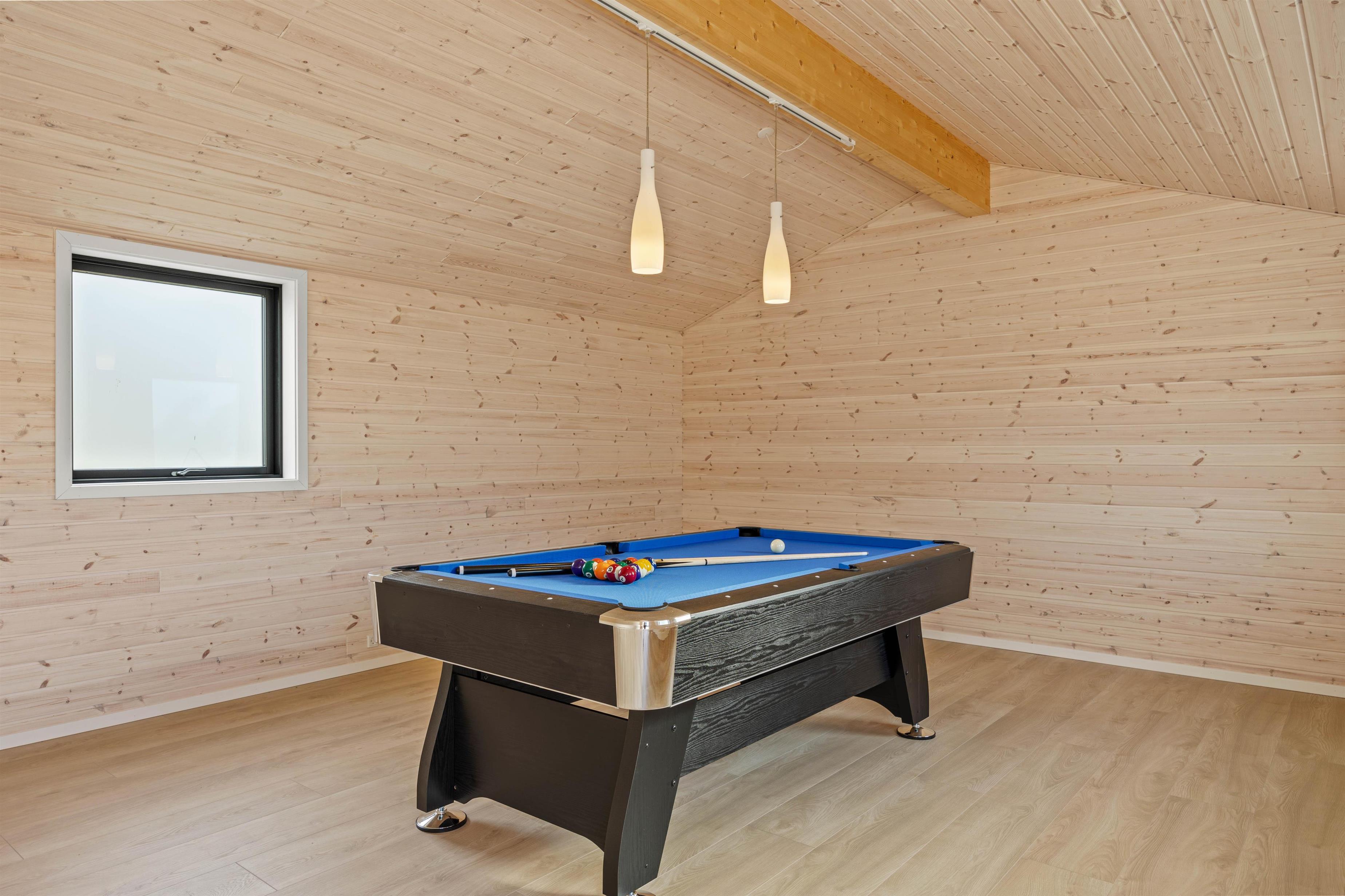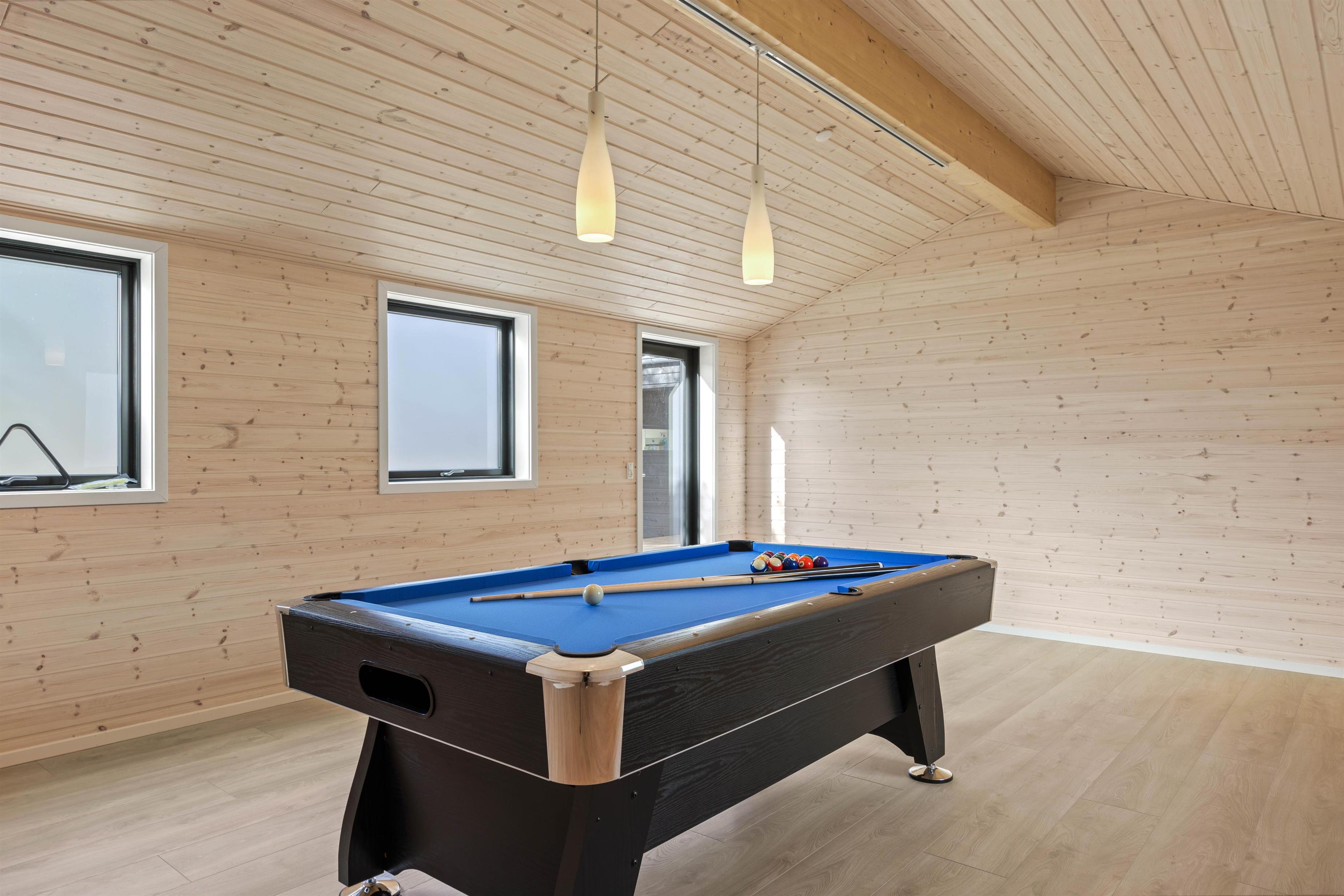 Sommerhuset er meget mere end blot et sted at overnatte – det er et sandt aktivitetscenter med faciliteter, der inspirerer til både leg og afslapning. Her kan I nyde en omgang bordtennis og poolbillard for at skabe sjove stunder med venner og familie. Udendørs finder I både en åben og en overdækket terrasse, komplet med gasgrill og komfortable havemøbler, så I med lethed kan tilberede mad og samle alle til hyggelige sommeraftener under den friske luft.