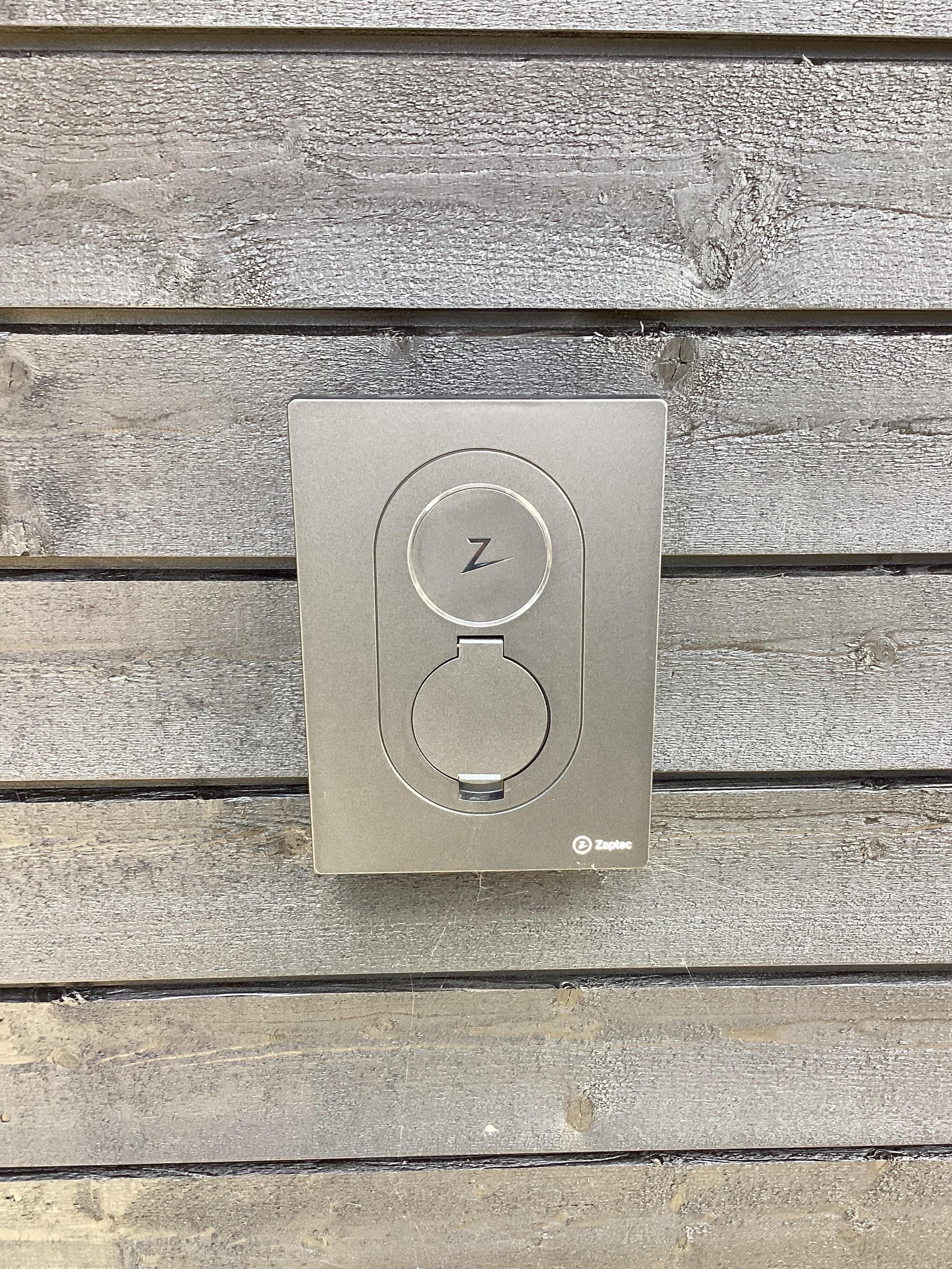 Der er desuden en ladestation til elbiler ved huset. Ladestationen er ZapTec uden fastmonteret kabel, og det er derfor nødvendigt selv at medbringe ladekabel.