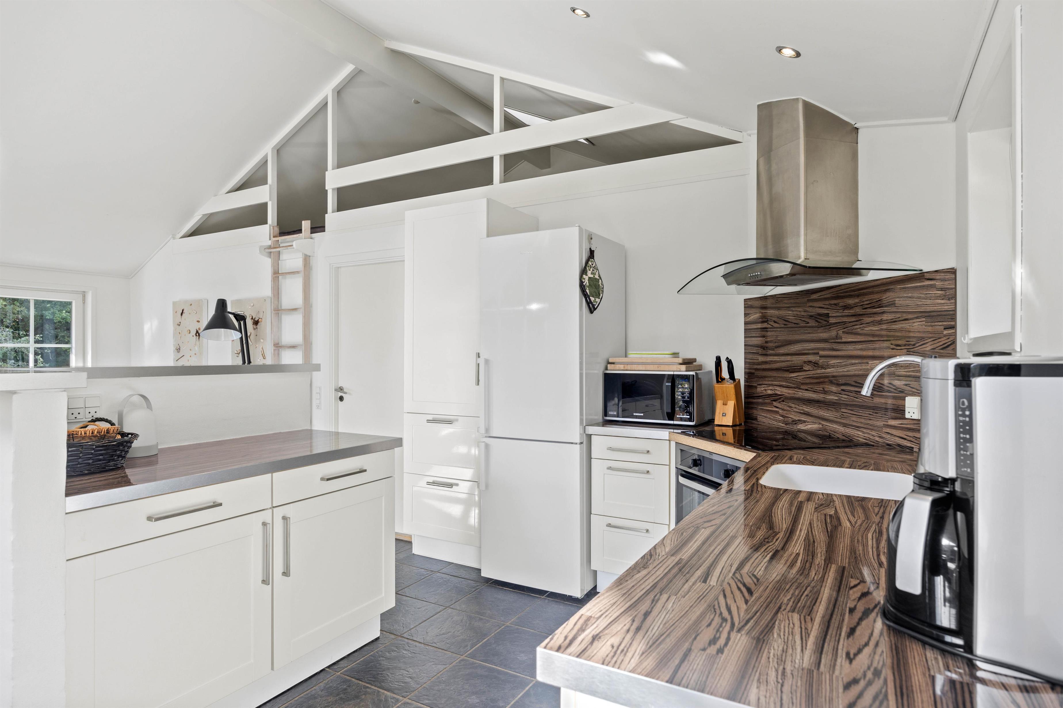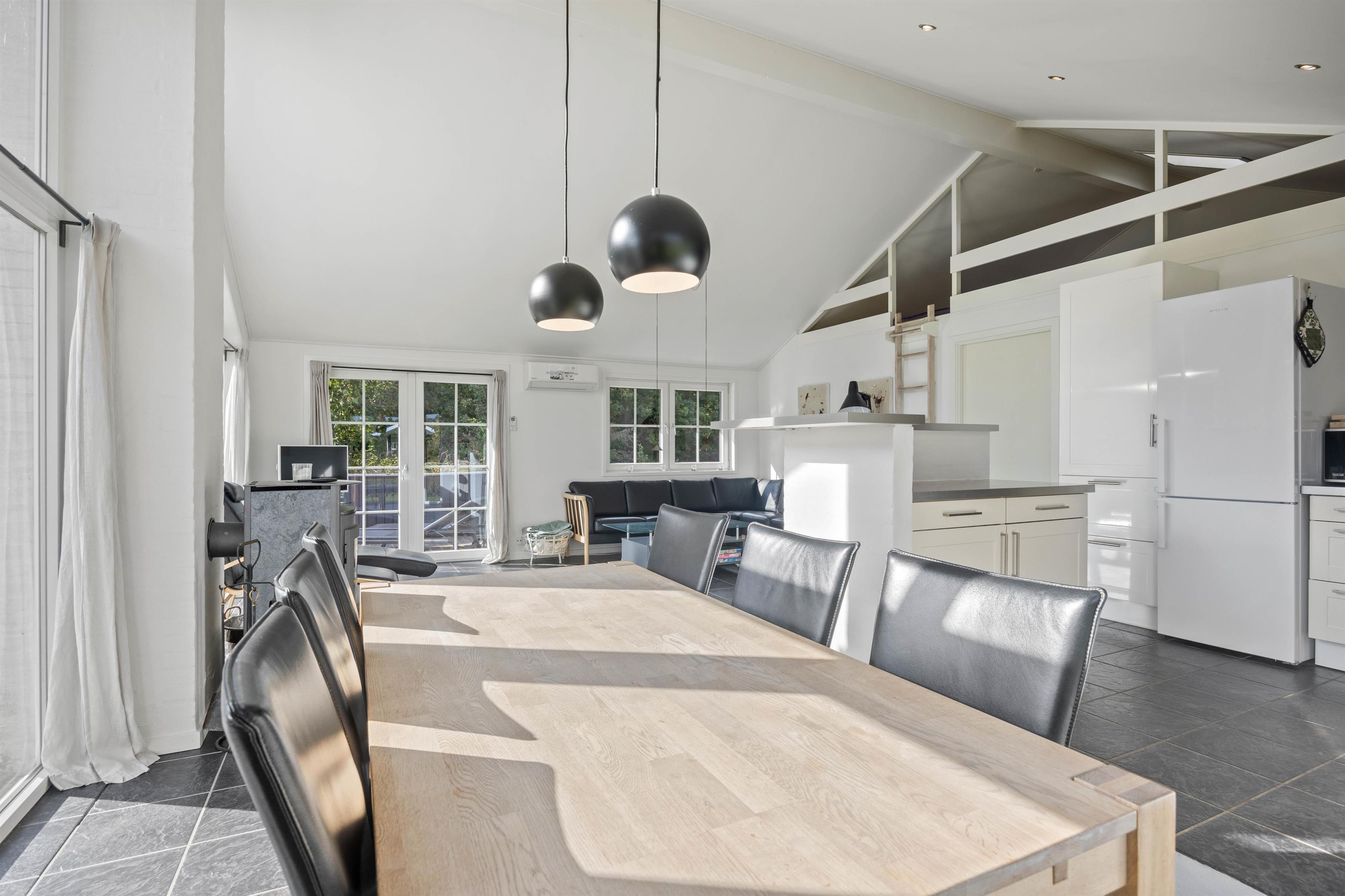 Sommerhusets hjerterum er det rummelige alrum, der forener stue, køkken og spiseområde i ét – sommerhusets centrale mødested, hvor der er plads til jer alle. Her er lyst, højt til loftet og ikke mindst en skøn udsigt. Her kan I dyste i brætspil omkring spisebordet, holde hyggelige filmaftener eller tilberede jeres yndlingsretter i det åbne køkken. På de køligere dage kan I tænde op i brændeovnen, der spreder hygge.