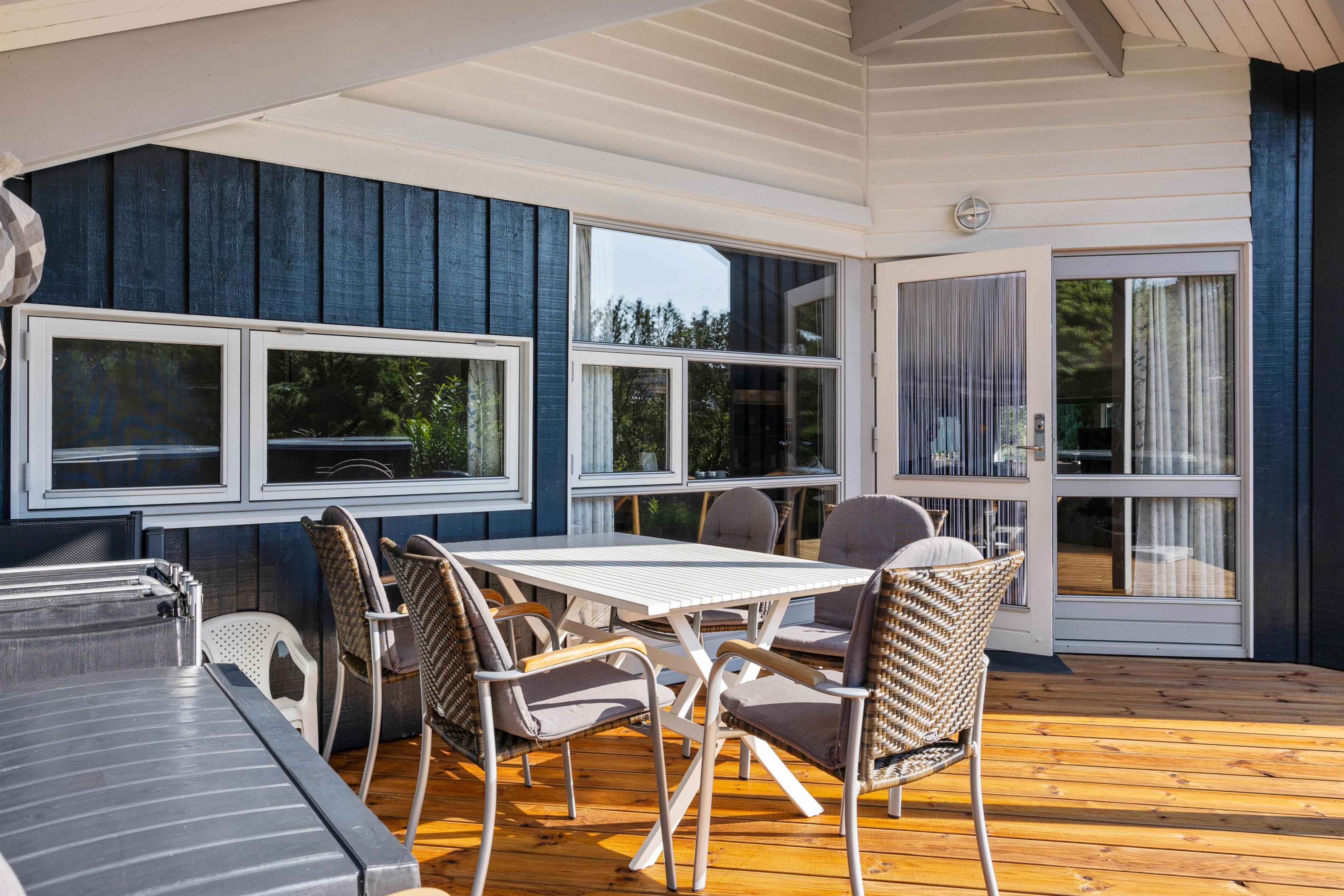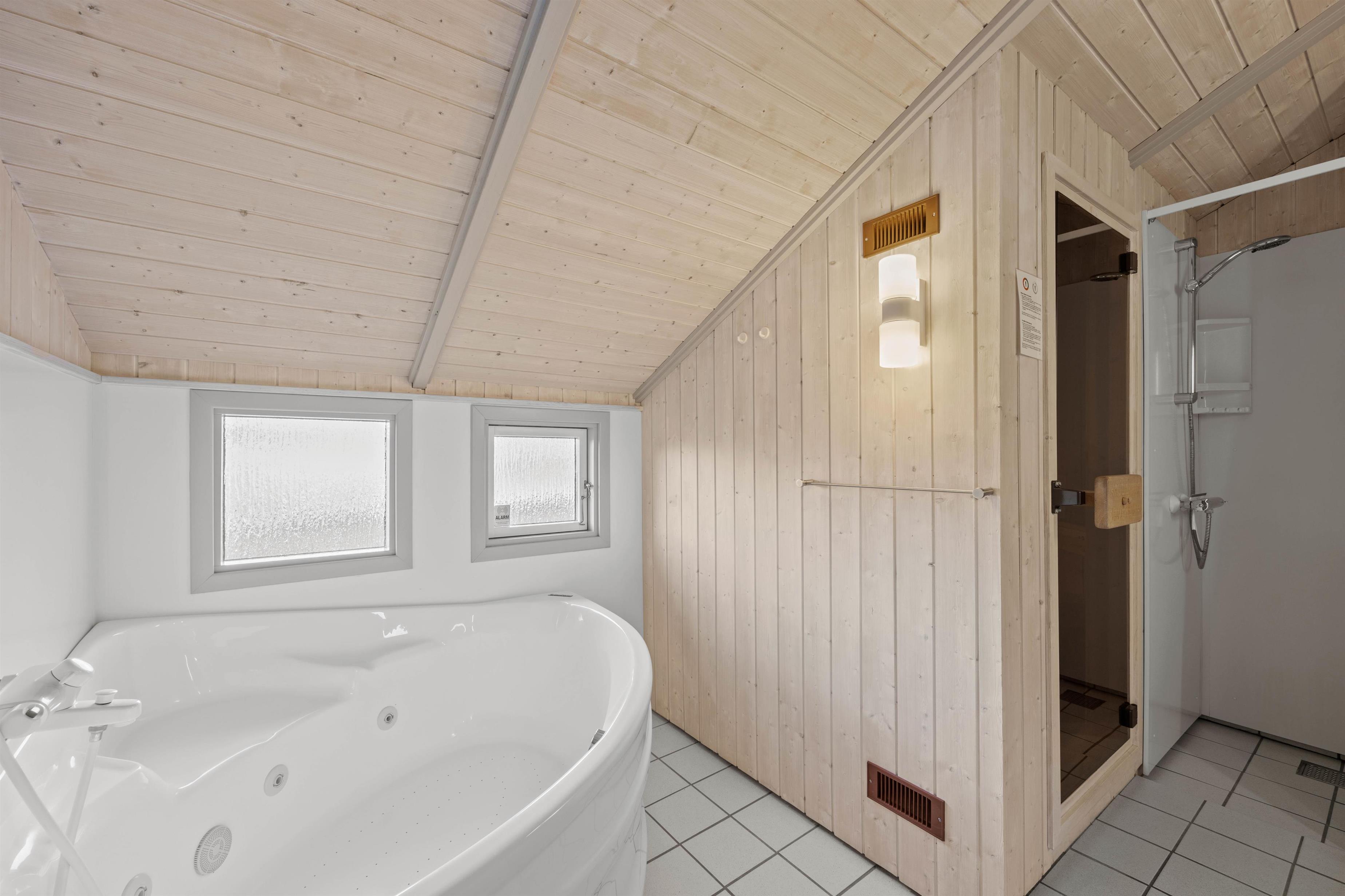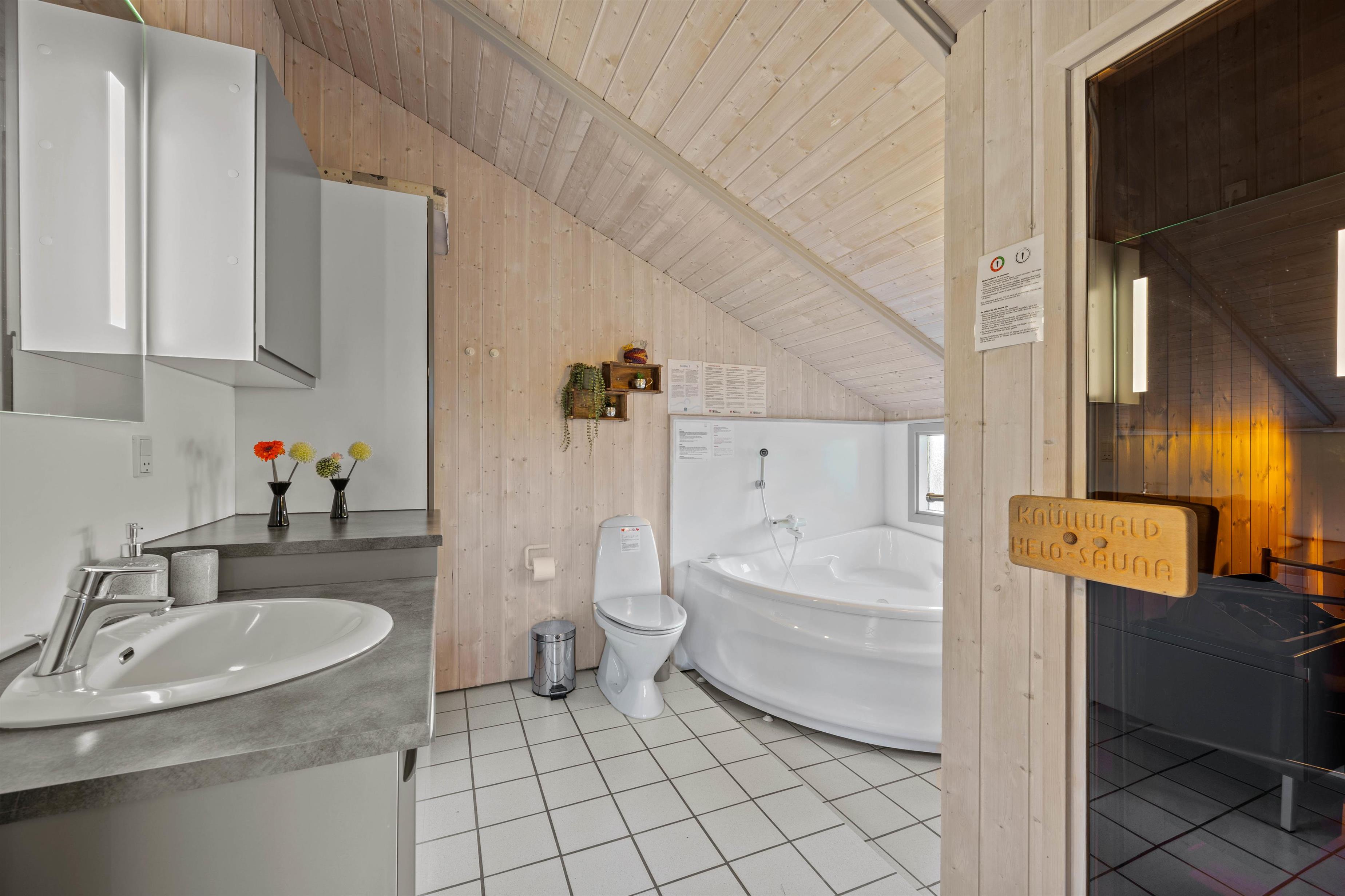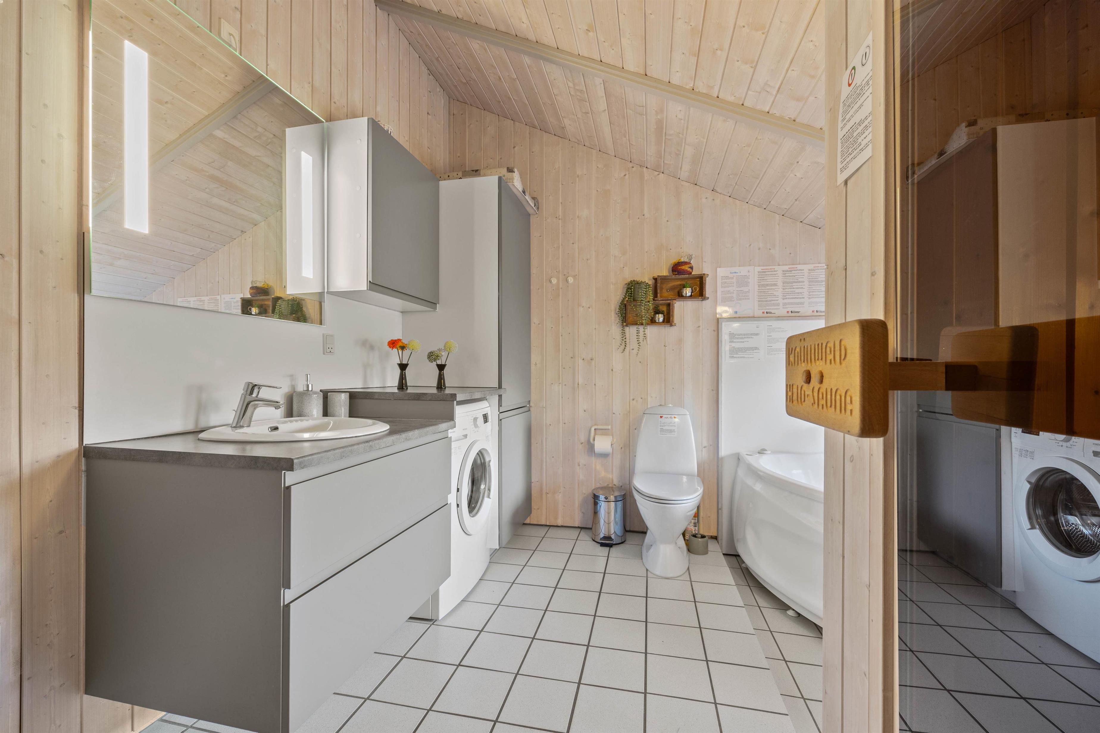 Sommerhusets rummelige badeværelse har gulvvarme, og her finder I også både spabad og sauna. Det boblende vand i spaen og varmen i saunaen er helt perfekt til afslapning og velvære efter en oplevelsesrig feriedag. På badeværelset har I desuden en vaskemaskine til jeres rådighed, hvis det skulle blive nødvendigt med en smule tøjvask.