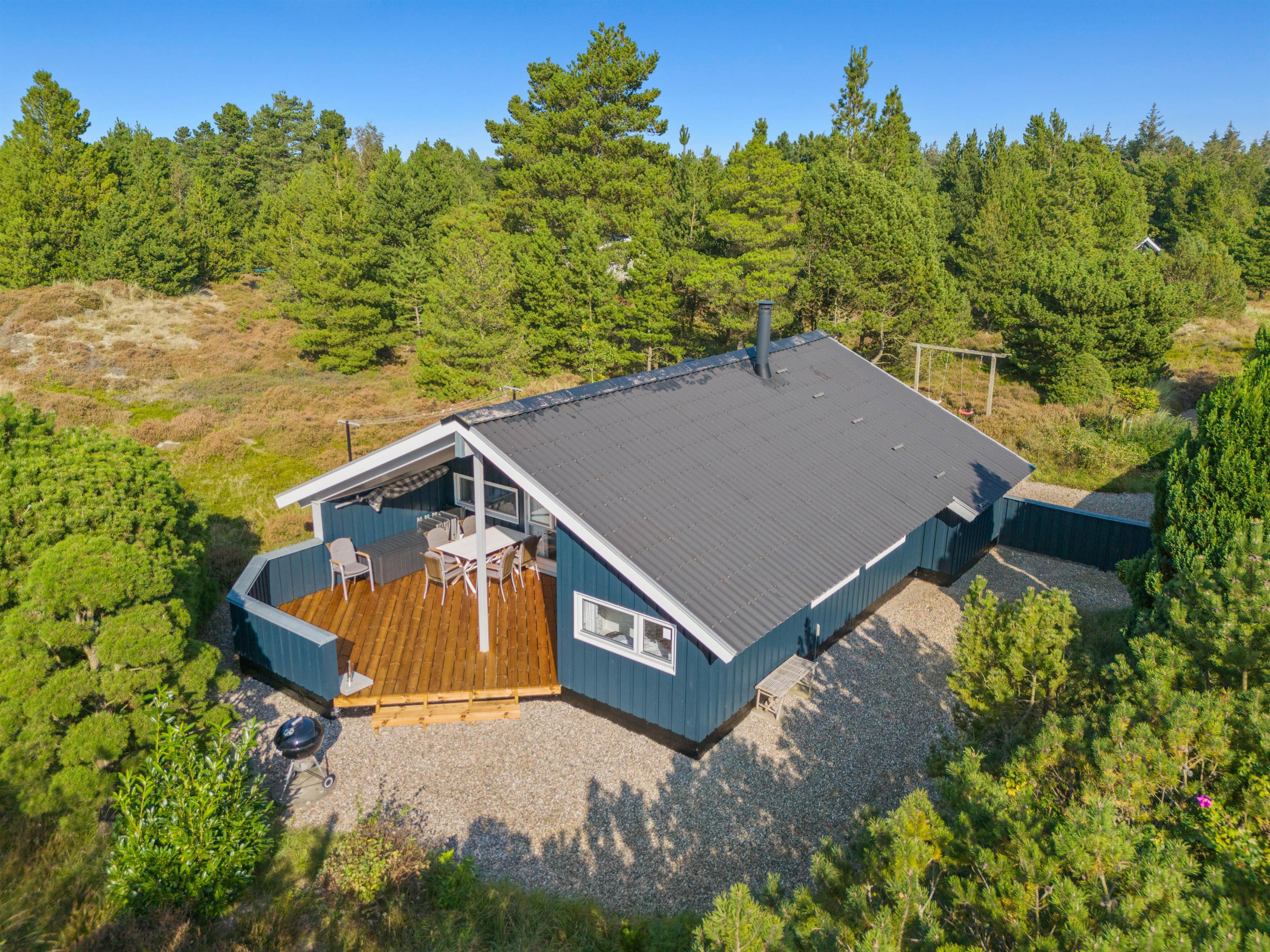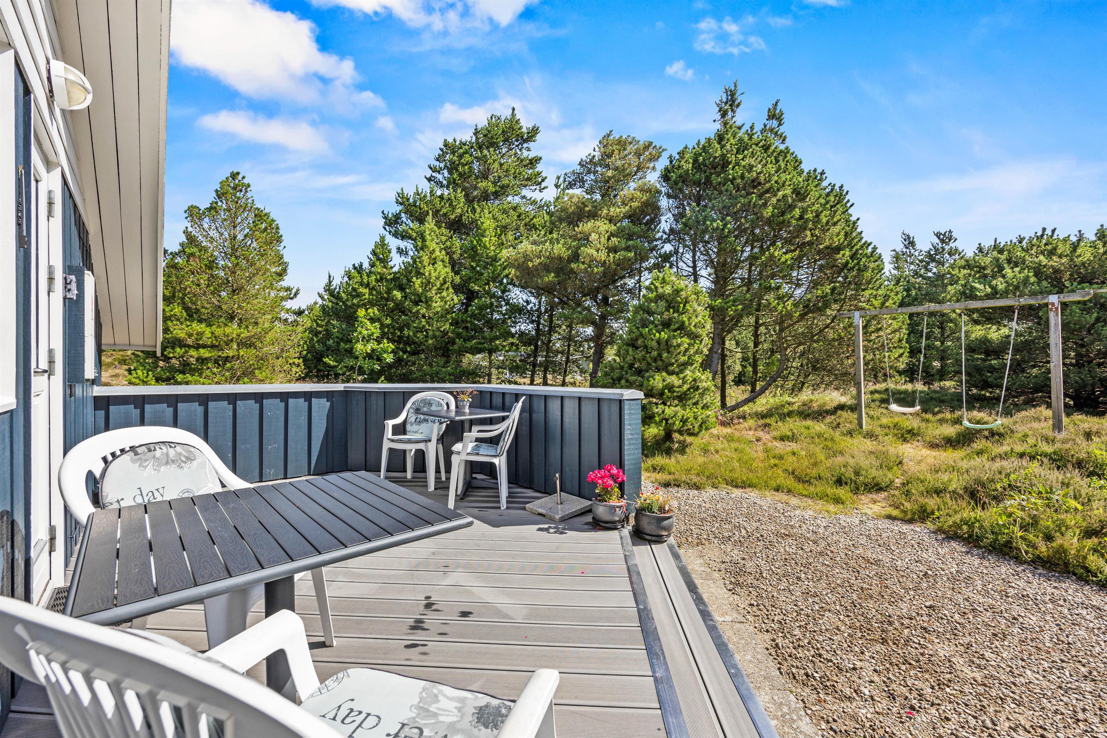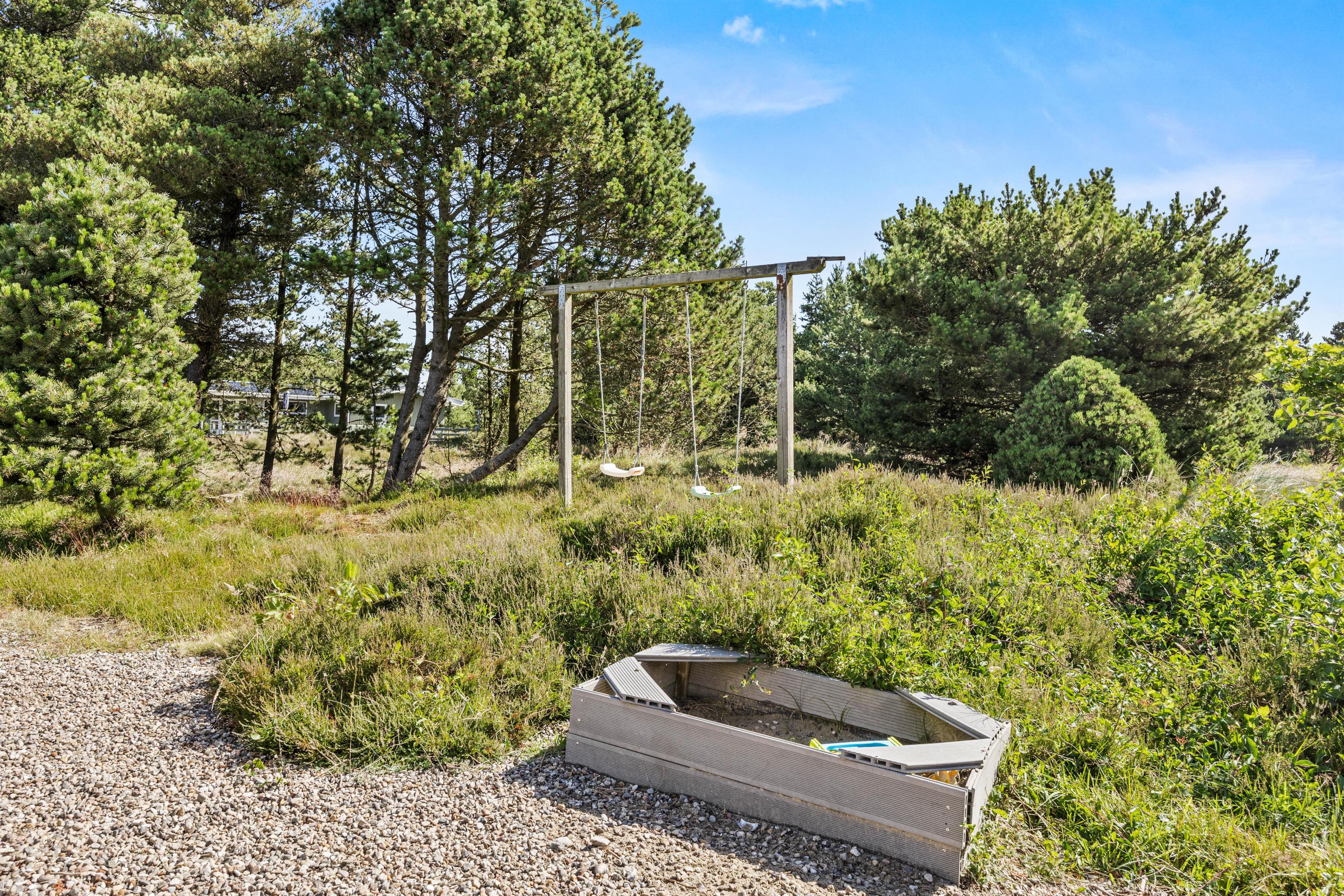 Til aften kan I lave et lækkert måltid med saftige bøffer på sommerhusets tilhørende grill, mens børnene leger på naturgrunden. Her er både sandkasse og gyngestativ til familiens yngste.