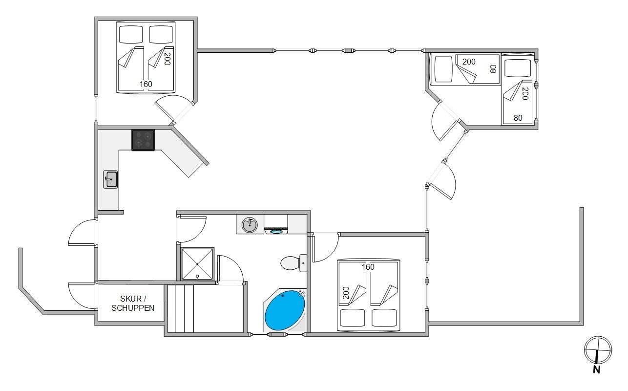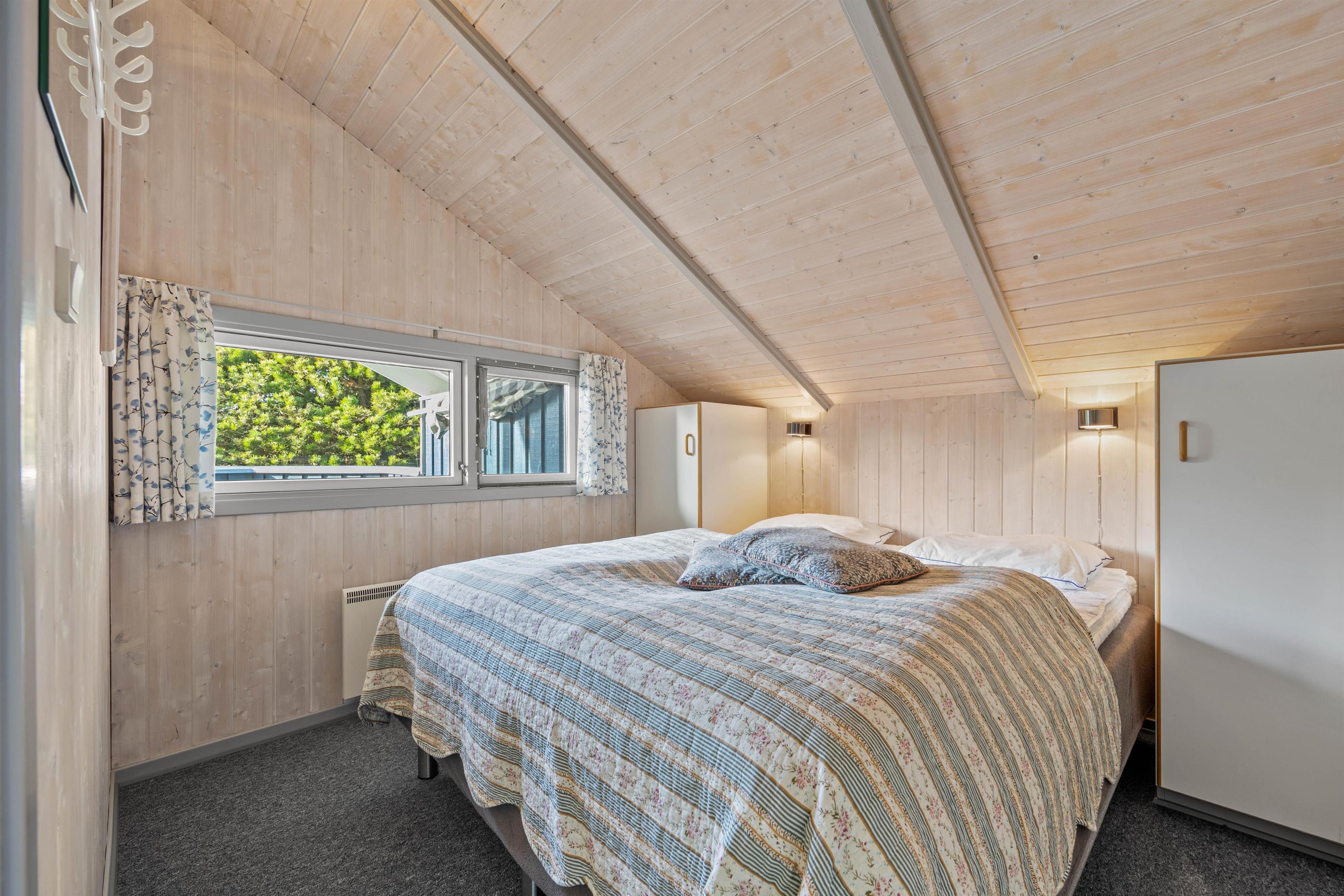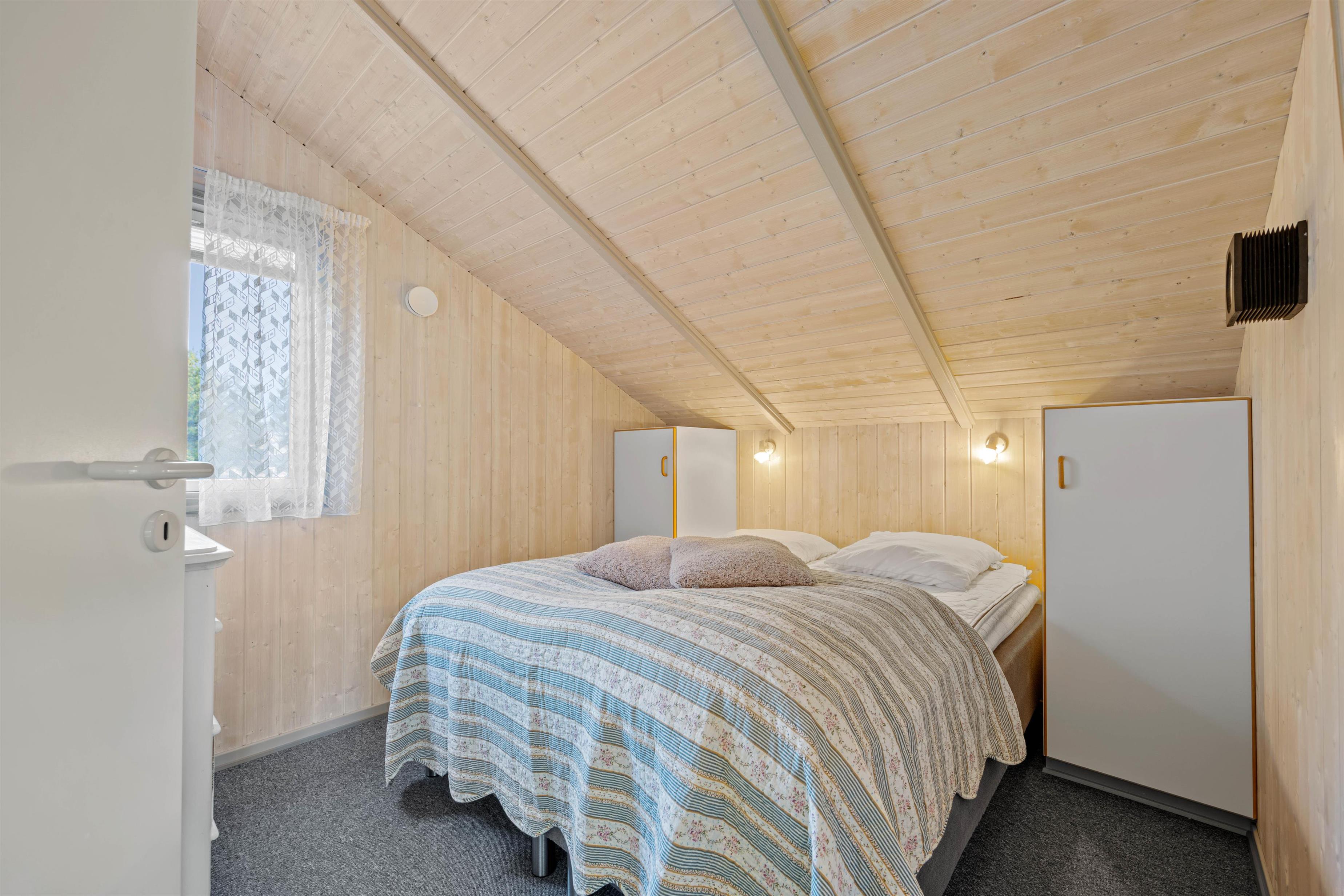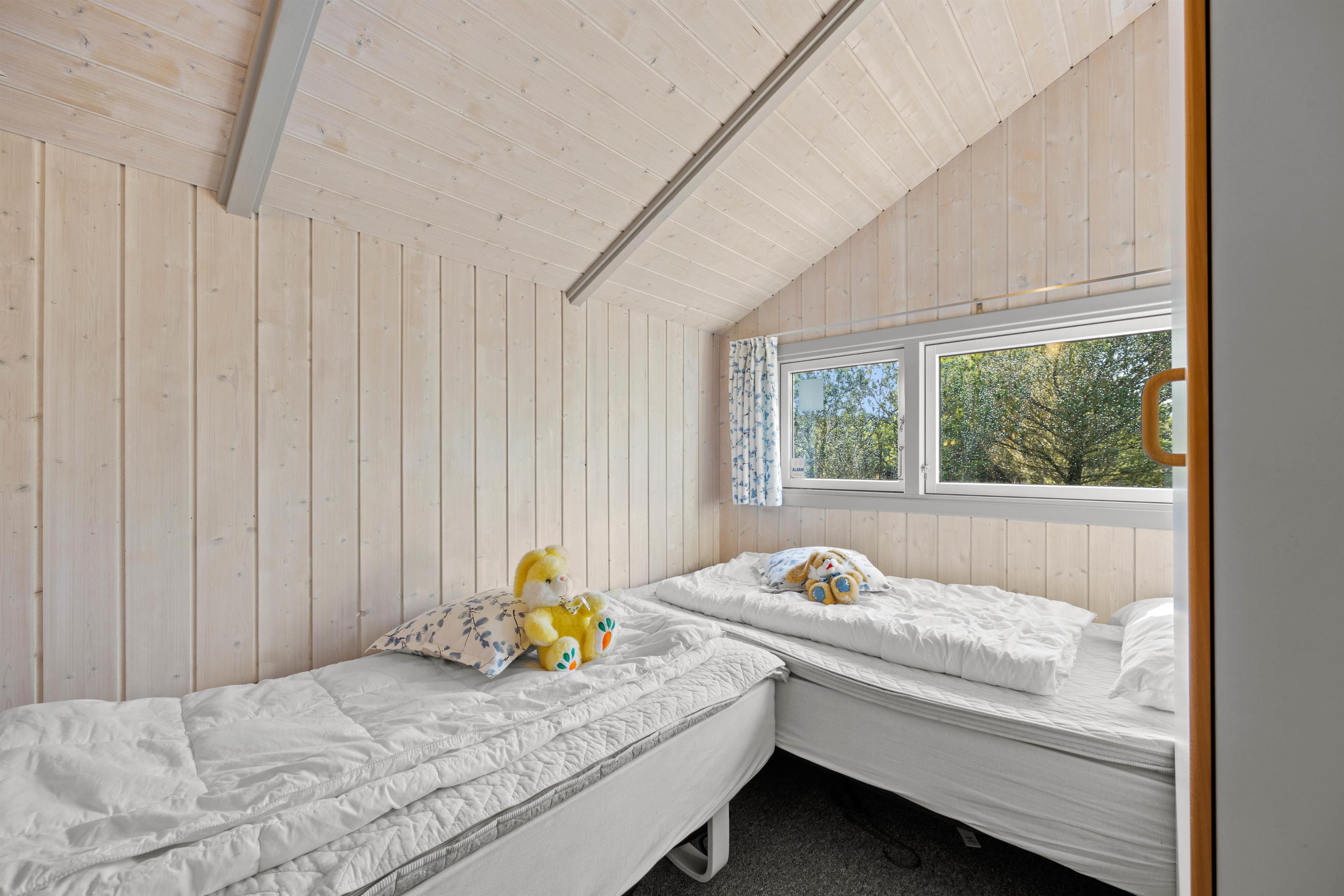 Sommerhusets 6 sovepladser fordeler sig på 3 værelser, hvoraf der er 2 med dobbeltseng på 160 cm. Det sidste værelse er indrettet med 2 enkeltsenge.