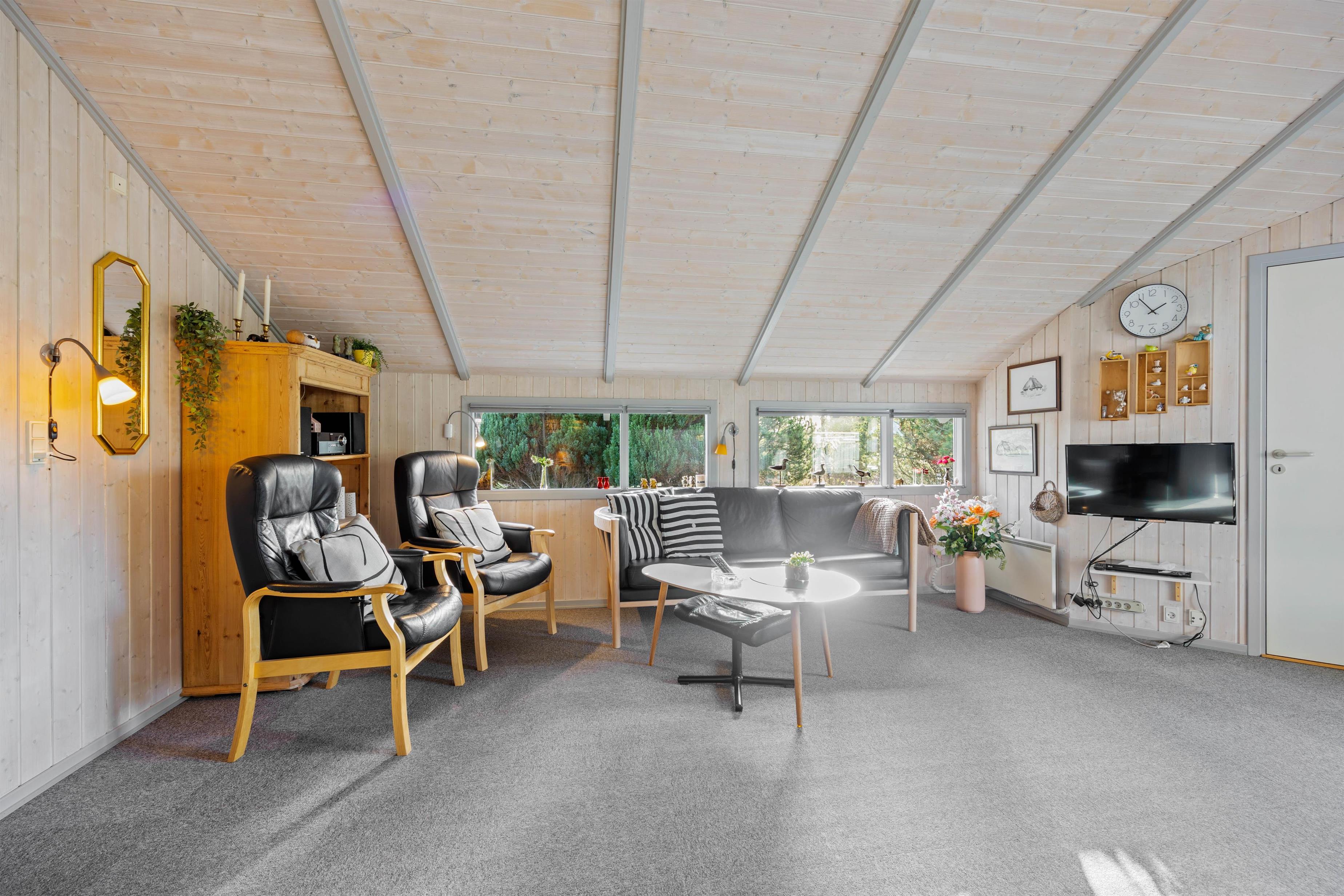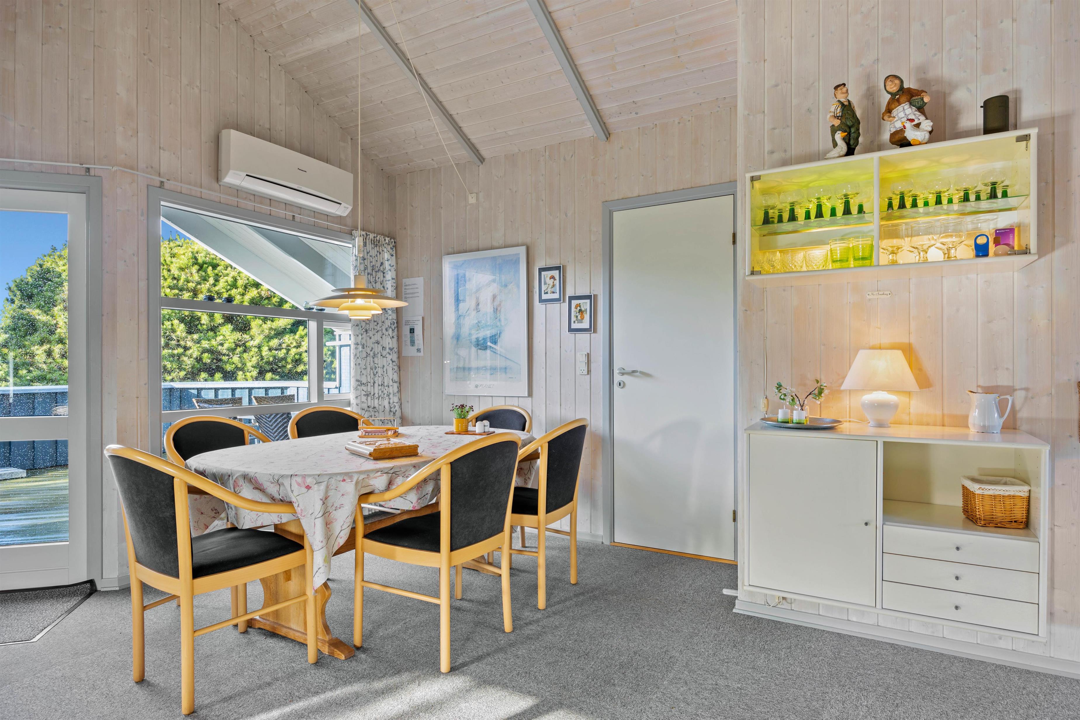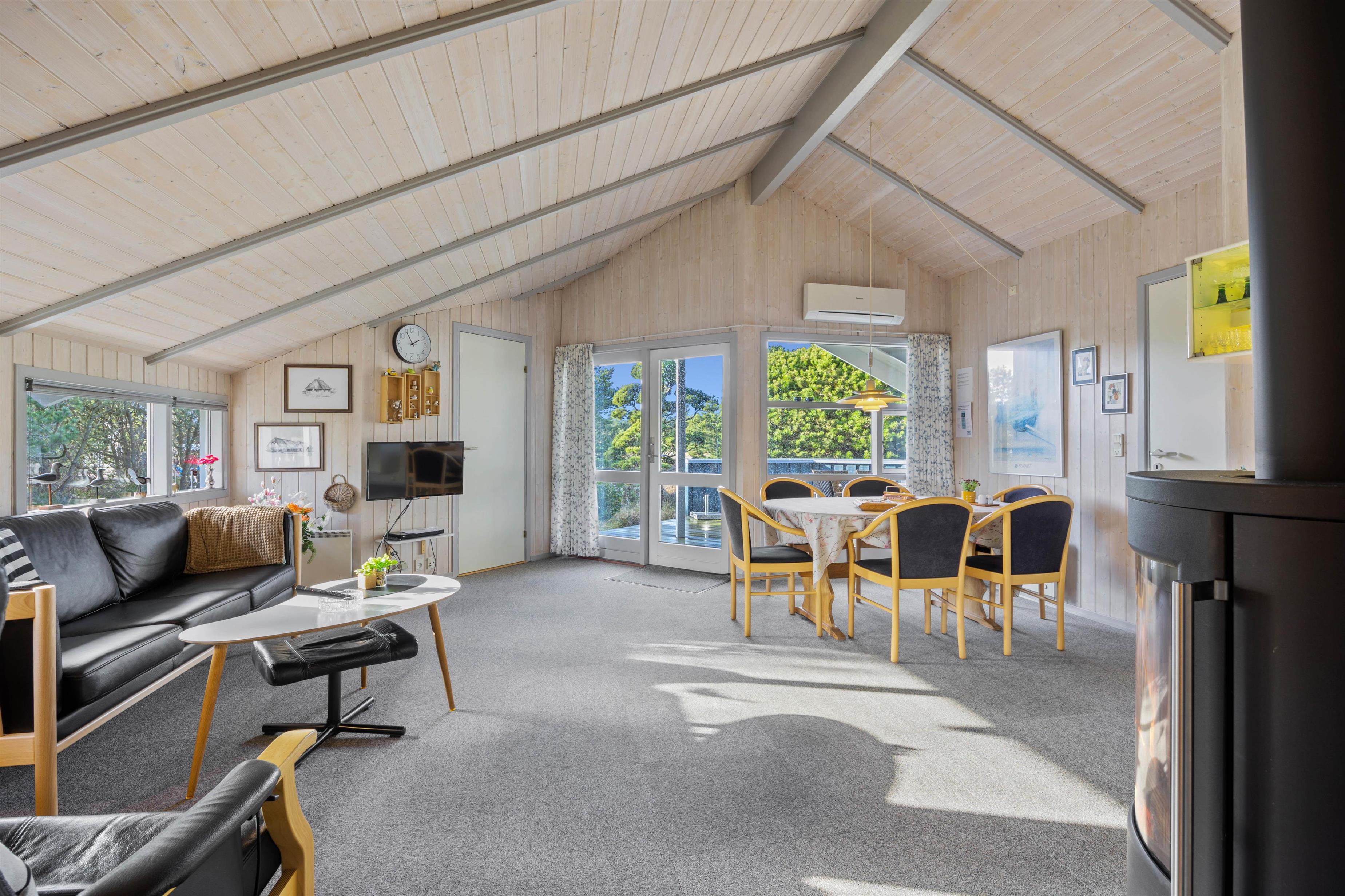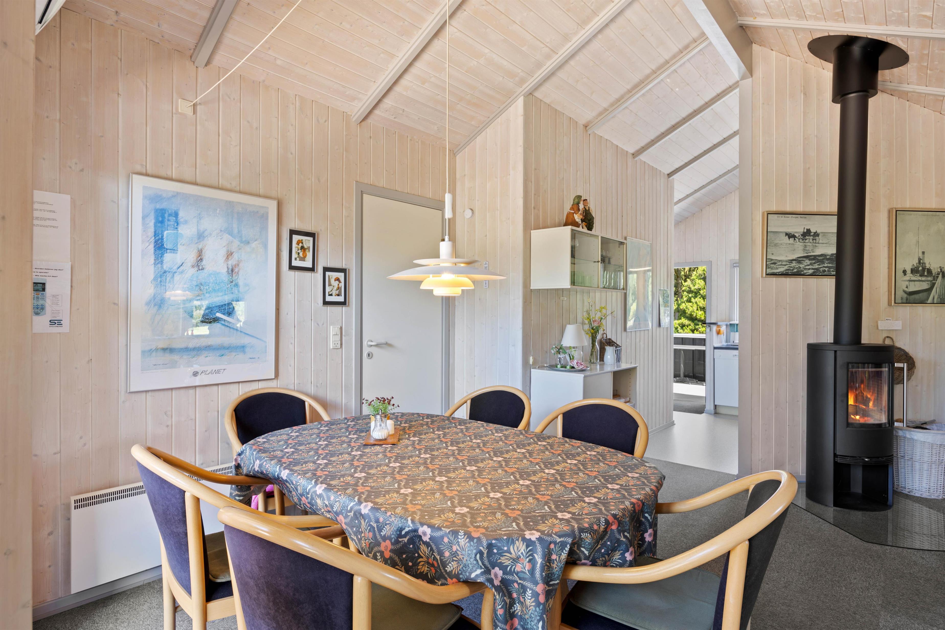 Når I holder ferie i dette hyggelige sommerhus, kan familien samles til mange gode stunder i alrummet, der består af køkken, spiseplads og stue i ét. Efter aftensmaden kan I tænde op i brændeovnen, sætte jer godt til rette i sofaen og spille et spil kort, mens brændeovnen knitrer i baggrunden - Det er ægte feriestemning. Sommerhuset har også en varmepumpe, som I kan bruge til at holde en behagelig temperatur i rummet.