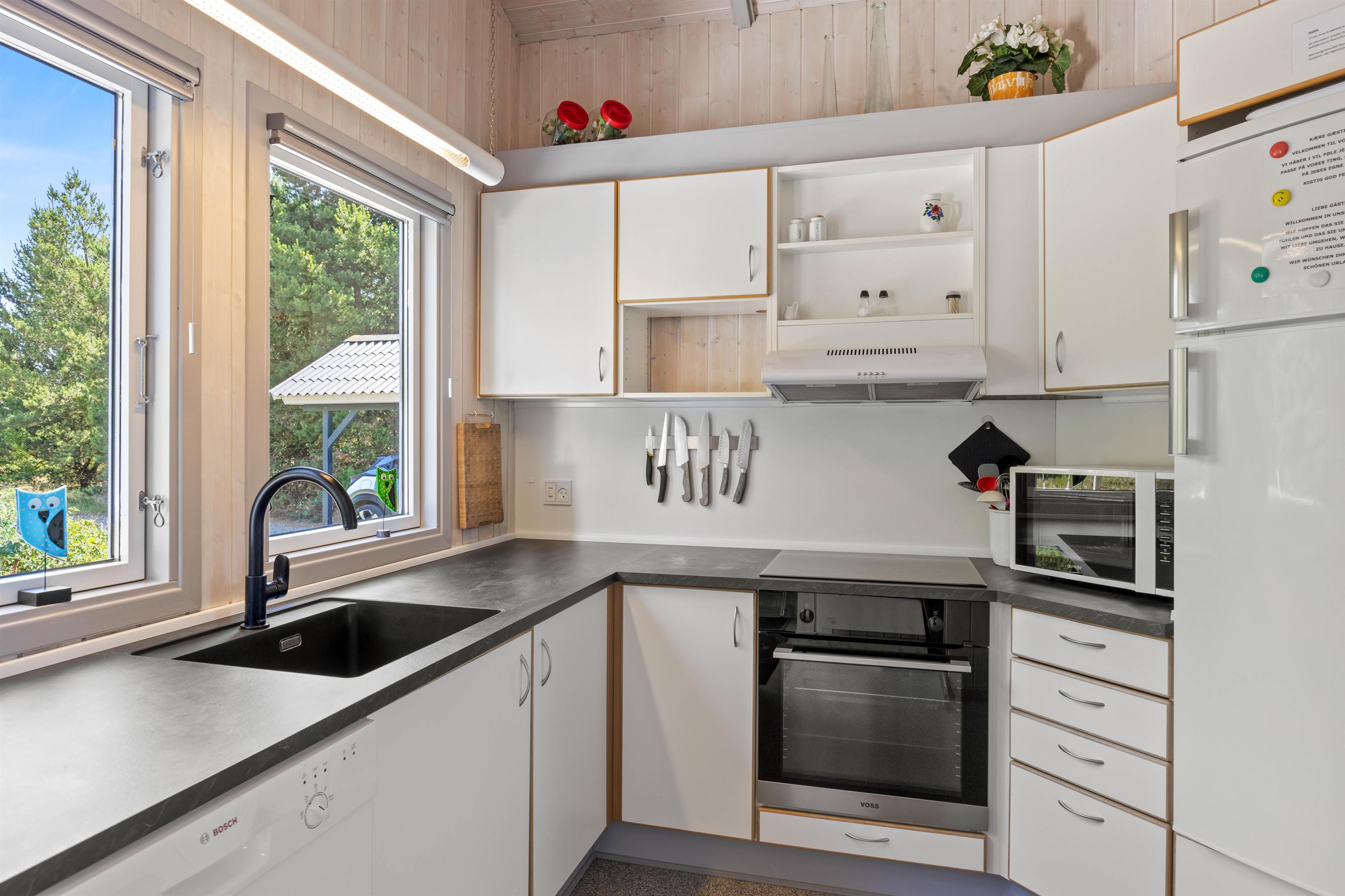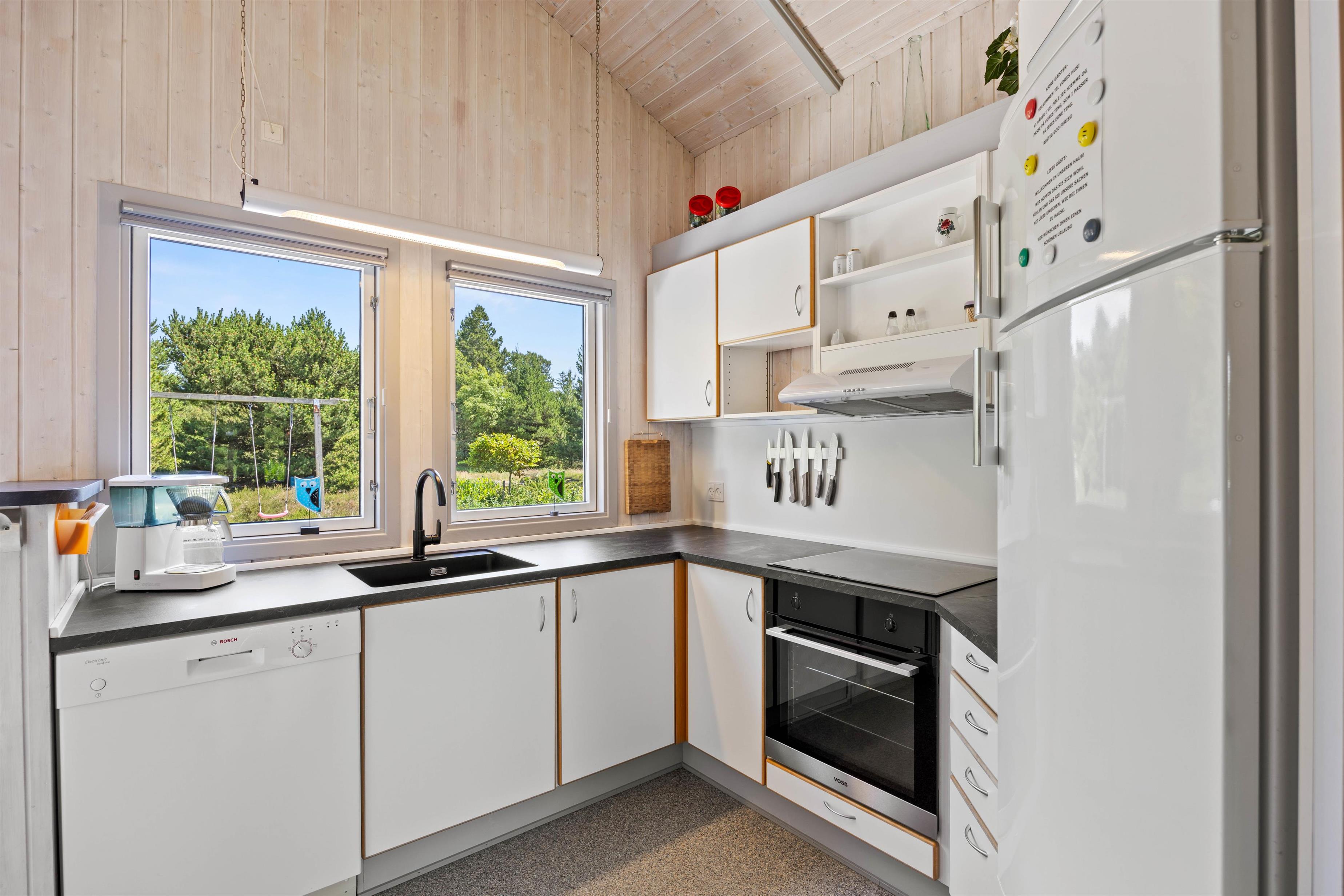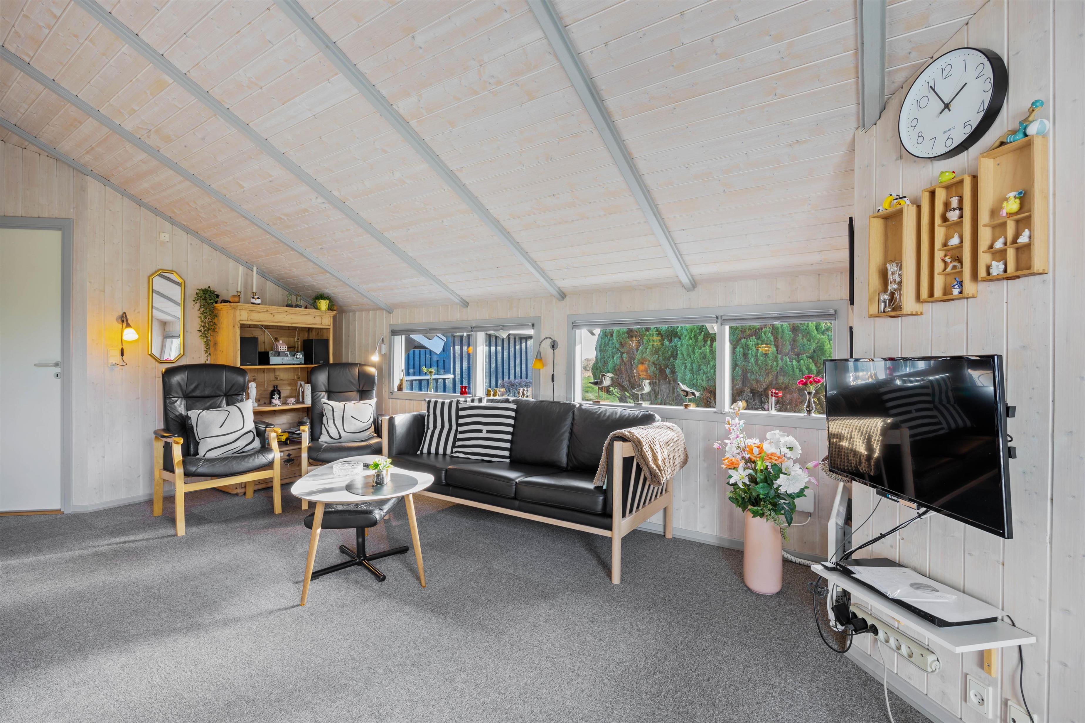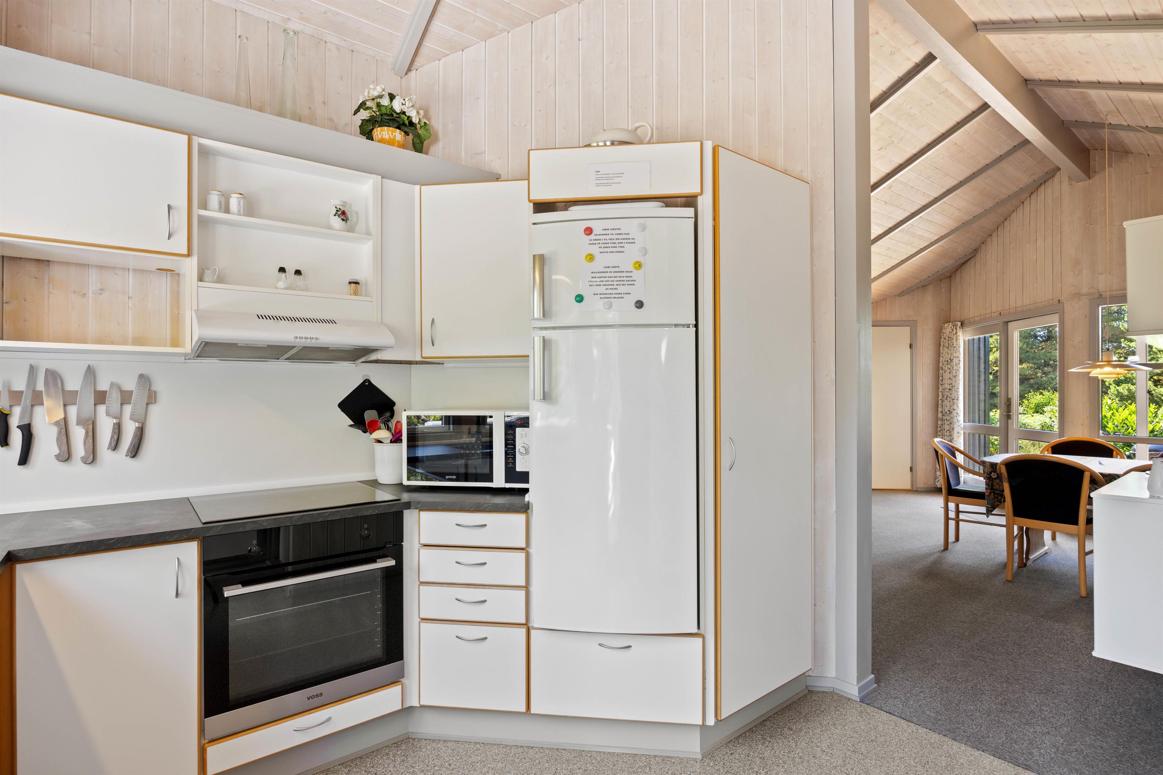 Når I holder ferie i dette hyggelige sommerhus, kan familien samles til mange gode stunder i alrummet, der består af køkken, spiseplads og stue i ét. Efter aftensmaden kan I tænde op i brændeovnen, sætte jer godt til rette i sofaen og spille et spil kort, mens brændeovnen knitrer i baggrunden - Det er ægte feriestemning. Sommerhuset har også en varmepumpe, som I kan bruge til at holde en behagelig temperatur i rummet.