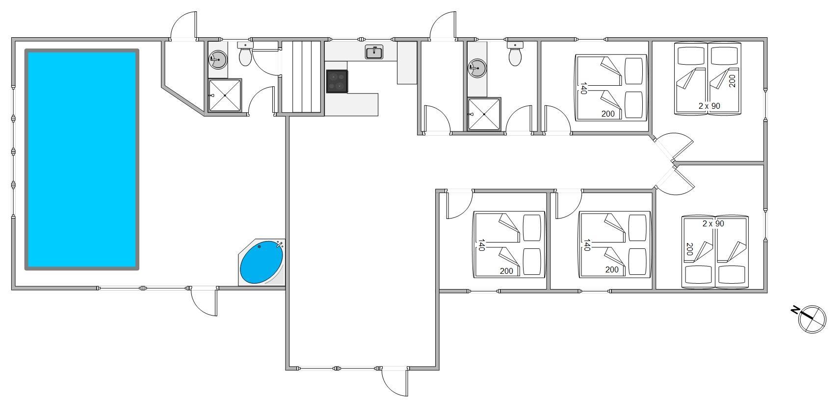 De 3 af feriehusets 5 soveværelser byder på 140cm dobbeltsenge samt 2 soveværelser med hver 2 senge med 90cm bredde. Disse sørger for en god nattesøvn, så I får ladet jeres batterier op til den næste dags aktiviteter.