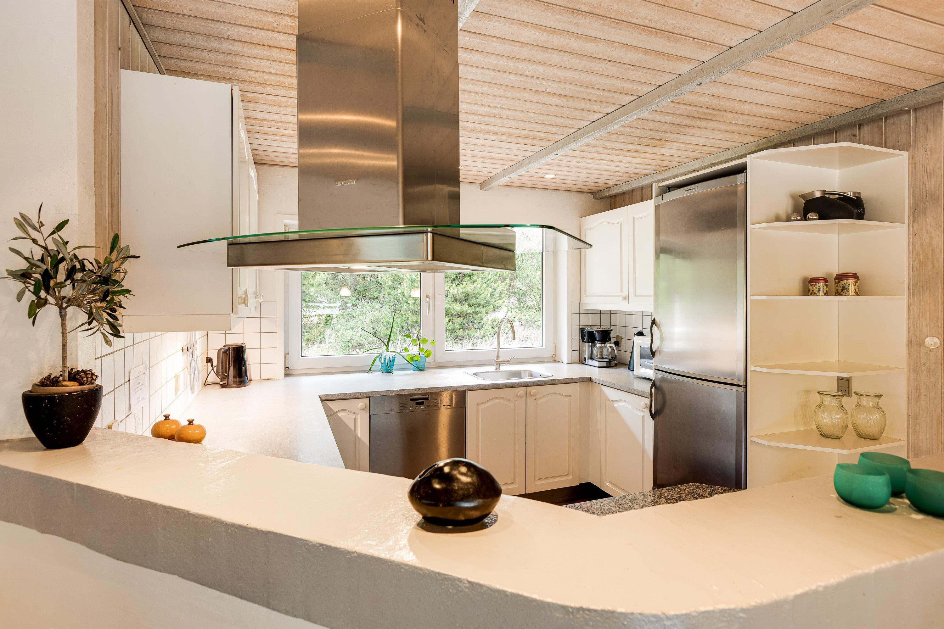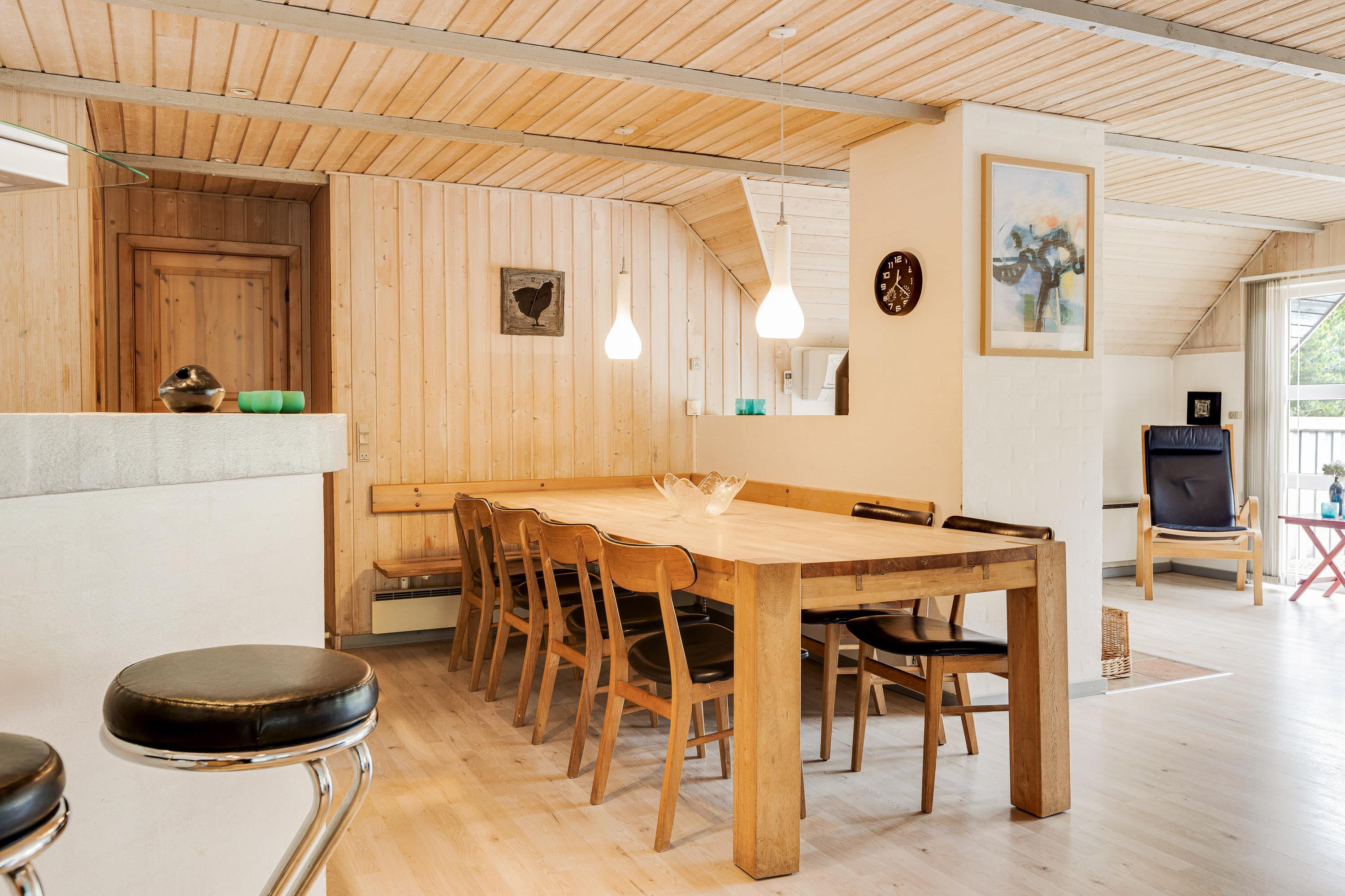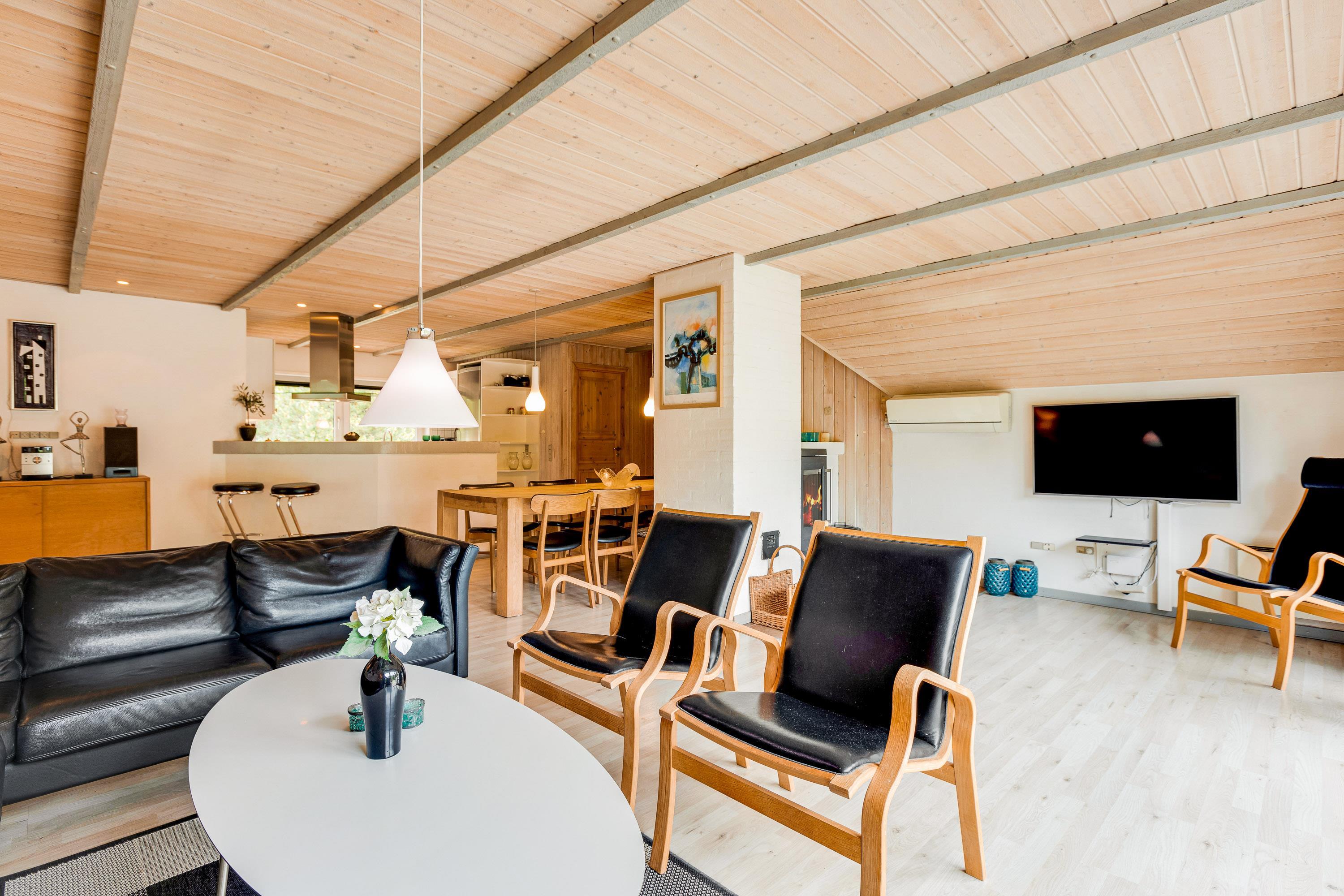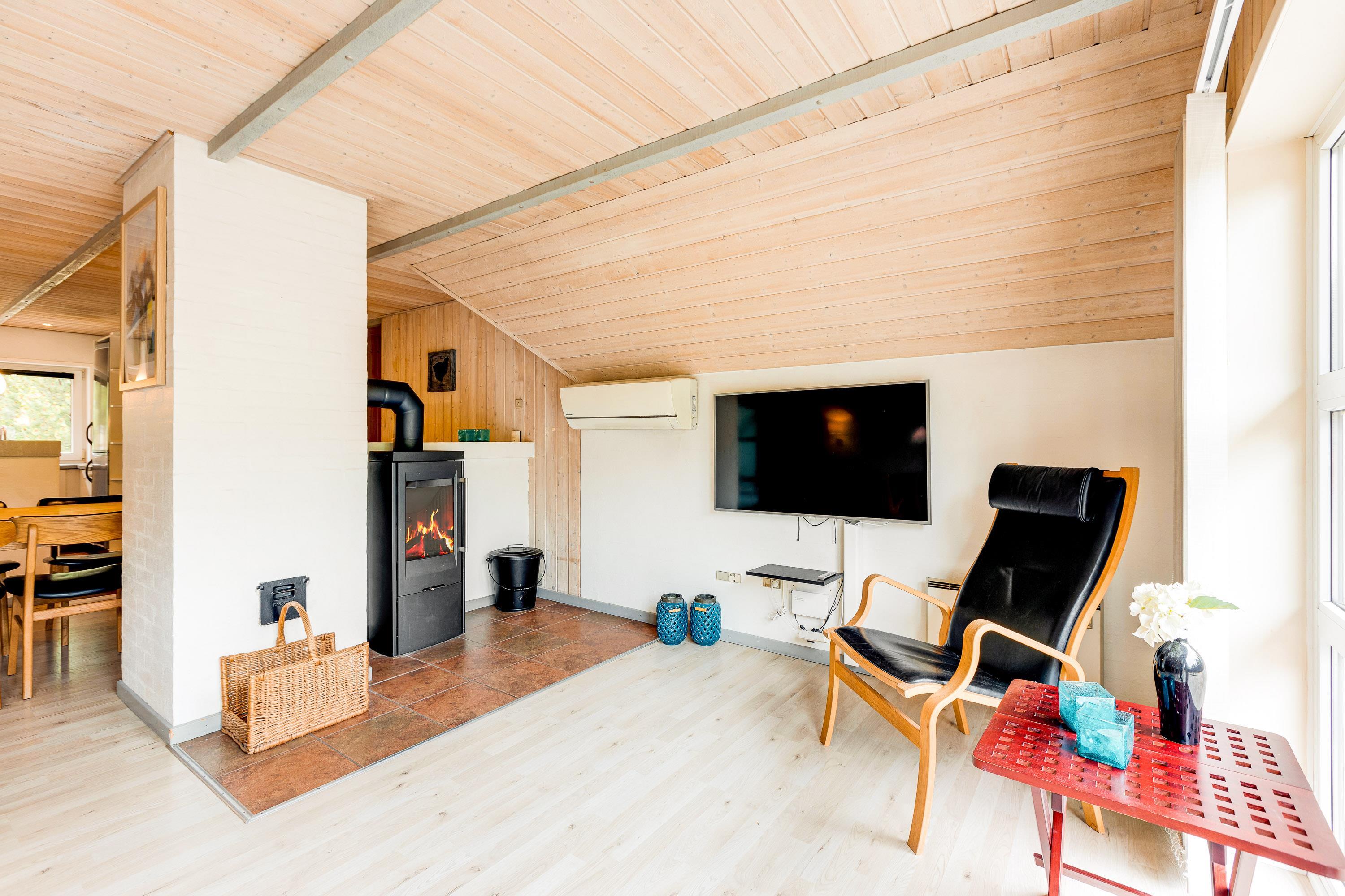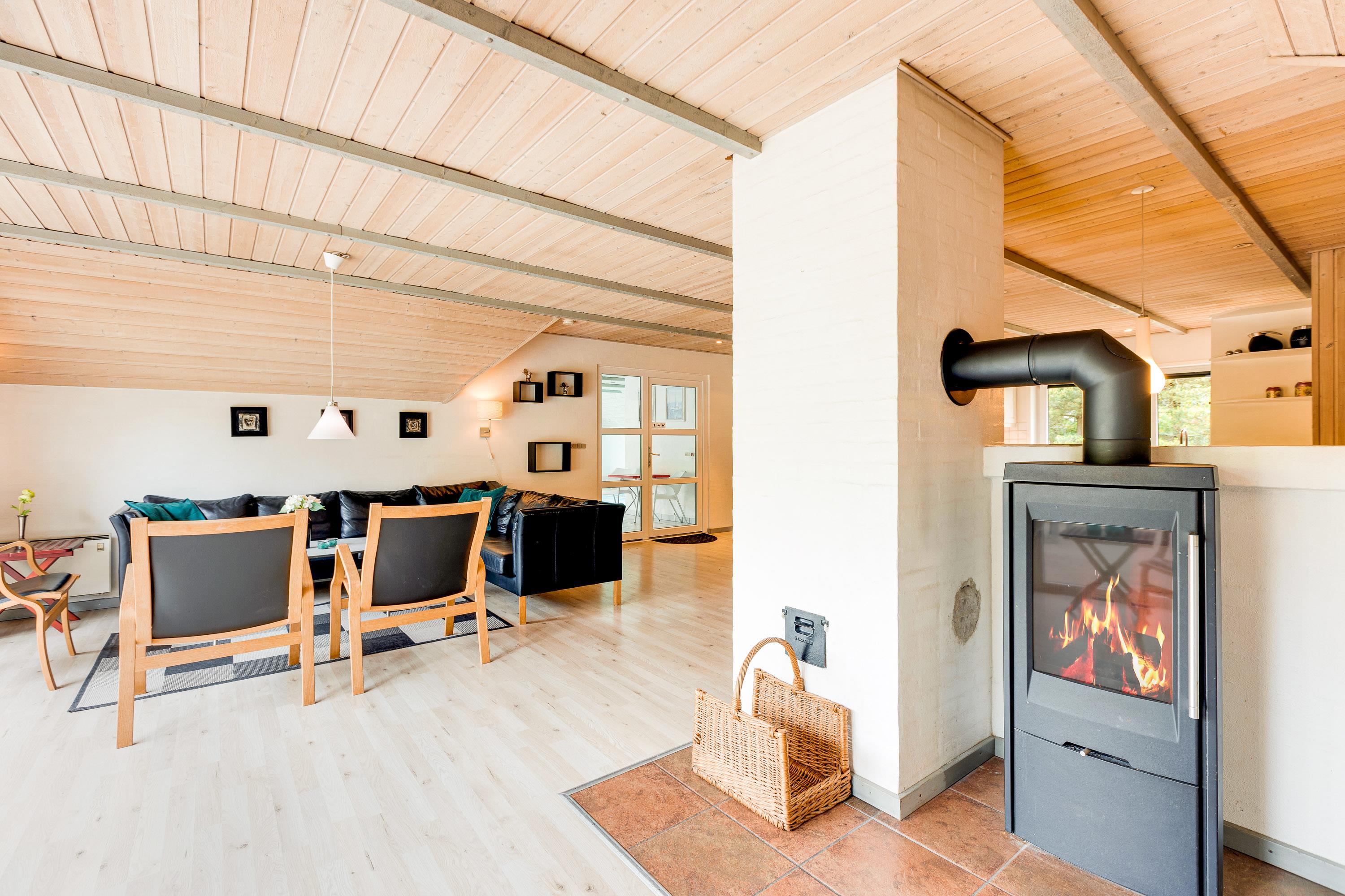 Stueområdet med den store hjørnesofa samt flere lænestole ligger i åben forbindelse til spisebordet og det åbne køkken der indbyder til fælles madlavning, afslappende aftener på sofaen med den nye krimi og underholdende spilleaftener med hele familien - imens brændeovnen omfavner jer med en behagelige varme og byder på de knitrende lyde. Ved behov kan den energibesparende varmepumpe tændes.
