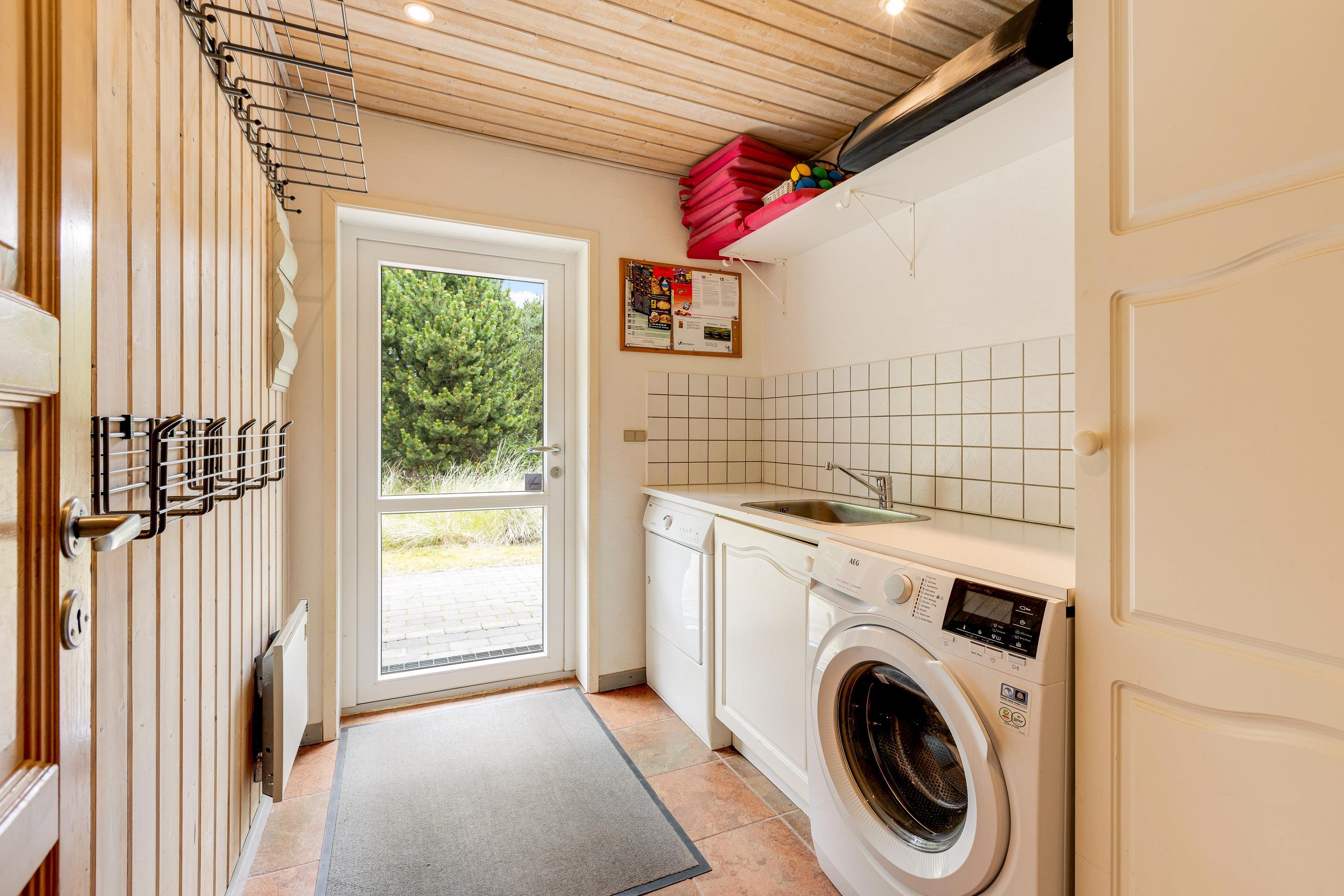 Der er 2 badeværelser med bruser til rådighed, hvoraf det ene ligger i forbindelse med poolområdet. Vaskemaskine og tørretumbler sørger for rene håndklæder til den næste badeture eller en tur i saunaen.