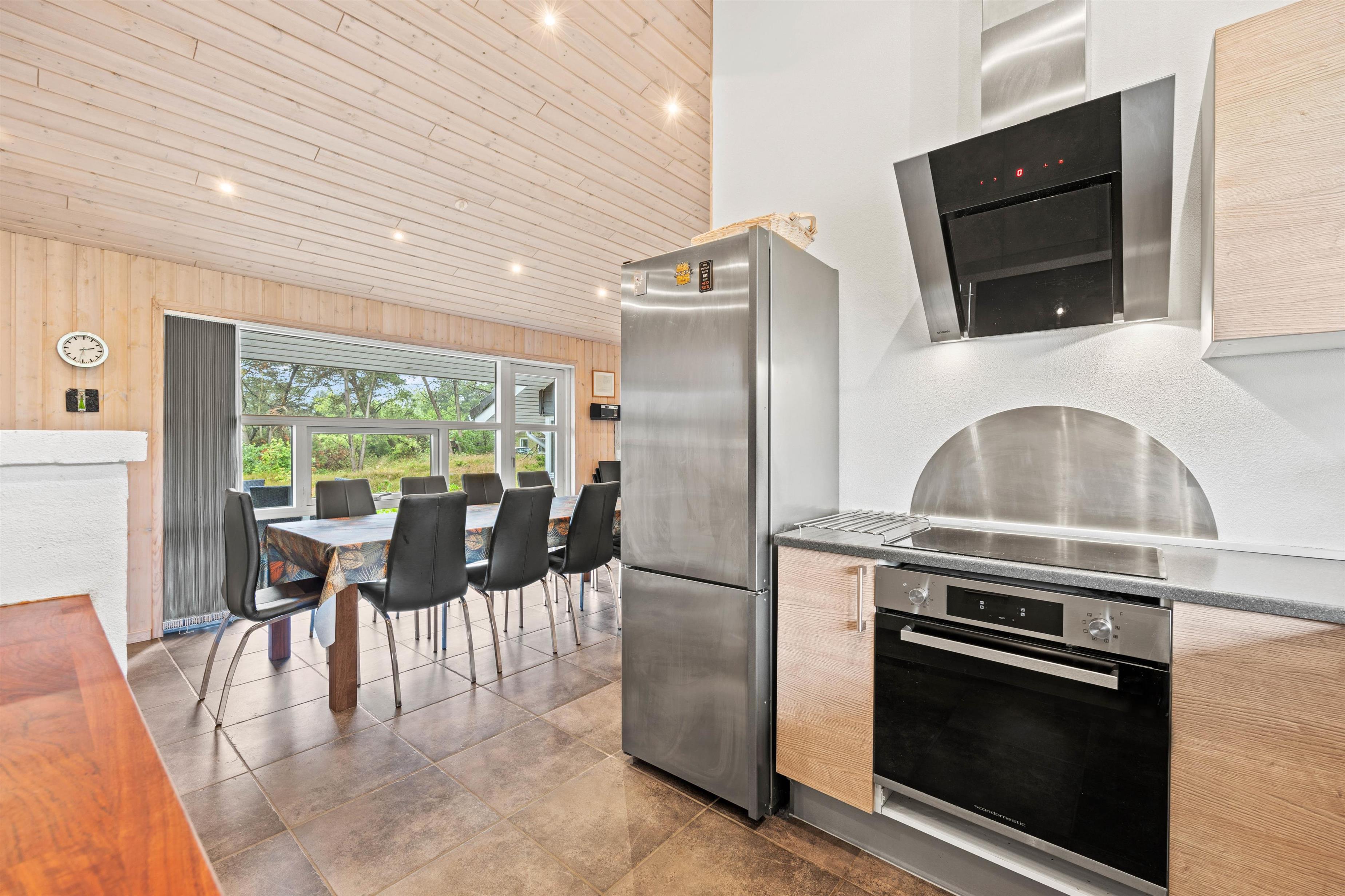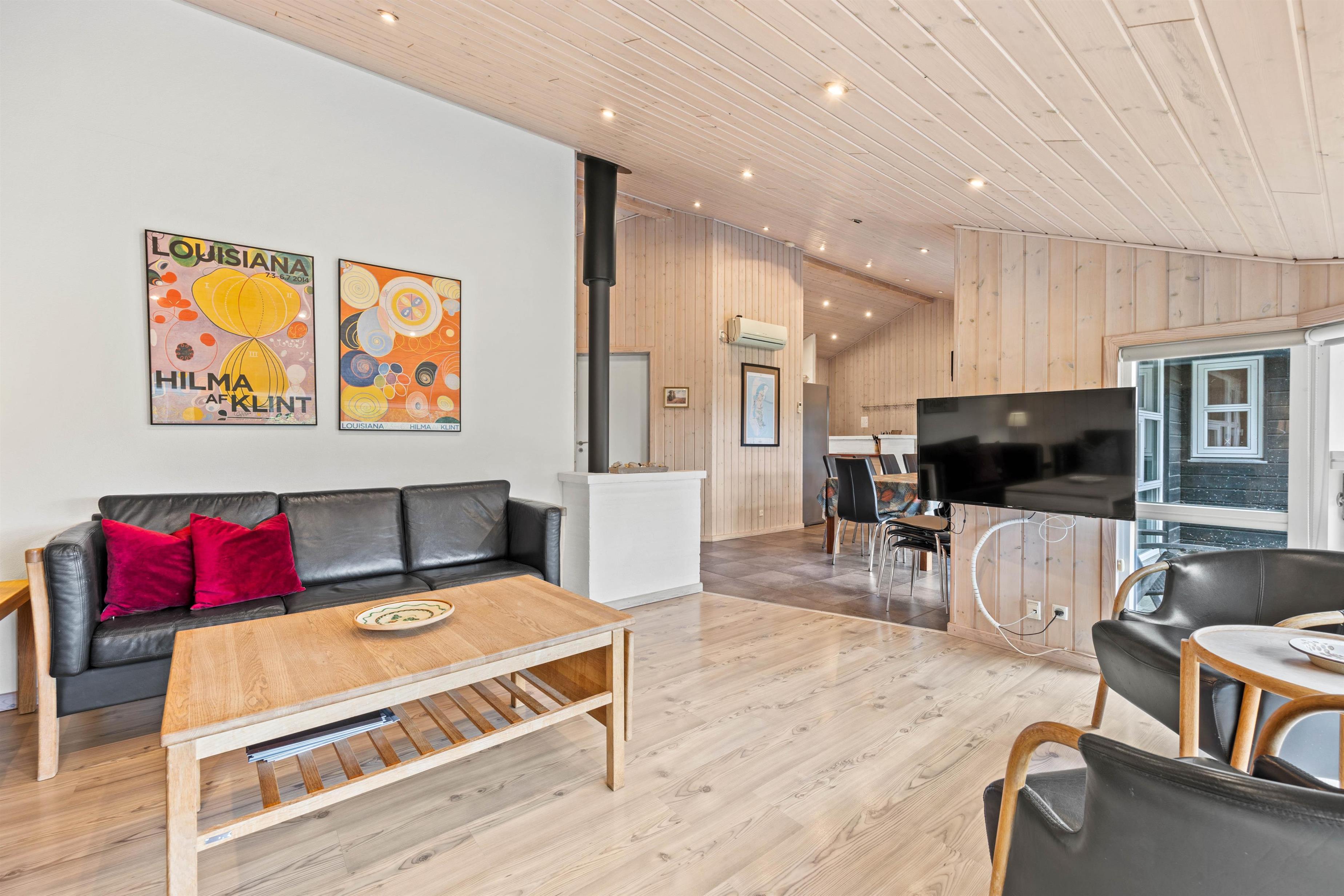 Sommerhusets vigtigste rum er det lyse alrum, der forener stue, køkken og spiseområde i ét – sommerhusets centrale mødested, hvor der er plads til jer alle! Her er lyst, indrettet med komfortable møbler og ikke mindst en skøn udsigt. Her kan I dyste i brætspil omkring spisebordet, holde hyggelige filmaftner eller tilberede jeres yndlingsretter i det åbne køkken. På de køligere dage kan I tænde op i brændeovnen, der spreder hygge!