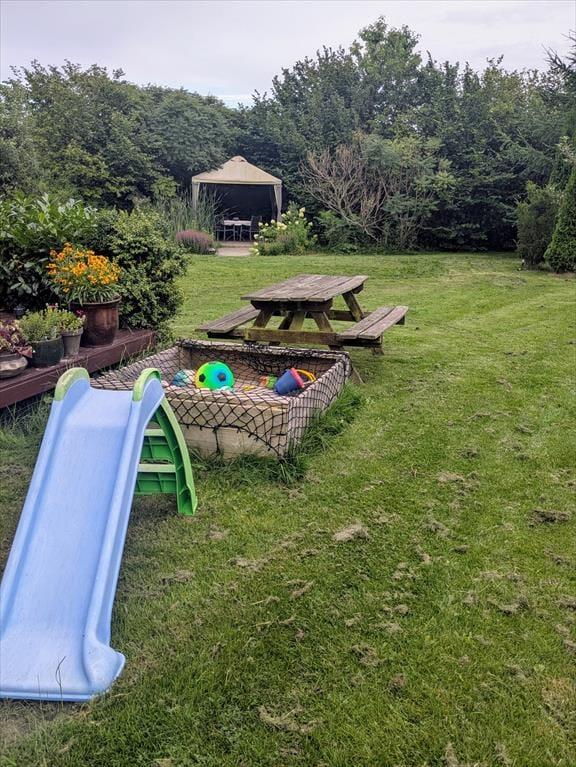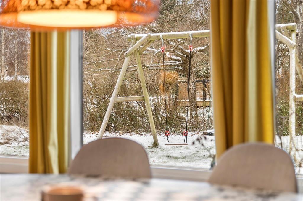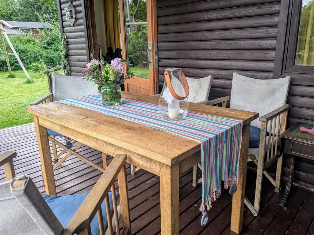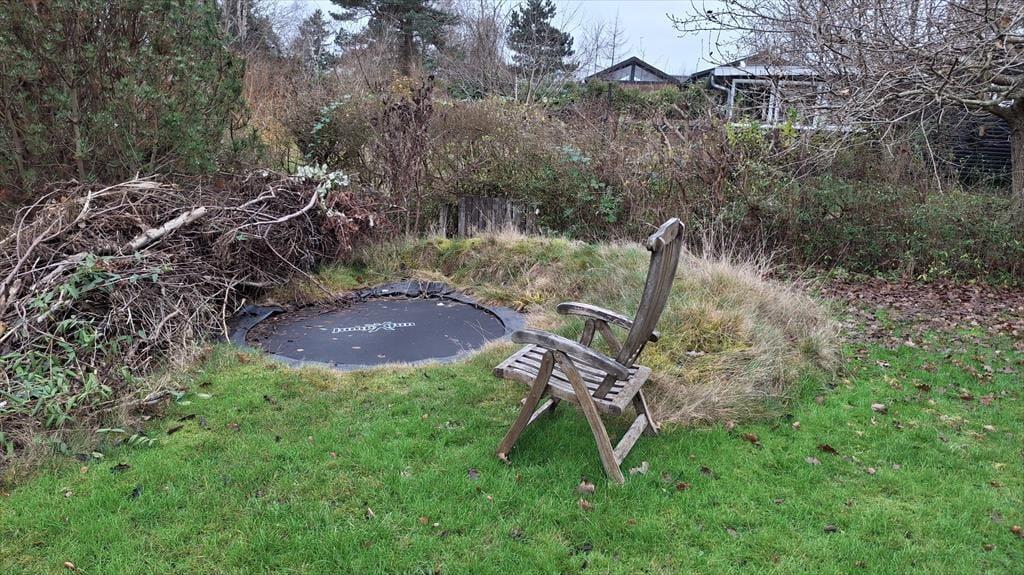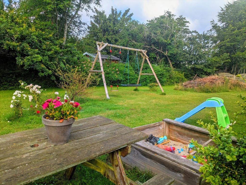 I træder fra stuen ud på den overdækkede terrasse hvor man nyder de tilberedte måltiden, sidder og hygger med en kop kaffe alt mens børnene lejer i haven, der er trampolin, gyngestativ mm. her er rigelig plads til spil for hele familien.