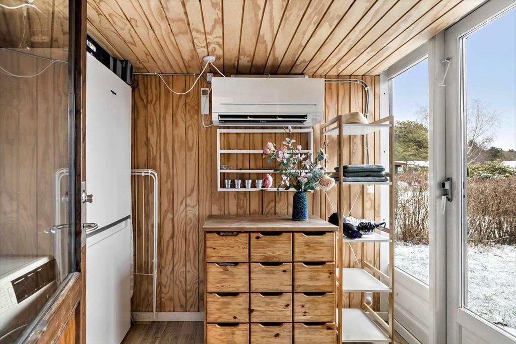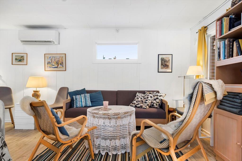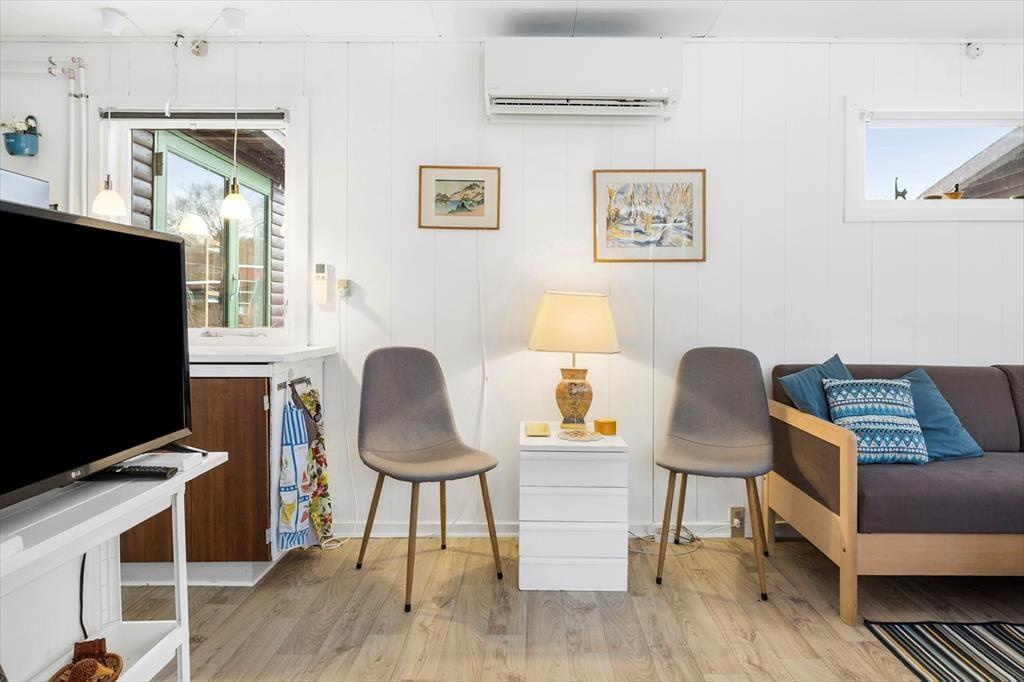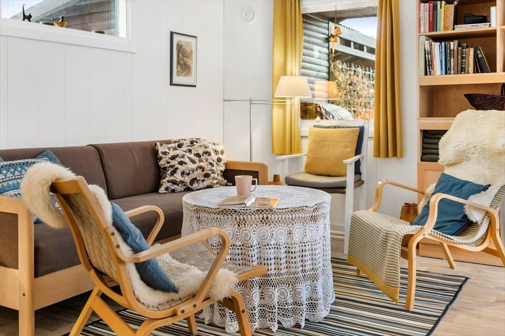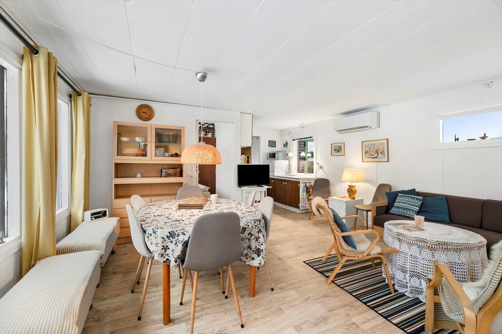 Her er man samlet i åben stue-spisestue og køkken, her hygger man sig med spil, madlavning og hvis vejret ikke tillader det , så spiser man i fællesrummet, der er desuden entre, toilet m. bruser og 2 soverum.