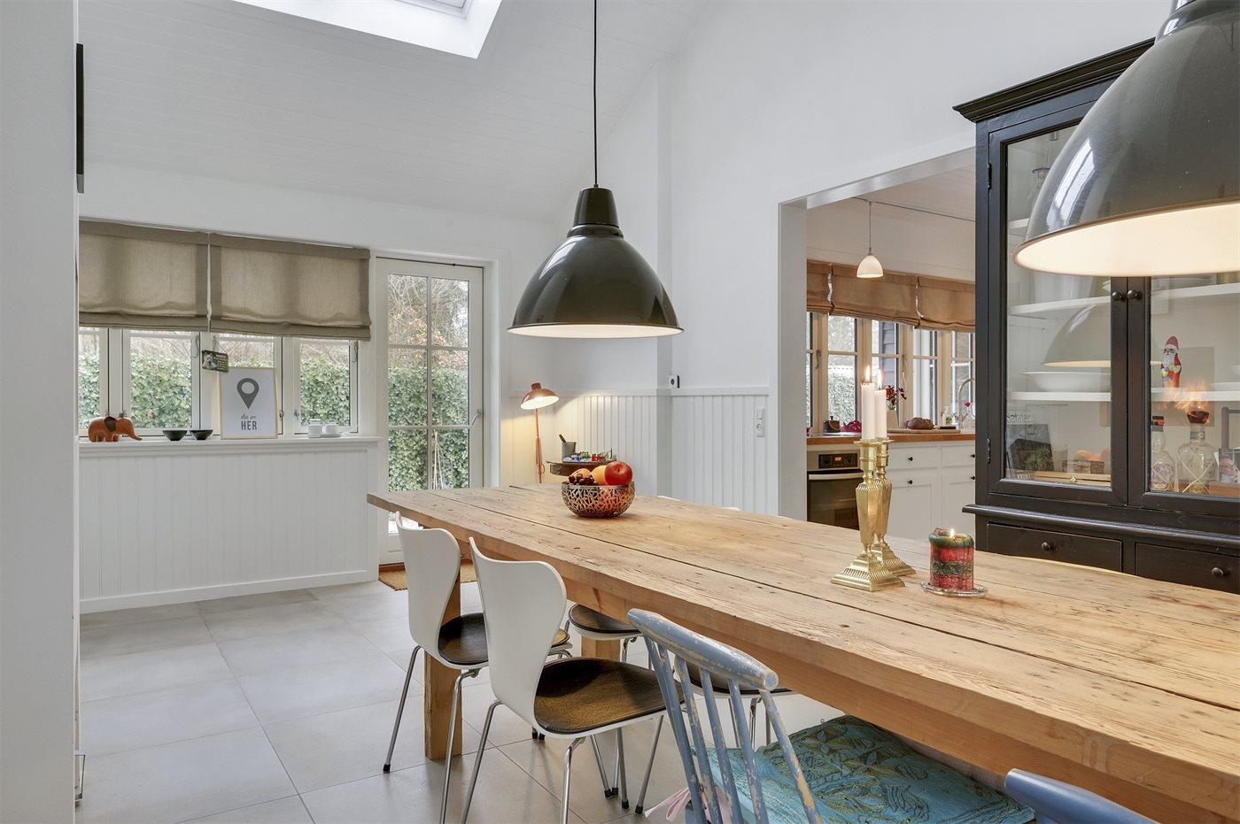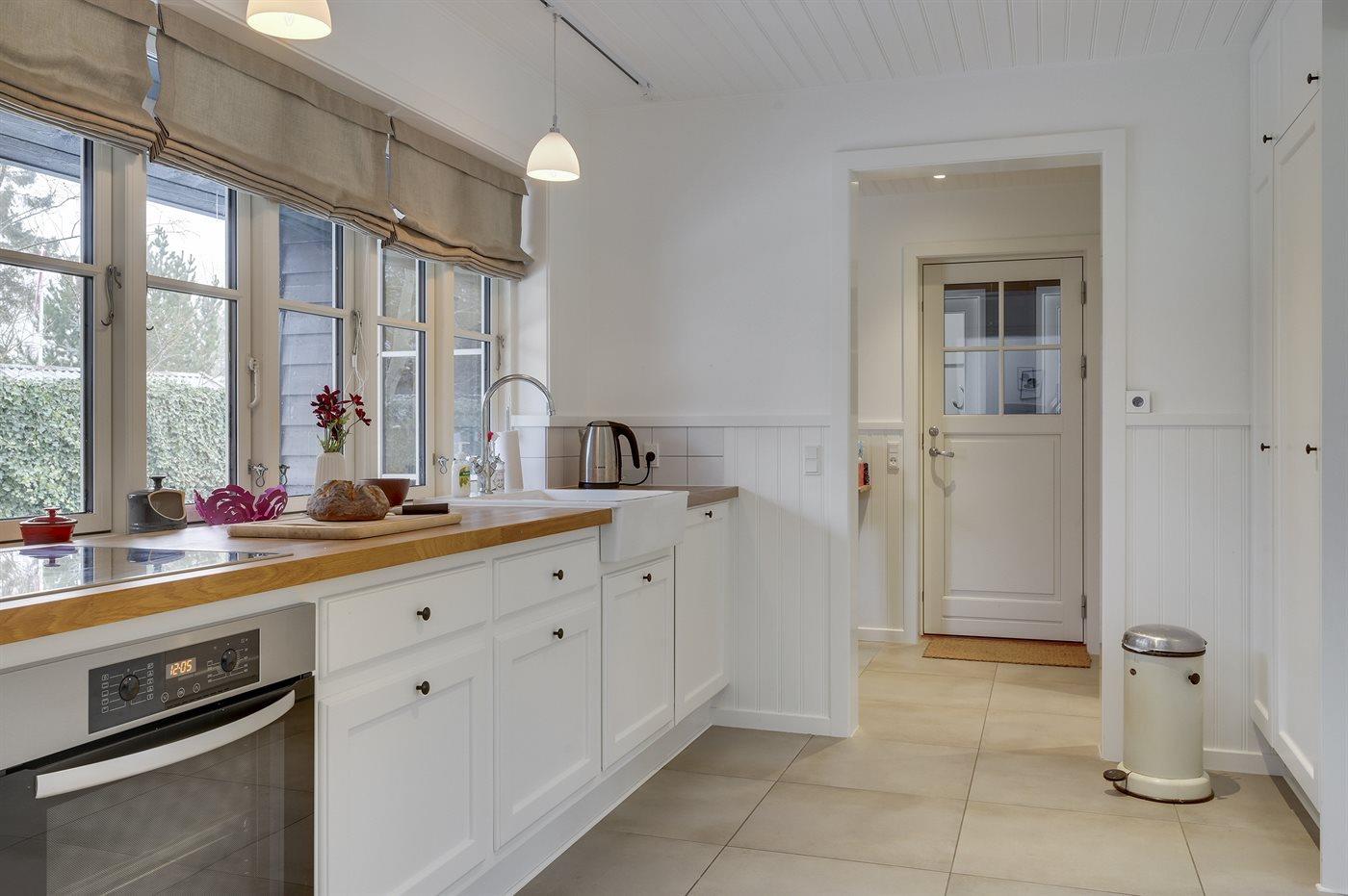 Køkkenet er udstyret med 1 køleskab. Der er 4 keramiske kogeplader, varmluftovn samt opvaskemaskine Der er gulvvarme i køkkenet.