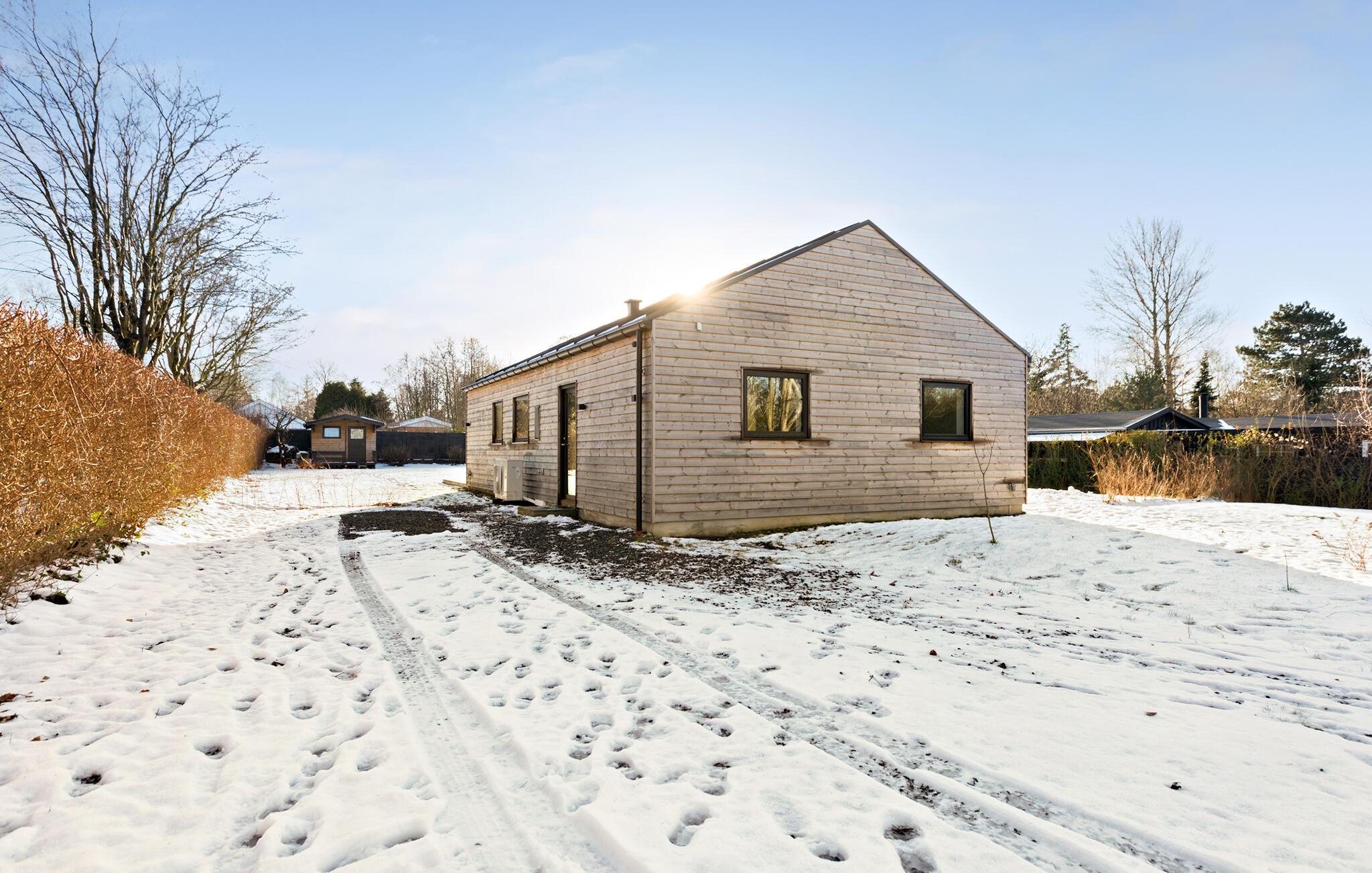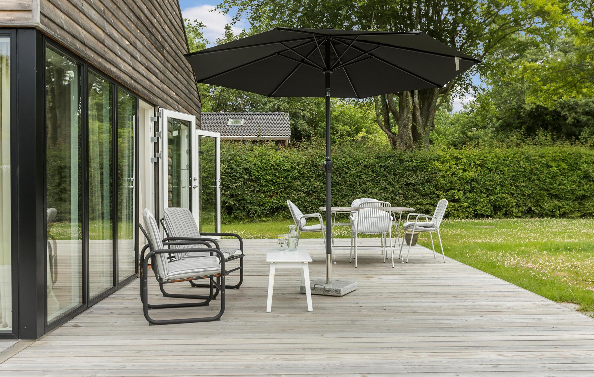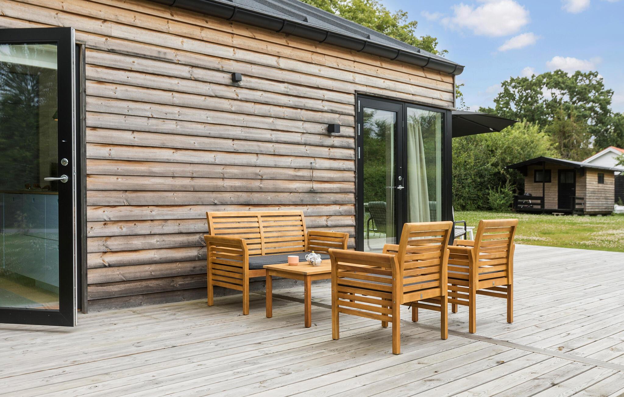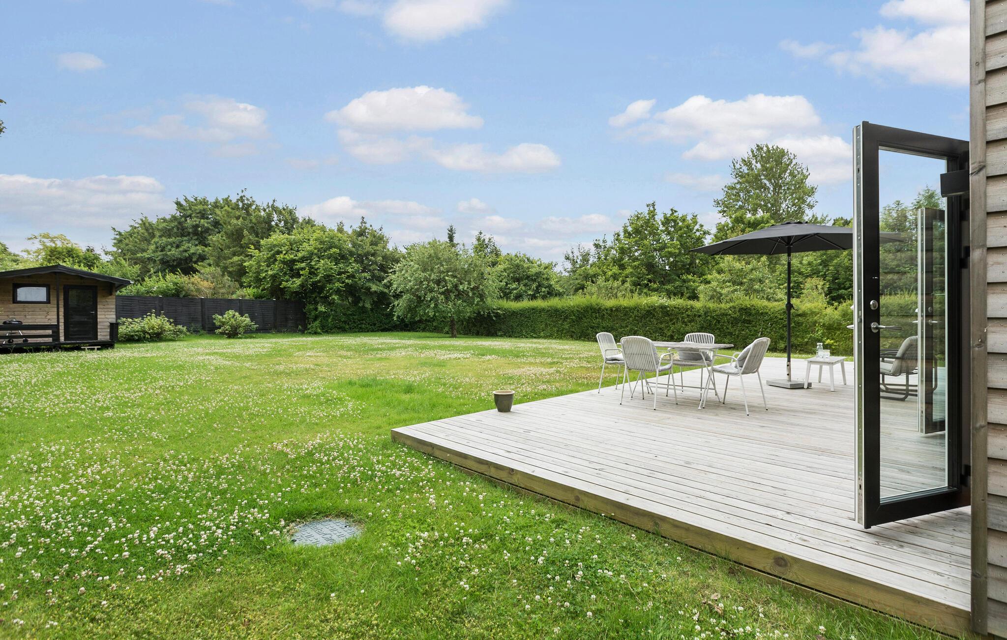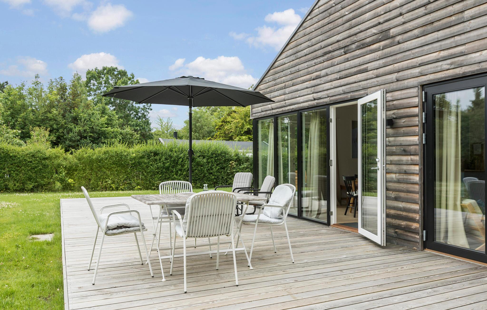 Moderne træhus i Kulhuse med stor terrasse, privat have og tæt på stranden for afslapning og familiehygge.