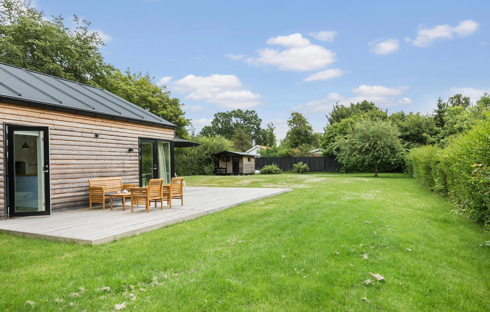 Smukt og moderne træhus med stor terrasse og familievenlig have.