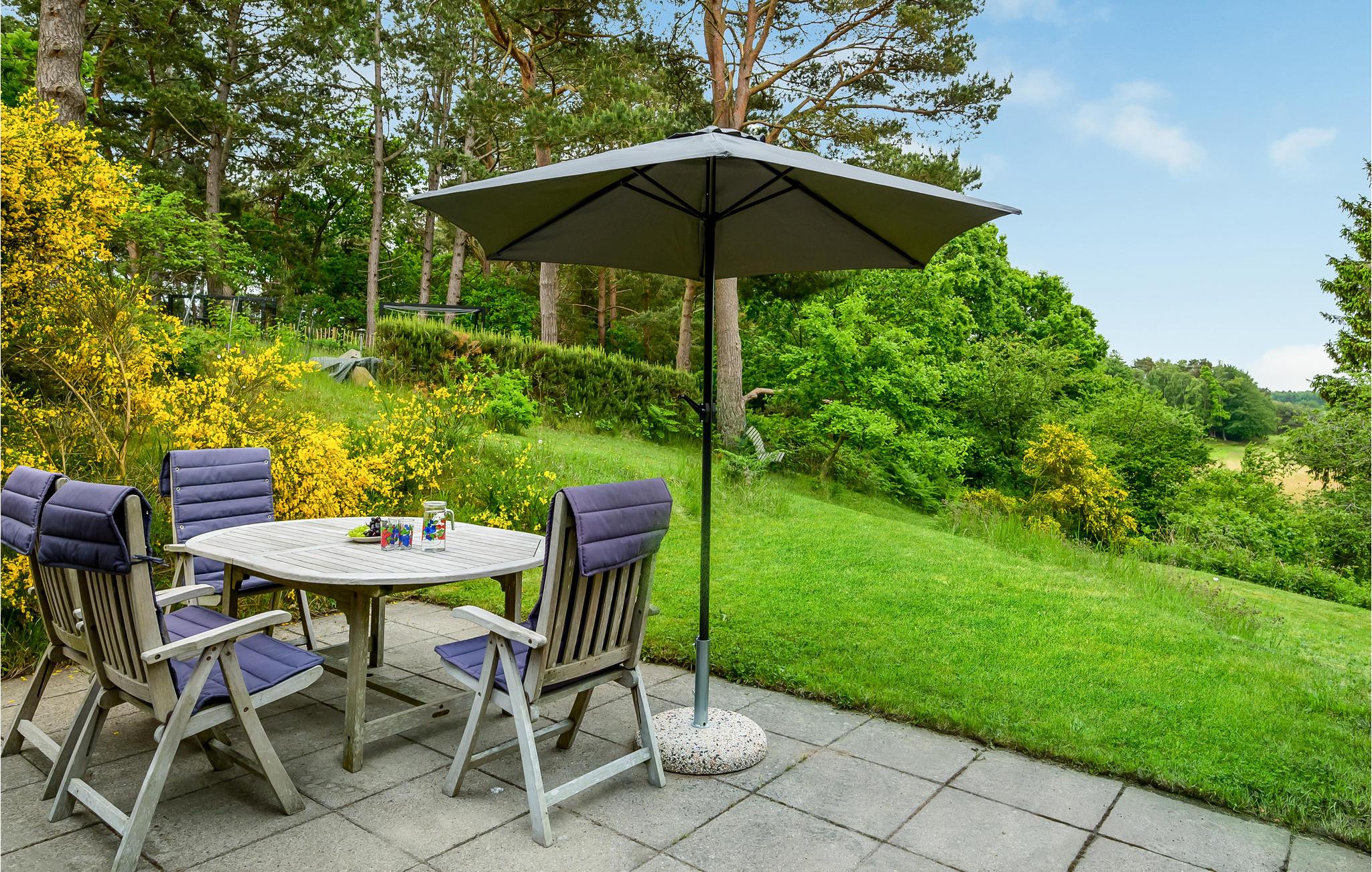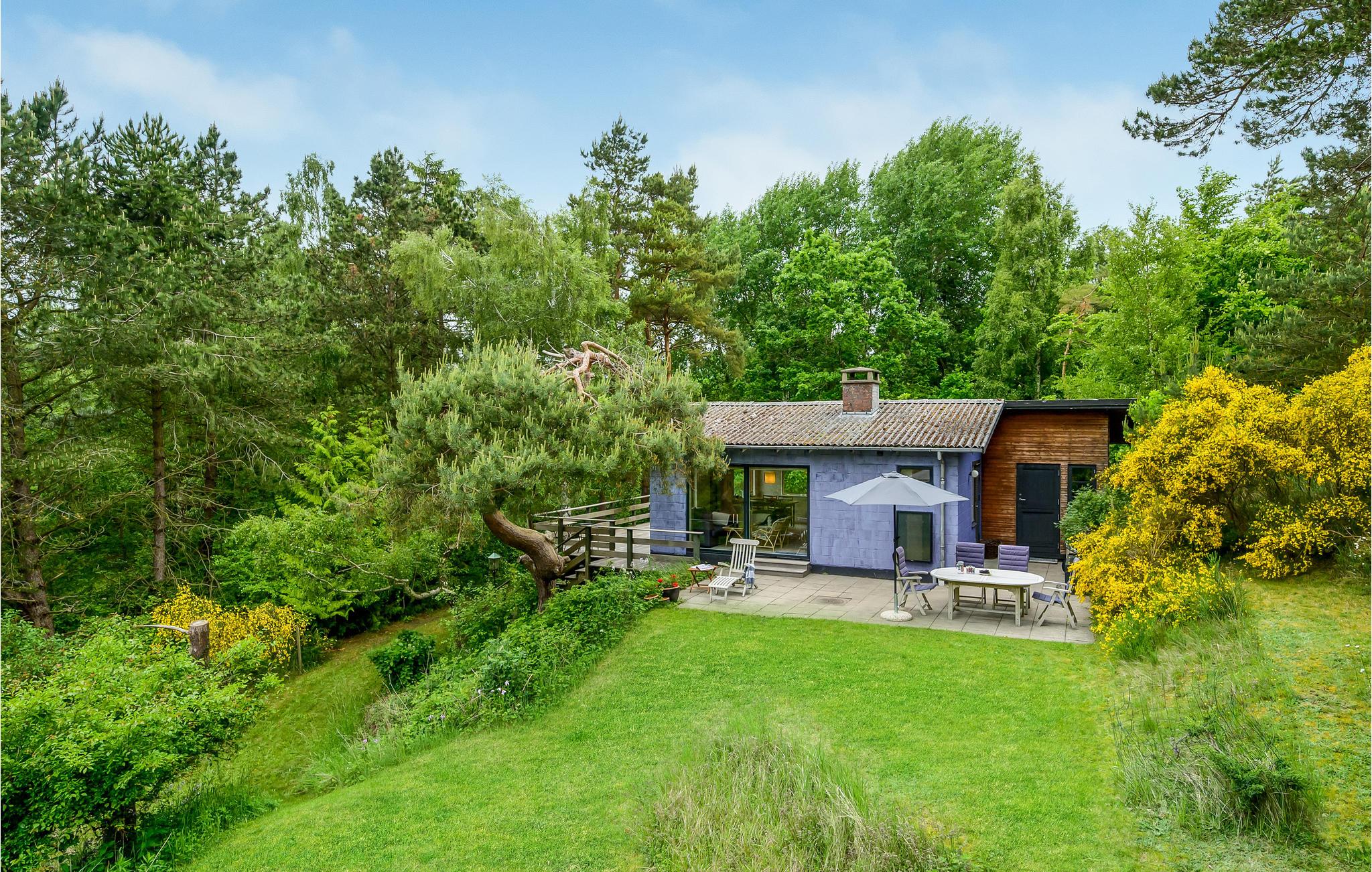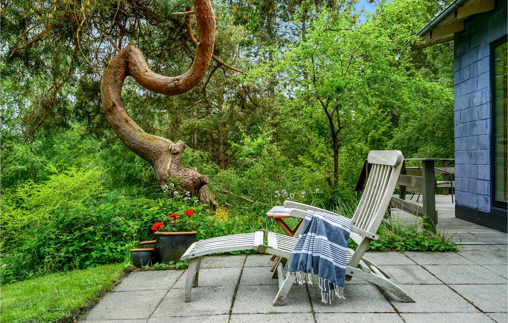 I får næsten følelsen af at bo i toppen af et træ, for dette sommerhus ligger elegant placeret på en bakke med en vidunderlig udsigt til trækronerne og det åbne landskab. Her får I nogle skønne omgivelser til at nyde nogle fredelige dage med solskin på terrasse og dejlige gåture i det grønne. Sæt jer med måltiderne i haven og lyt til tonerne af fuglesang, mens I planlægger dagens gøremål. Indretningen er charmerende i klassisk, dansk sommerhusstil med fine detaljer fra 1060'erne.