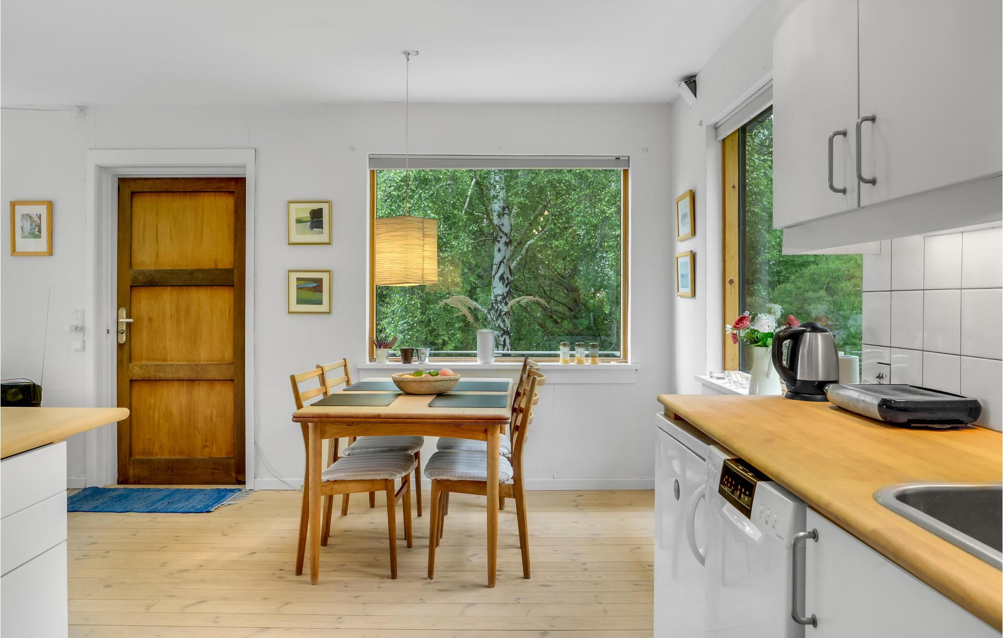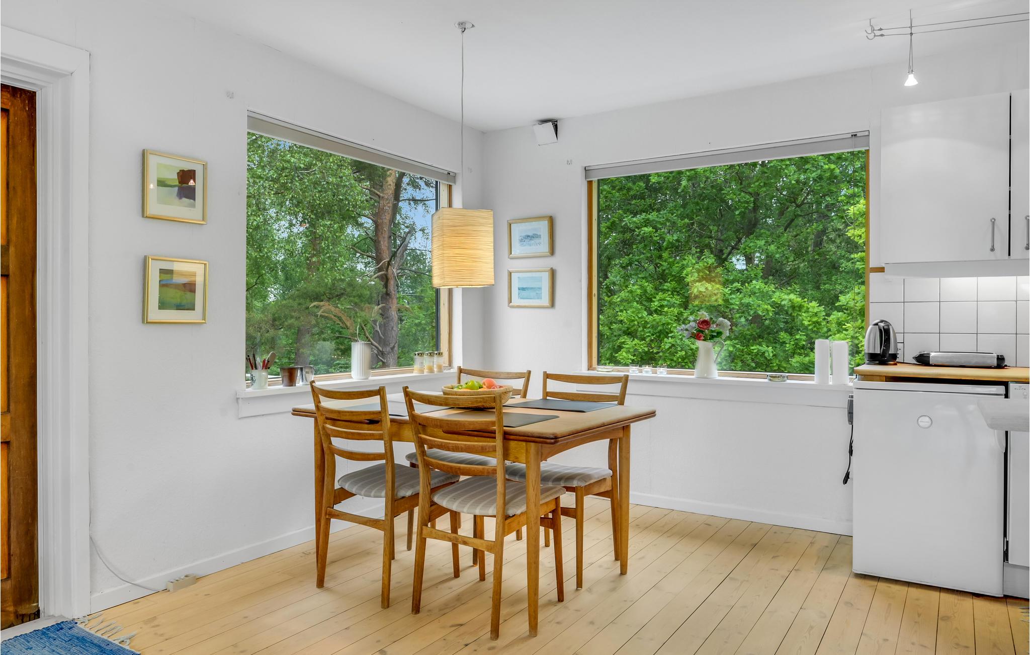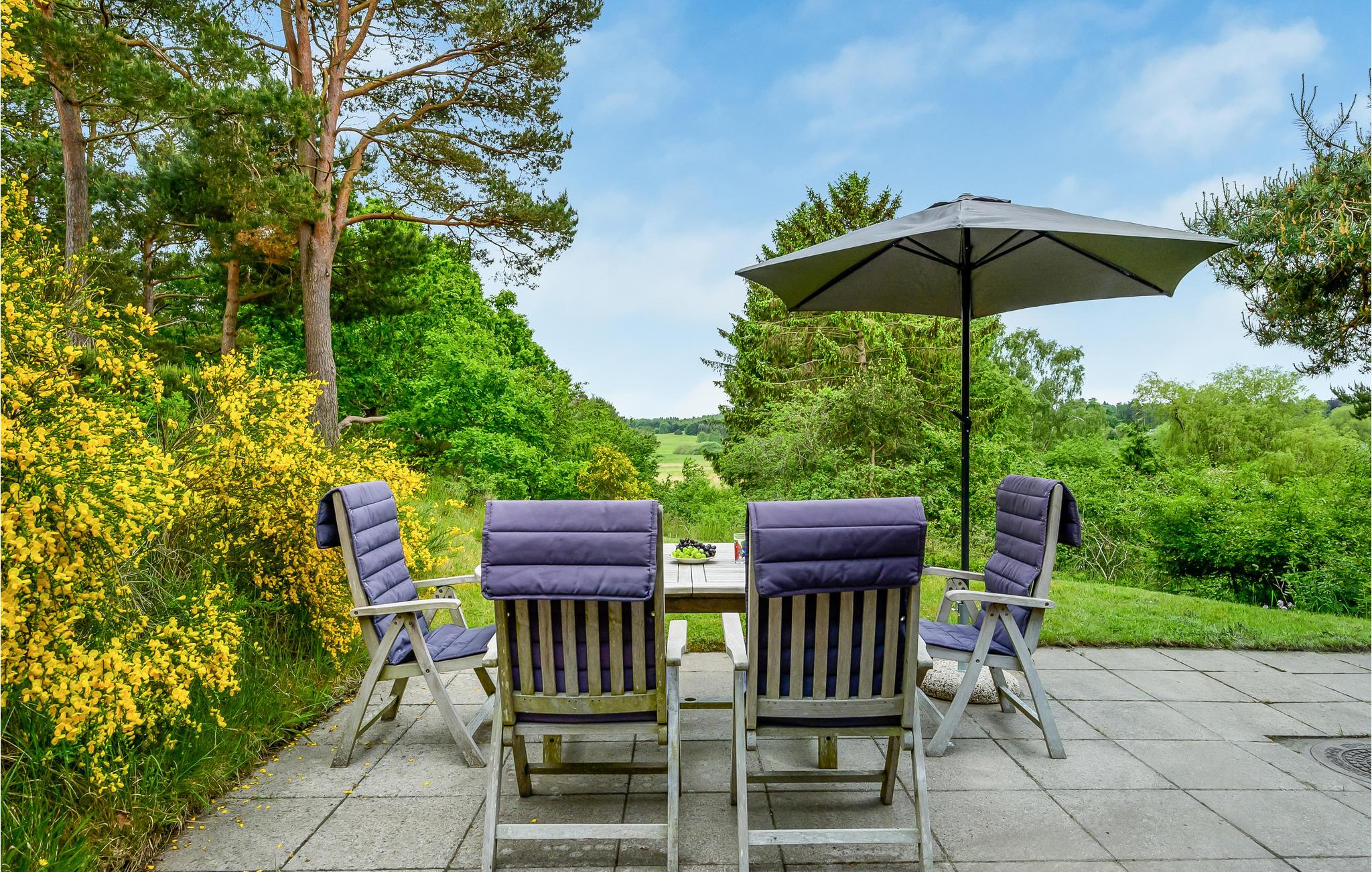 I får næsten følelsen af at bo i toppen af et træ, for dette sommerhus ligger elegant placeret på en bakke med en vidunderlig udsigt til trækronerne og det åbne landskab. Her får I nogle skønne omgivelser til at nyde nogle fredelige dage med solskin på terrasse og dejlige gåture i det grønne. Sæt jer med måltiderne i haven og lyt til tonerne af fuglesang, mens I planlægger dagens gøremål. Indretningen er charmerende i klassisk, dansk sommerhusstil med fine detaljer fra 1060'erne.