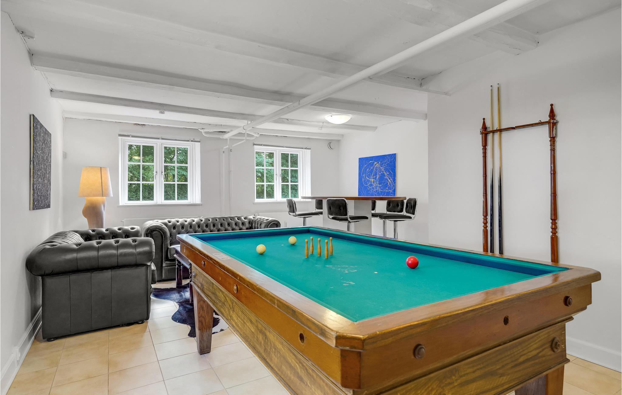 Det tidligere private hjem for grev Michael Ahlefeldt-Laurvig Bille byder jer velkommen kun få hundrede meter fra Egeskov Slot. Jeres feriehus er hovedbygningen på Rubjerg-ejendommen og tilbyder masser af plads til den store familie eller flere familier, der holder ferie sammen. Hjertet i det smukke hus er pejsestuen, som giver jer mange muligheder på grund af sin rummelighed og hygge. I de andre fællesrum er der mulighed for at spille billard, slappe af eller lave mad sammen. Det moderne køkken har et stort gaskomfur med grillfunktion.