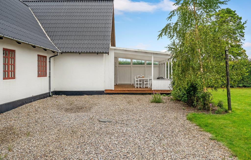 En overdækket terrasse indbyder til at grille og snakke om dagens oplevelser ved spisebordet. Bagefter kan børnene lege i haven og bruge den store græsplæne.