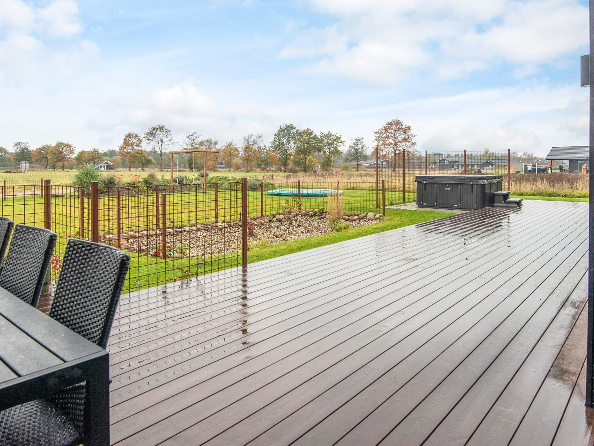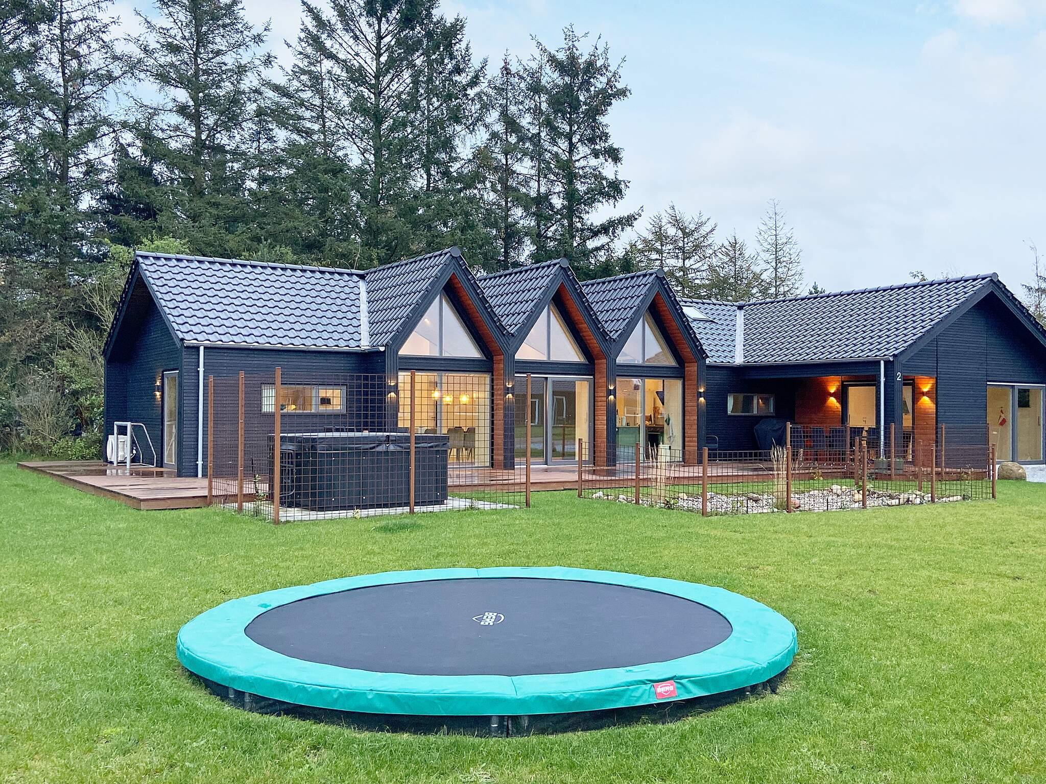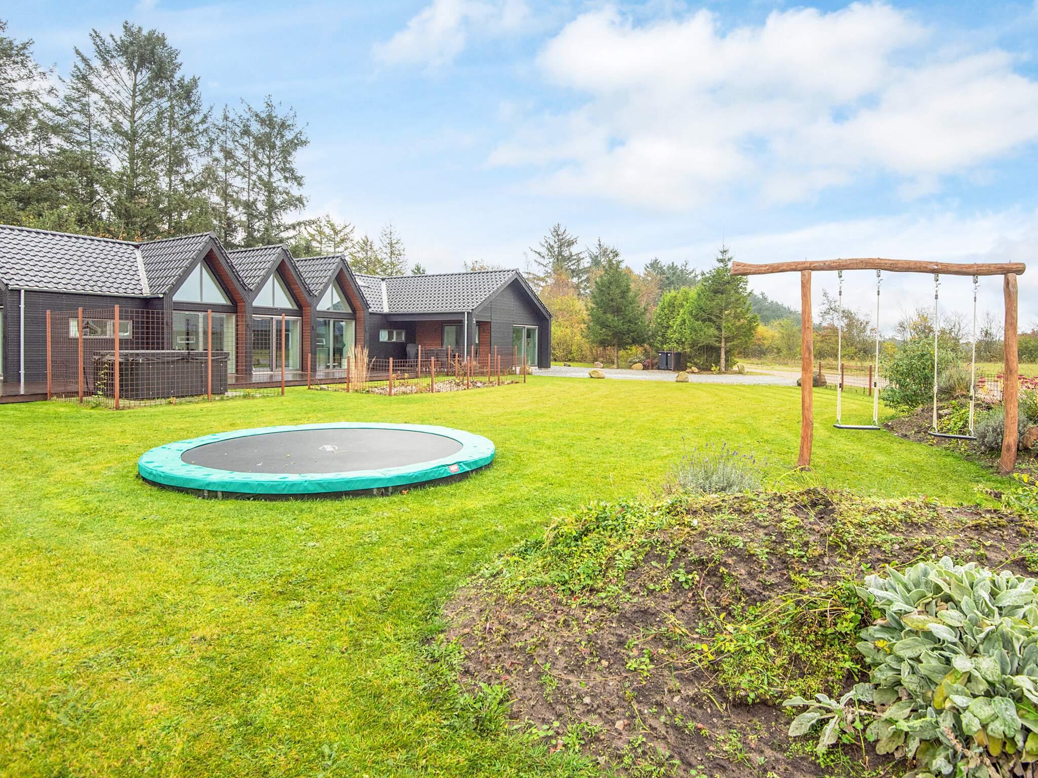 Ejendommen har desuden en 150 m² stor træterrasse til solrige dage og hyggelige grillaftener. Selv i de køligere måneder kan du slappe af i det varme vand i det store udendørs spabad. Den naturlige ejendom byder på en græsplæne med et fodboldmål til lille Messis og Ronaldos. Til de mindste er der også gynge, sandkasse og havetrampolin (brug på eget ansvar). Huset er udstyret med solcellepaneler, hvilket reducerer mængden af ??elforbrug markant.