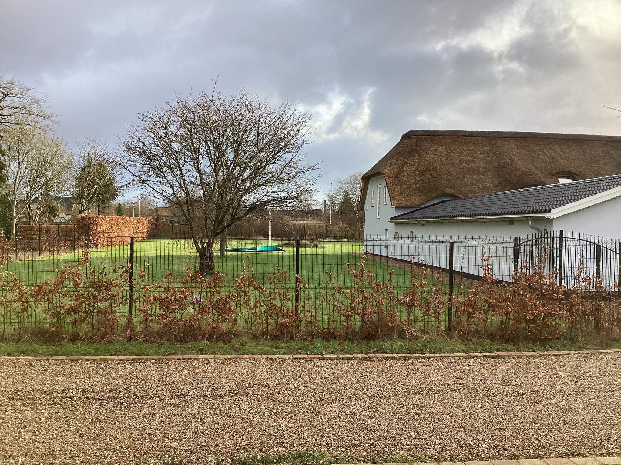 Fra køkkenet og opholdsstuen kan gæsterne få adgang til den store udendørs grund. En overdækket terrasse er det perfekte sted til udendørs spisning, grill eller blot at nyde den friske luft. Børn kan nyde legeredskaberne på stedet, herunder en trampolin (brug på eget ansvar), mens voksne kan slappe af i de solrige haveområder. Ejendommen tilbyder også rigelig parkering og en carport for bekvemmelighed.