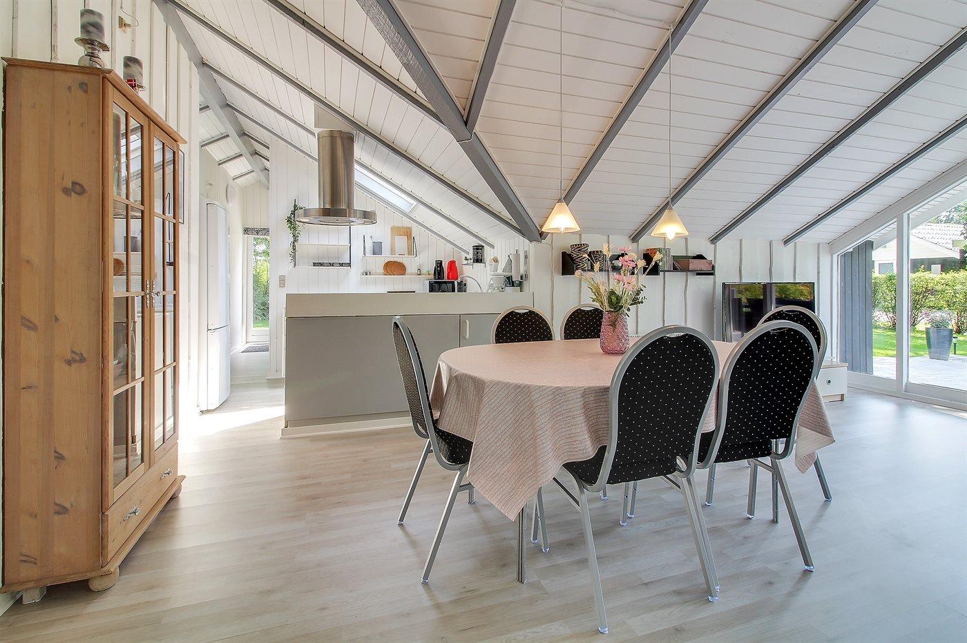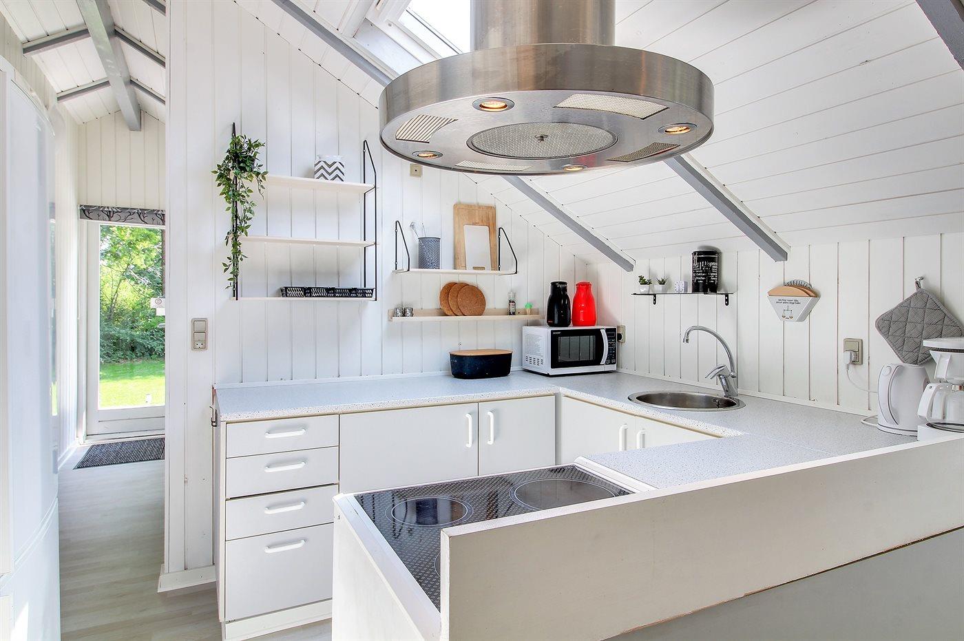 Køkkenet er udstyret med 1 køleskab. Der er 4 keramiske kogeplader, bageovn, mikrobølgeovn samt opvaskemaskine.