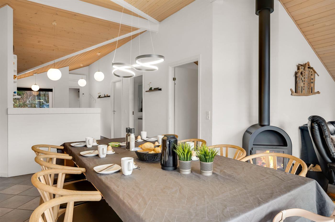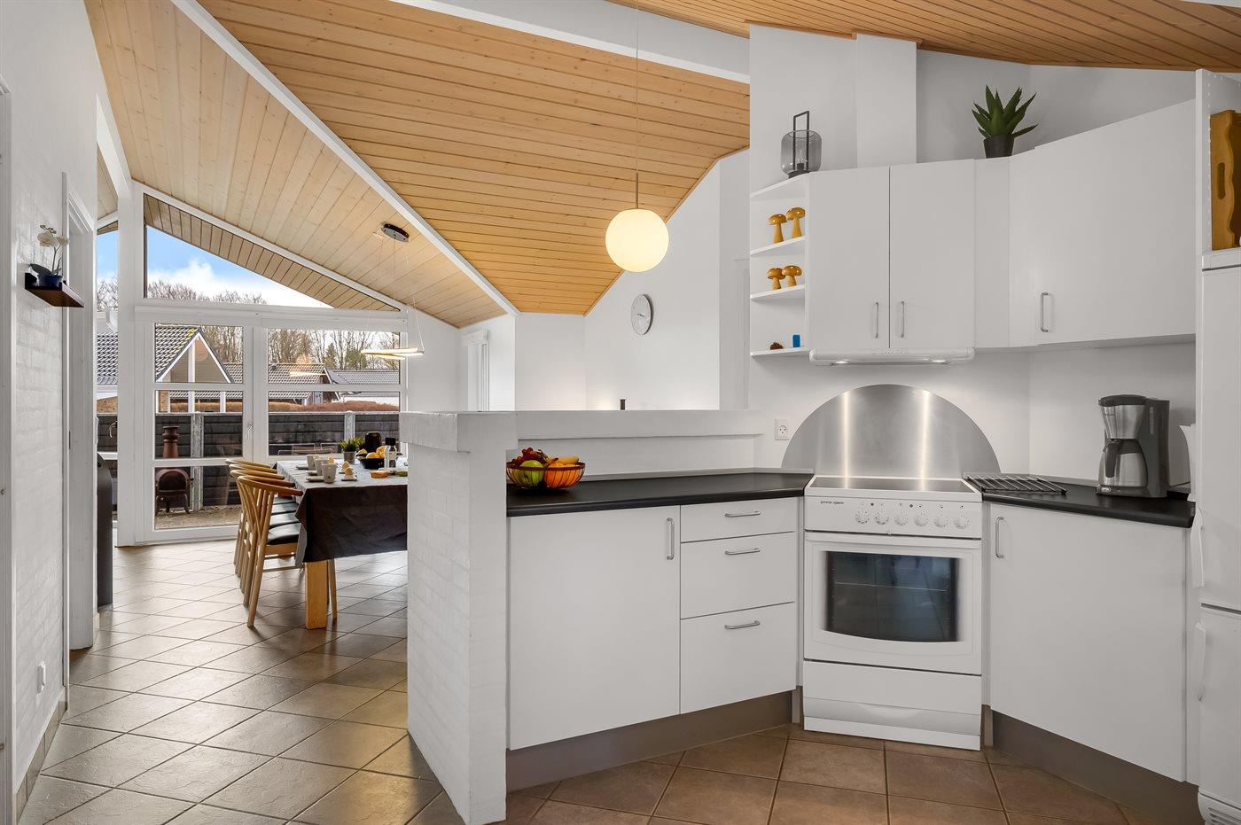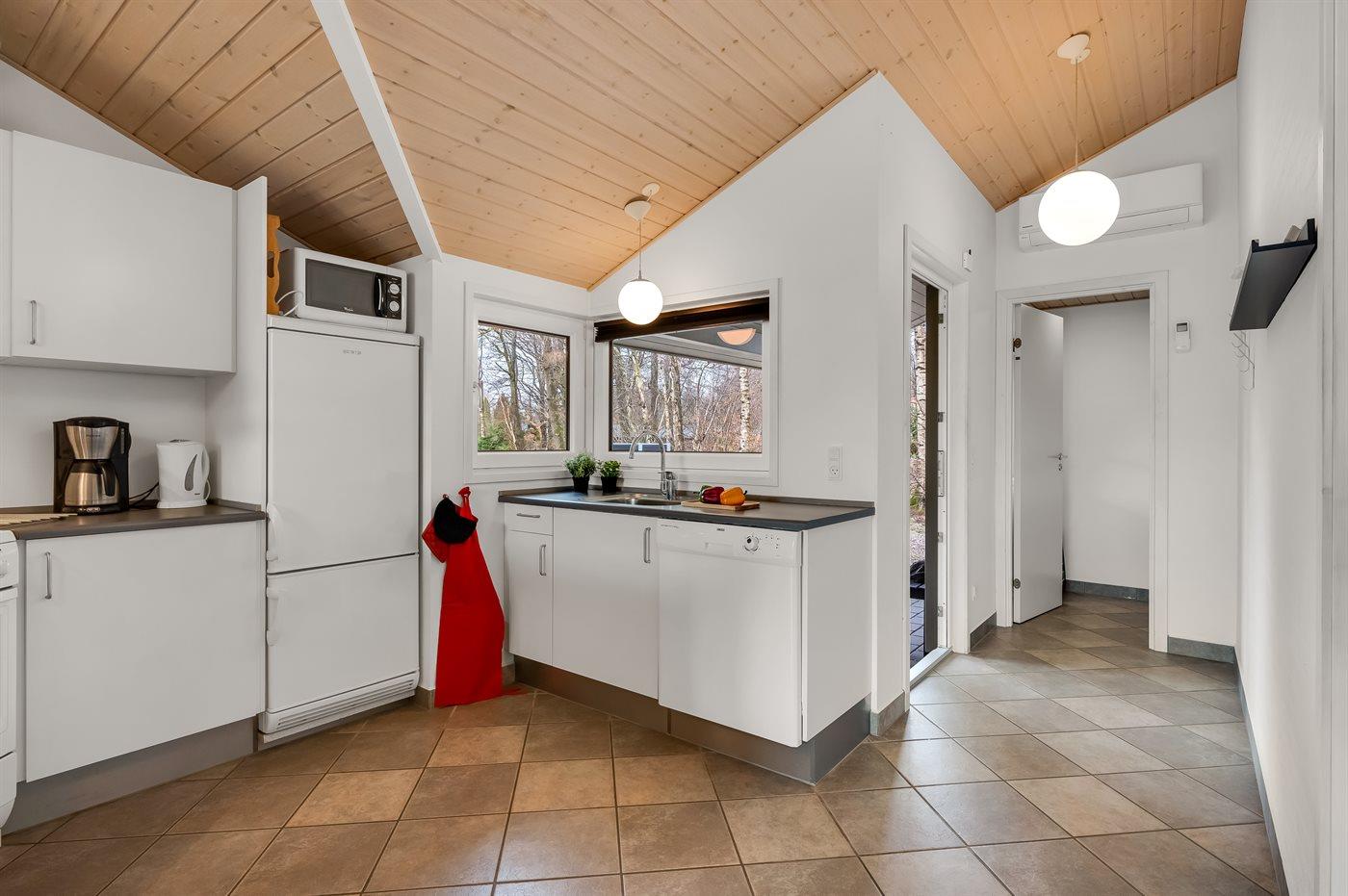 Køkkenet er udstyret med 1 køleskab. Der er 4 keramiske kogeplader, varmluftovn, mikrobølgeovn samt opvaskemaskine.