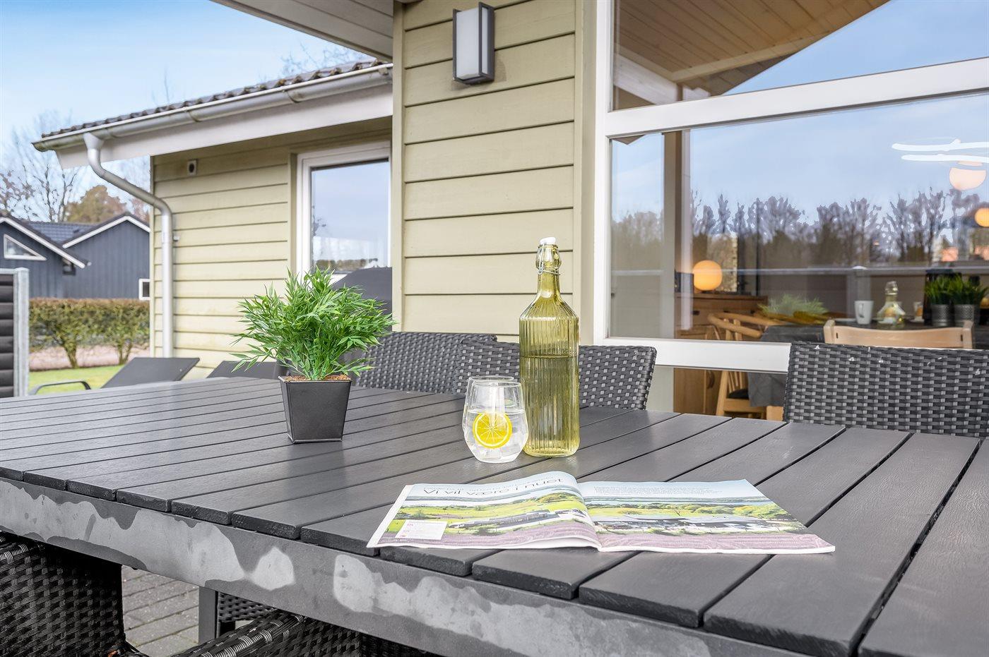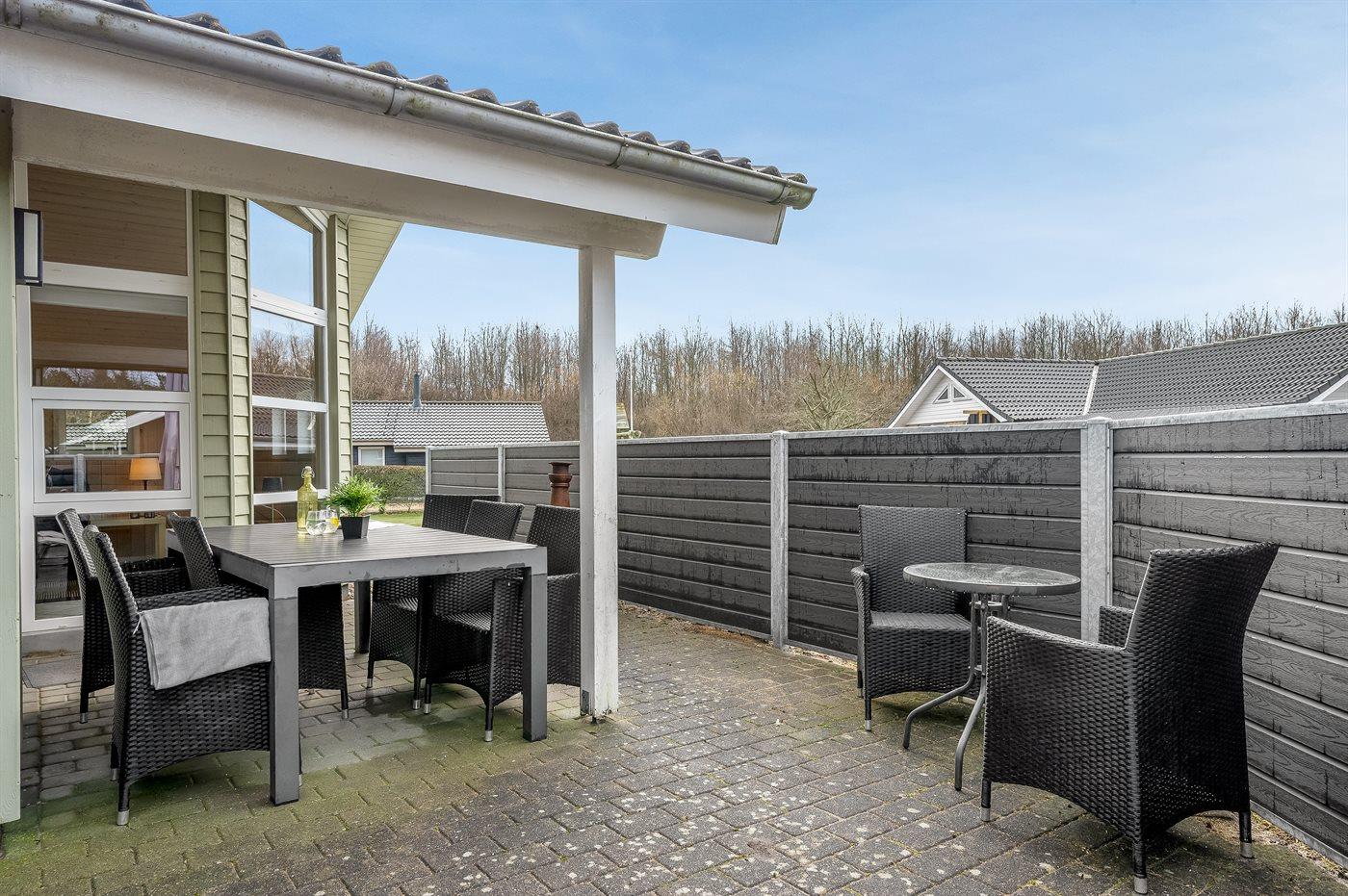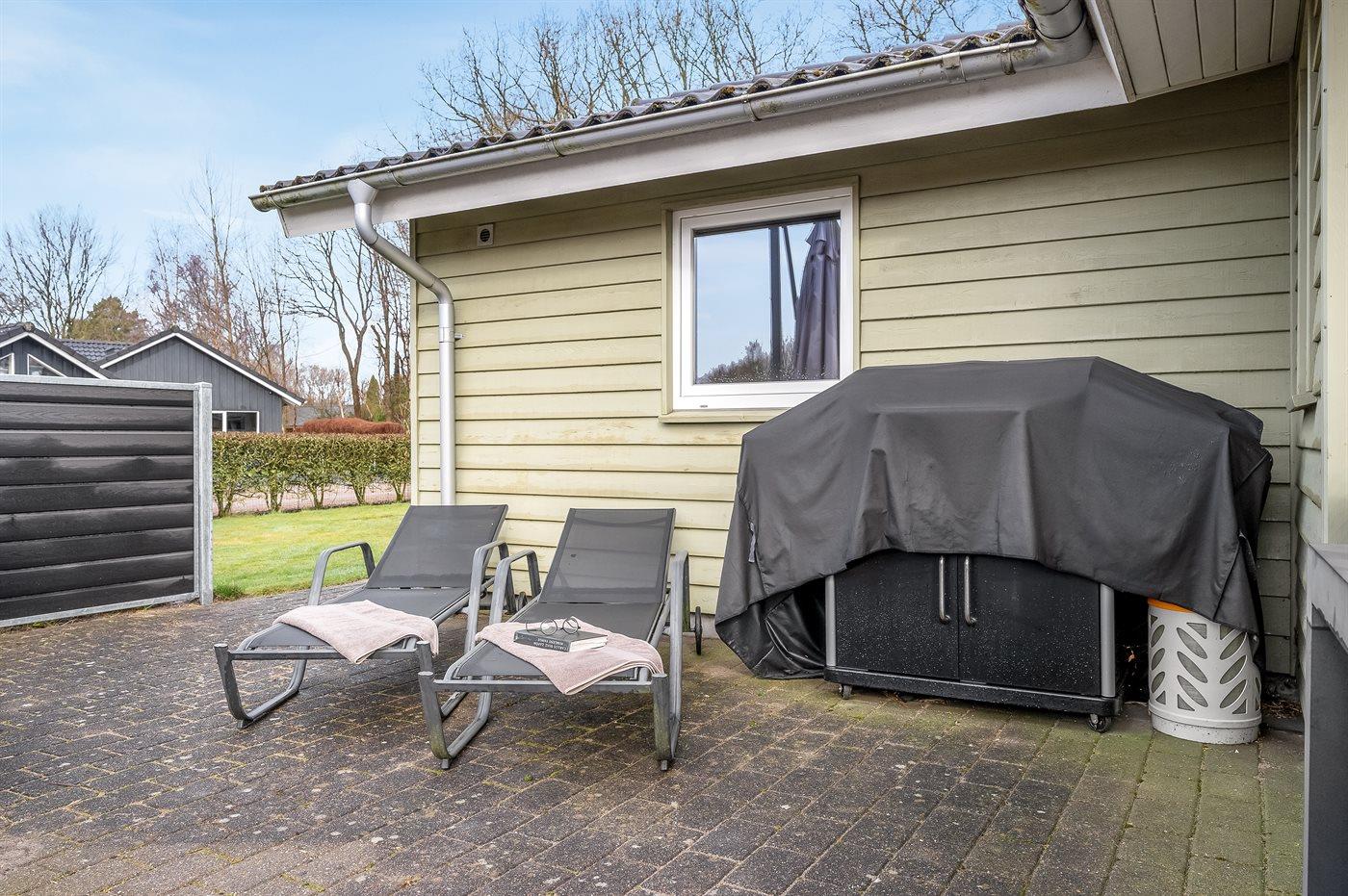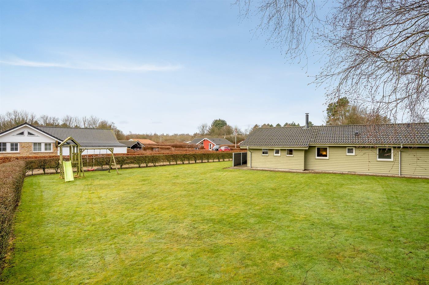 Ferieboligen er beliggende på en 900 m² stor naturgrund. Der er 40000 m til havet. Der er en sø i en afstand af 350 m. Nærmeste forretning er beliggende i en afstand af 3400 m. Til ferieboligen hører åbent terrasseareal. Desuden er der overdækket terrasse. Gynge. Legetårn. Rutchebane. Der ligger en legeplads i en afstand af 110 m. Grill til rådighed. Der er installeret stik til opladning af elbil. Type 2 stik. Med 11 kW ladeeffekt. Parkering ved ferieboligen.