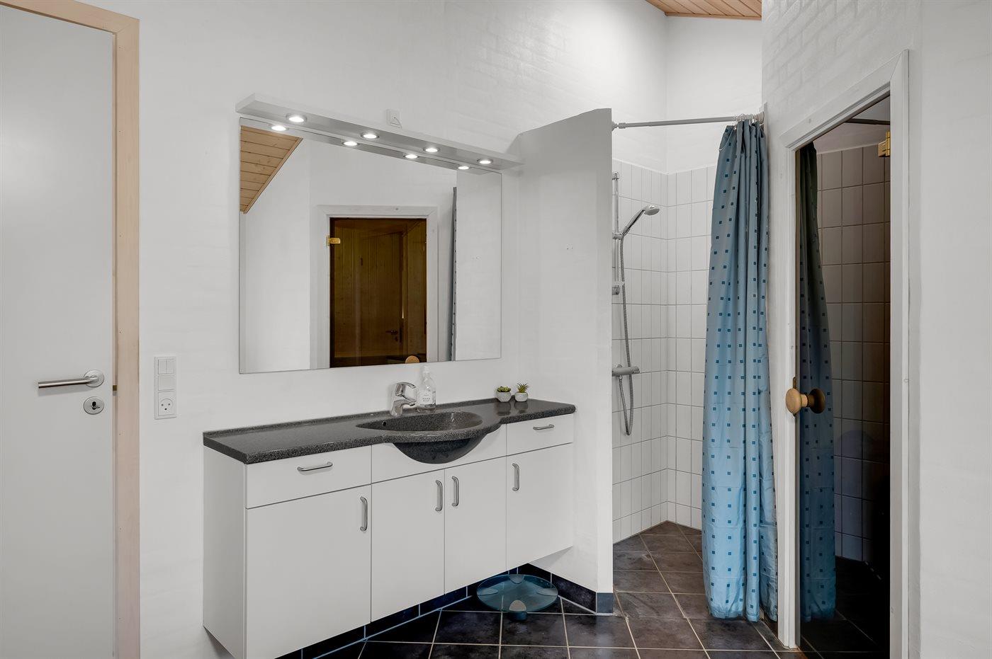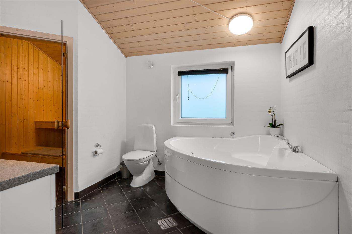 Der er 2 badeværelser med bruseniche og 2 toiletter I saunaen er der mulighed for afslapning.