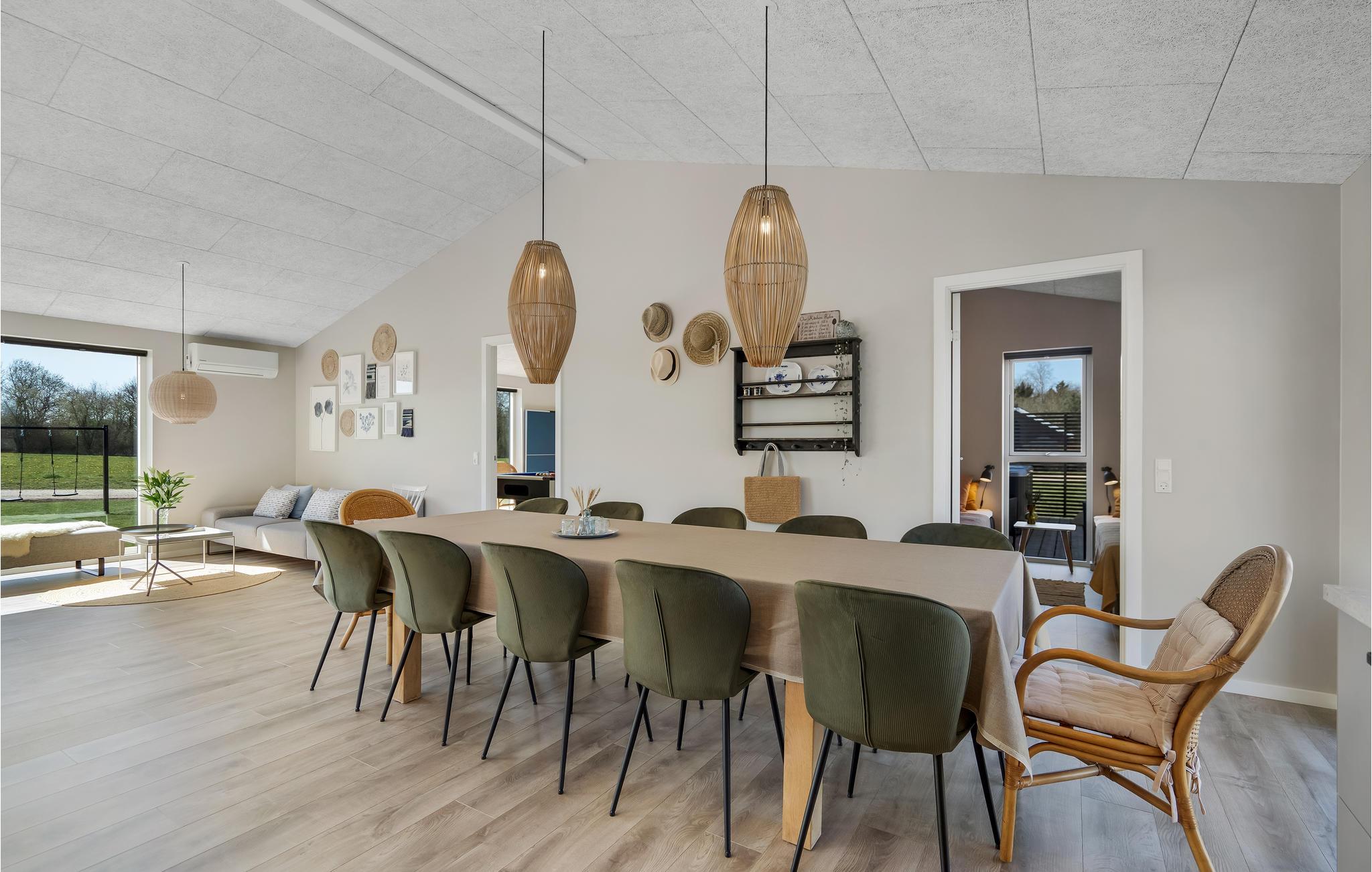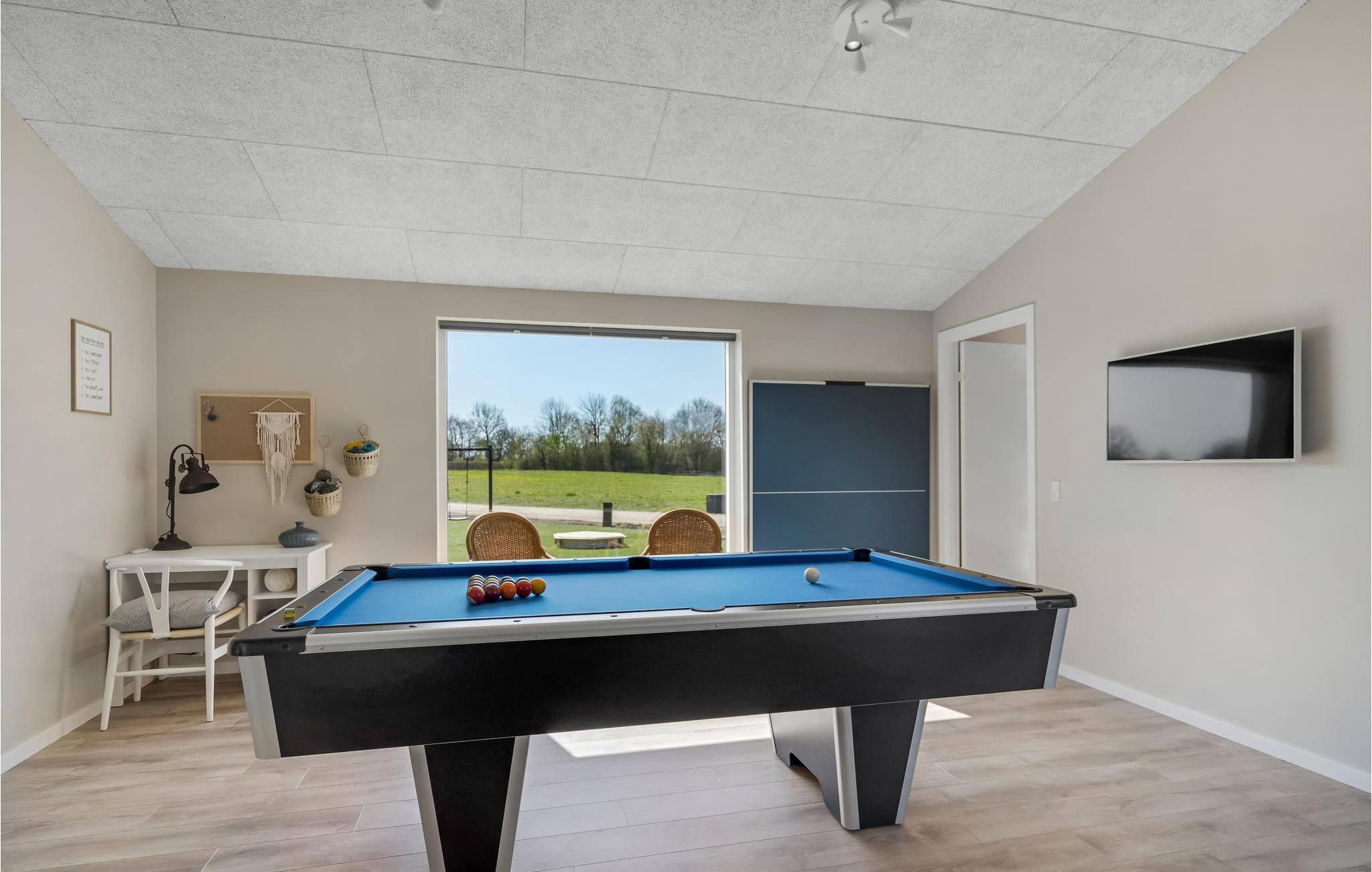 Glæd jer til jeres ferie i dette moderne og indbydende feriehus med jeres udvidede familie eller en vennefamilie. Huset har meget at byde på, for udover de hyggelige soveværelser kan I tilbringe underholdende timer i aktivitetsrummet med poolbord eller lade tiden flyve afsted i den store stue, mens I laver mad, spiser, leger eller slapper af på sofaen. I kan også nyde solrige timer på den smukke terrasse og slappe af i spabadet, mens jeres børn boltrer sig i haven.