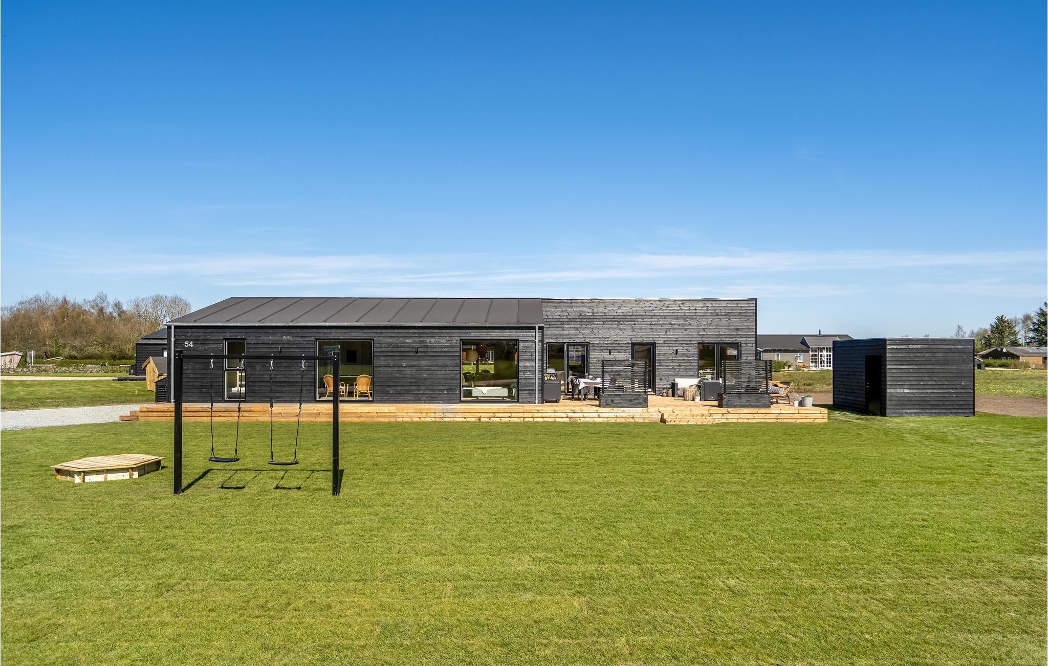 Moderne feriehus ved Kvie Sø med spabad, aktivitetsrum og stor terrasse til afslapning og leg.