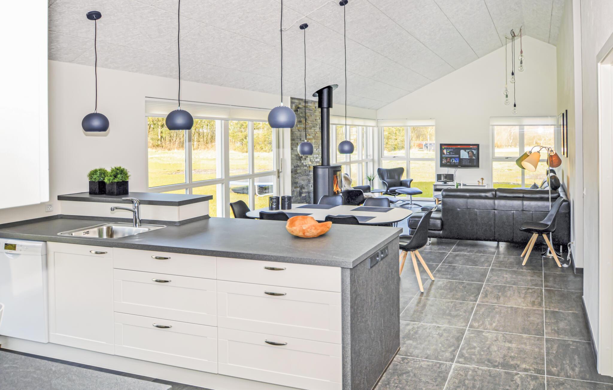 Et virkelig dejligt sommerhus med en unik beliggenhed ud til Kvie Sø, og med panoramaudsigt over søen fra den velindrettede stue. I det flotte aktivitetsrum kan I konkurrere i bordfodbold, bordtennis og pool, og på grunden er der opsat en trampolin (benyttes på eget ansvar). I det skønne køkken/alrum er opdelt i tre dele - sofaarrangement, spisestue og et flot køkken med alt i udstyr. Her findes også brændeovn og varmepumpe.