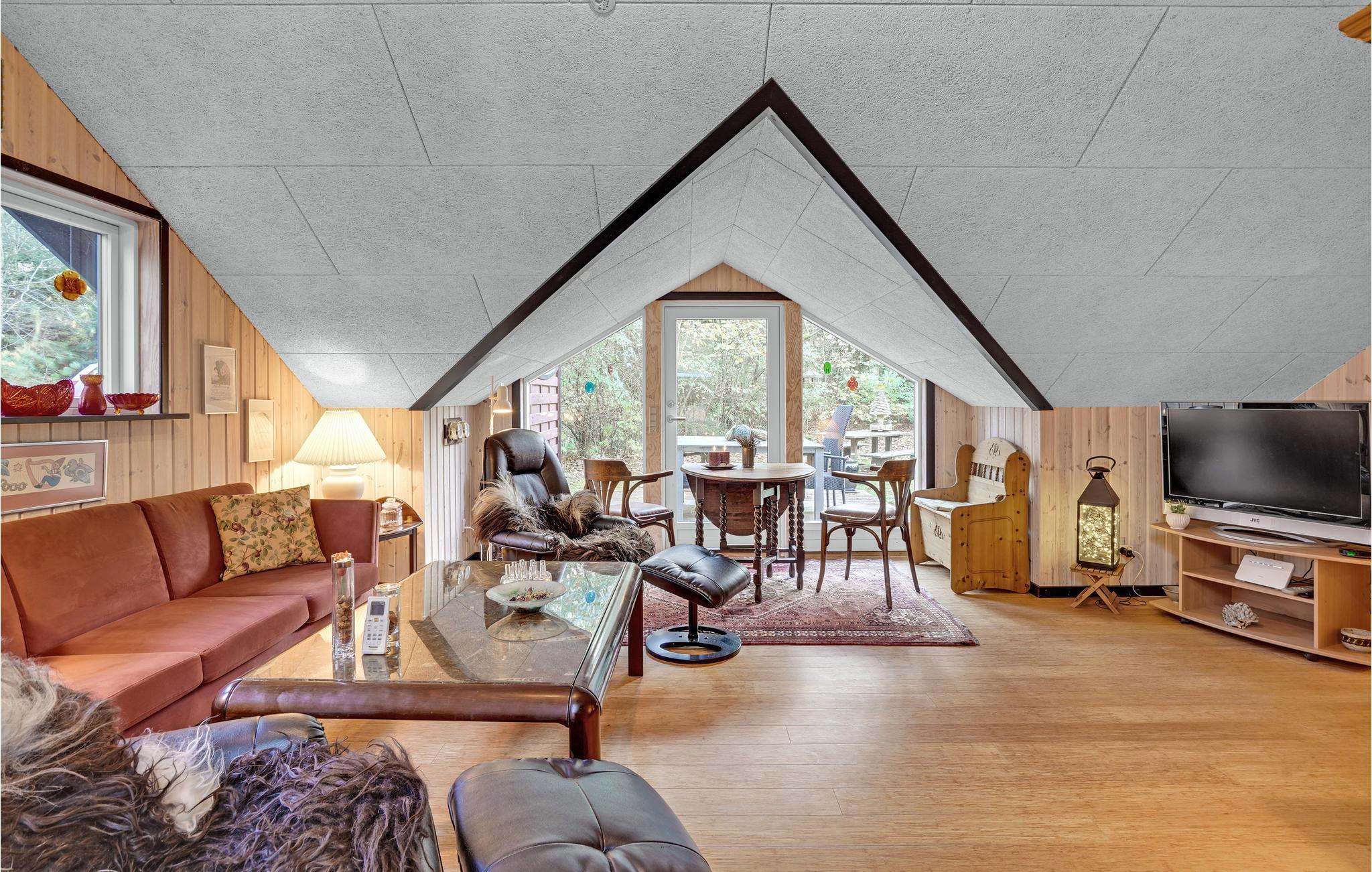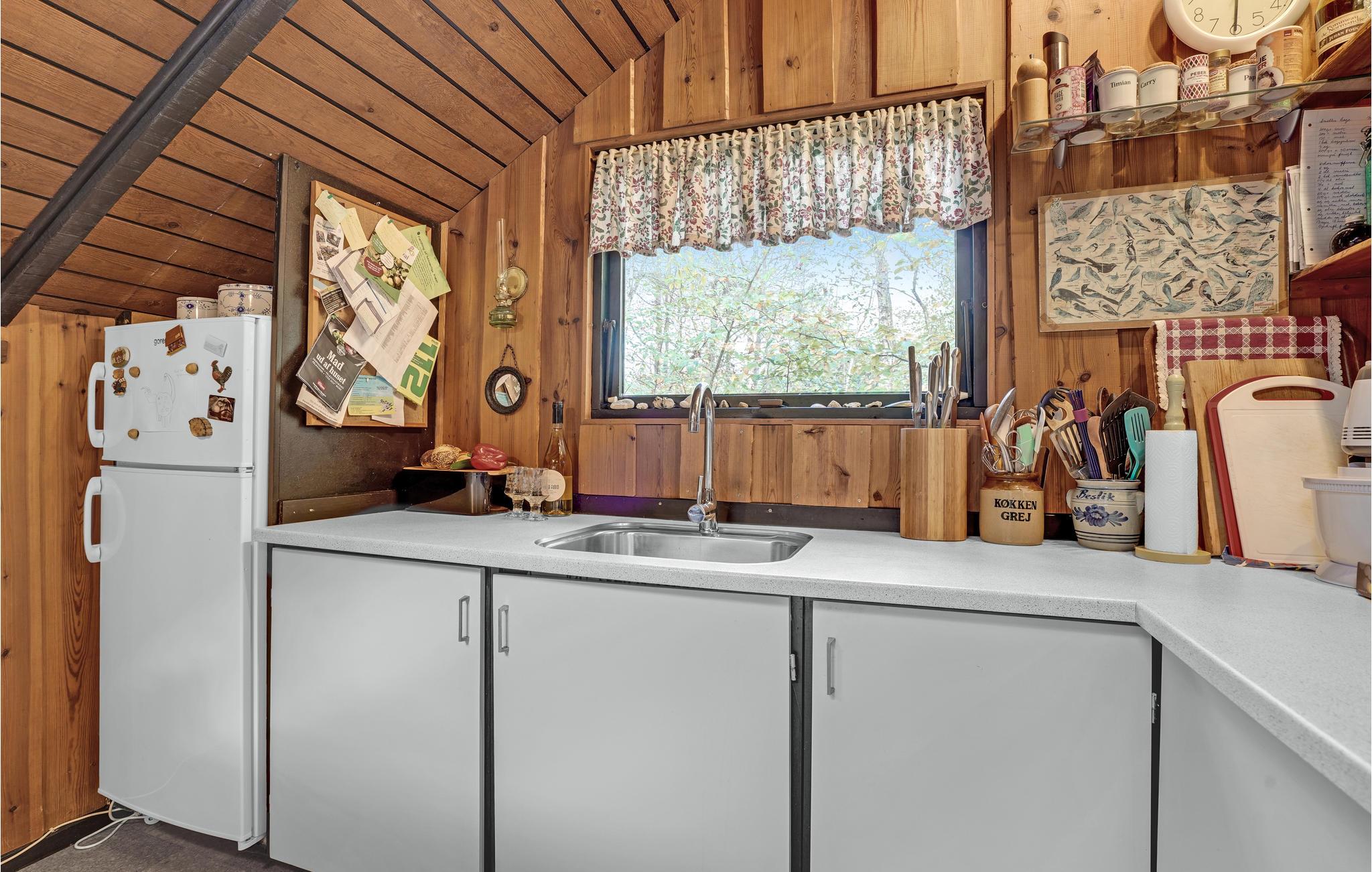 Glæd jer til nogle skønne og afslappende dage i dette charmerende feriehus midt i naturen og tæt på fjorden. Huset er lyst og smagfuldt indrettet, og loft til kip i kombination med flotte trævægge i de fleste rum gør det rummeligt og charmerende. I den ene af de to stuer kan I spise lækre feriemåltider sammen ved det store spisebord med udsigt til de flotte træer udenfor, og om aftenen kan I spille spil i et af de hyggelige sofahjørner. Fra hver stue har I udgang til en terrasse (den ene er delvist overdækket) med havemøbler og grill, hvor I kan spise morgenmad, sole jer i løbet af dagen og holde en hyggelig grillaften. Der er god plads til, at børn kan løbe rundt og lege på græsplænen.