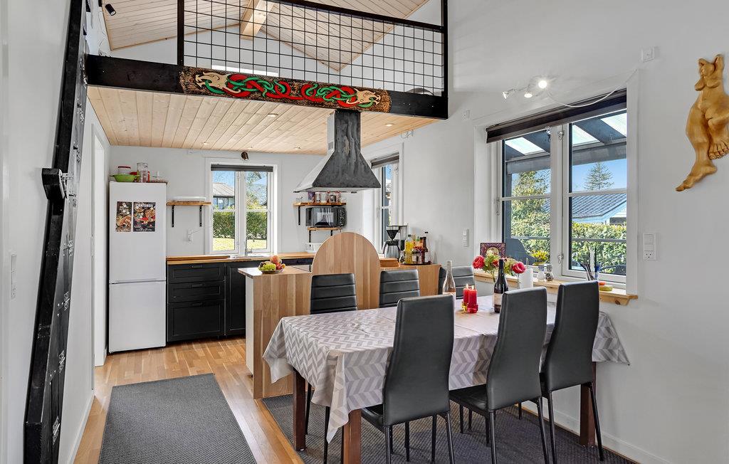 Dette topmoderne hus emmer af flotte designmæssige løsninger, gedigne materialer og en flot arkitektur. Her sænker skuldrene sig automatisk, for indretningen har en ro og varme, som gør det let at slappe af og nyde ferien. Opholdsrummet giver jer gode rammer om madlavning, dagens måltider og sofahygge. Soveværelserne er godt fordelt med luft imellem, og så er der ekstra sovepladser på hemsen. I haven kan I se frem til en terrasse med grill og en grund med god plads til børnene og jeres hund.