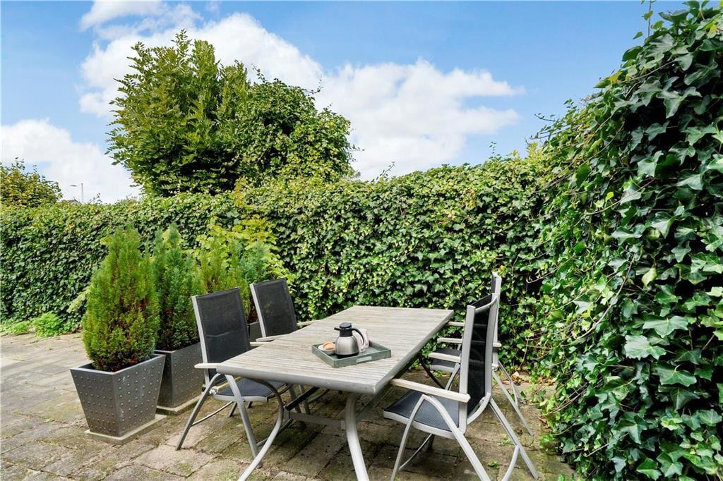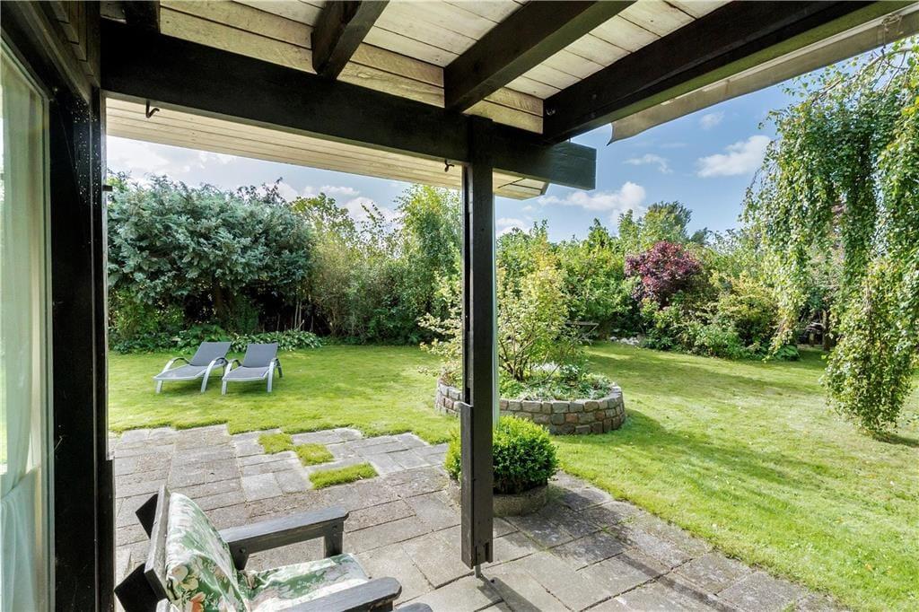 Udenfor venter en rummelig have med et strejf af naturlig vildskab, der skaber en afslappet og frodig atmosfære omkring huset. Her får du masser af plads til leg, nysgerrige opdagelser og til at lade naturens egen rytme folde sig ud. Terrasserne ligger smukt rundt om huset, og både åbne og overdækkede kroge giver mulighed for måltider i det fri, solrige kaffepauser eller stille stunder i læ for vinden. På grunden finder du også en sandkasse og en gynge, så børnene kan nyde de grønne omgivelser lige udenfor døren.