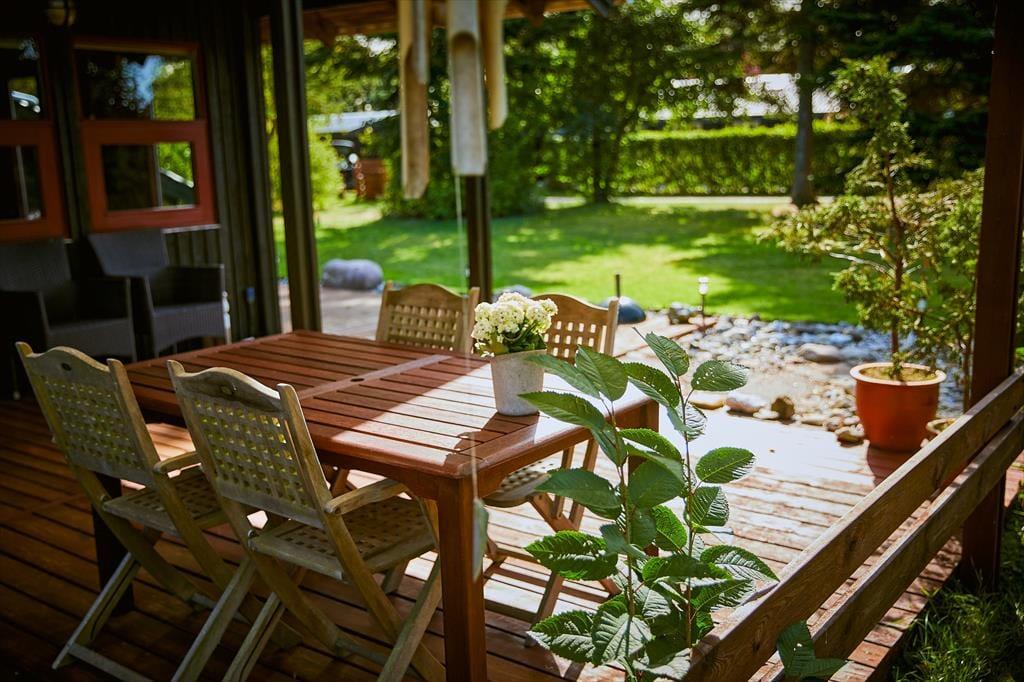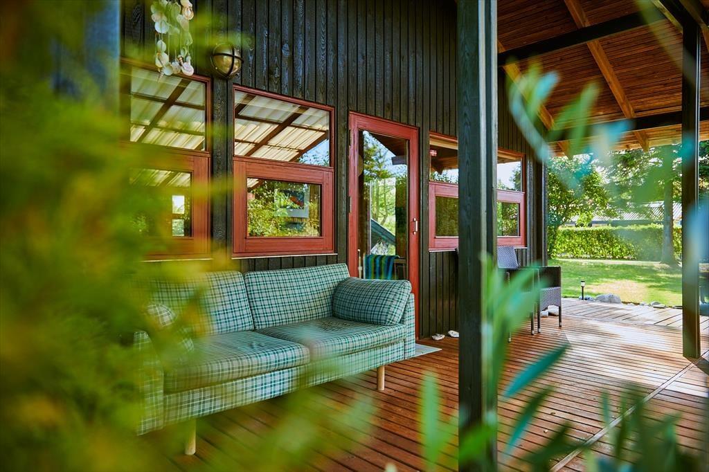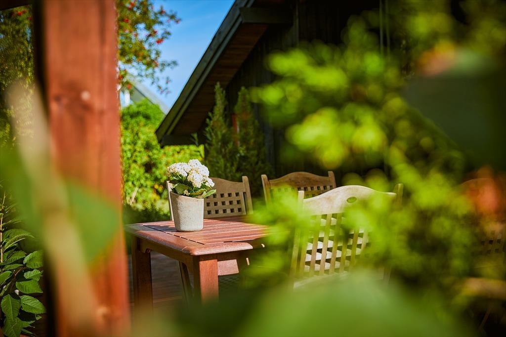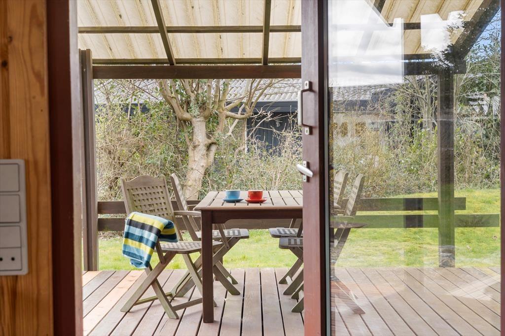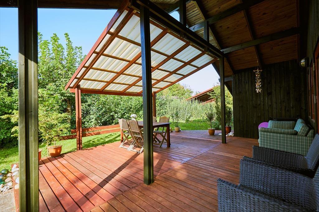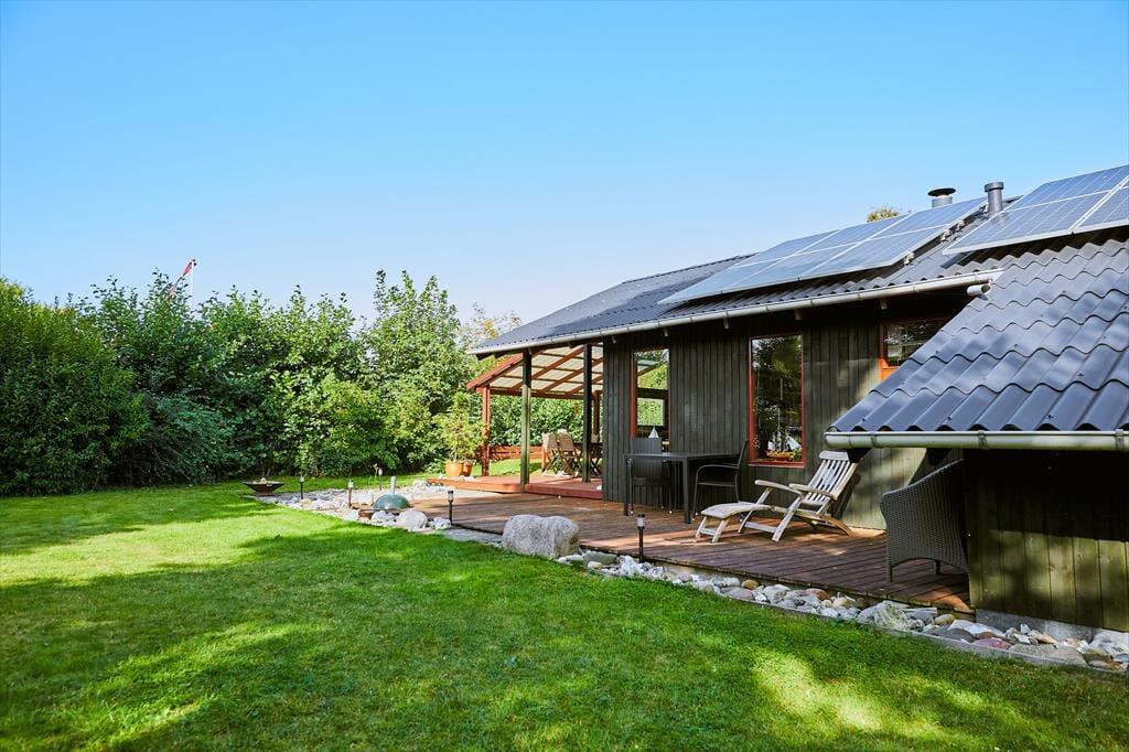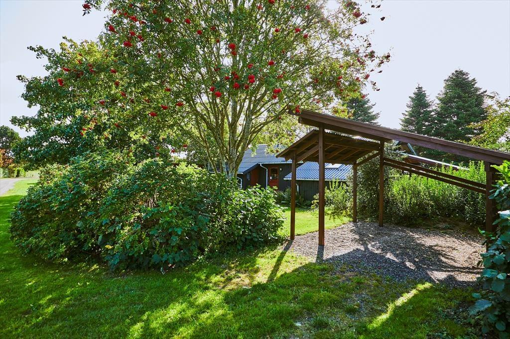I haven er der en dejlig stor terrasse, hvor der både er mulighed for at finde skygge og læ under den store overdækkede del af terrassen. Her sidder man hyggeligt, også selvom regnen skulle være lige på trapperne. Fra husets anden terrasse er der udsigt over havet. Haven er dejlig og med opvoksede træer og buske. Derudover er der en lille terrasse mod nord.