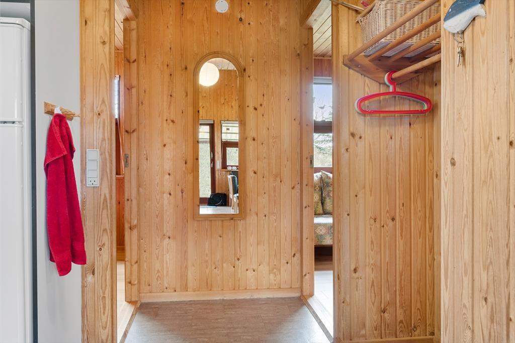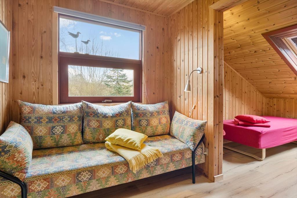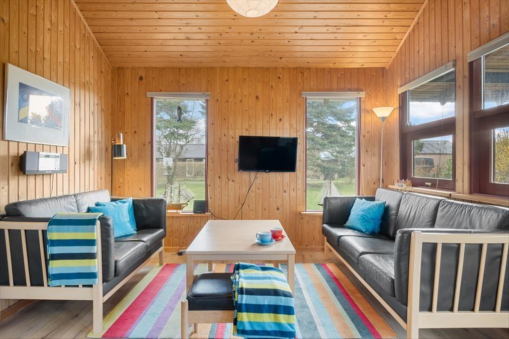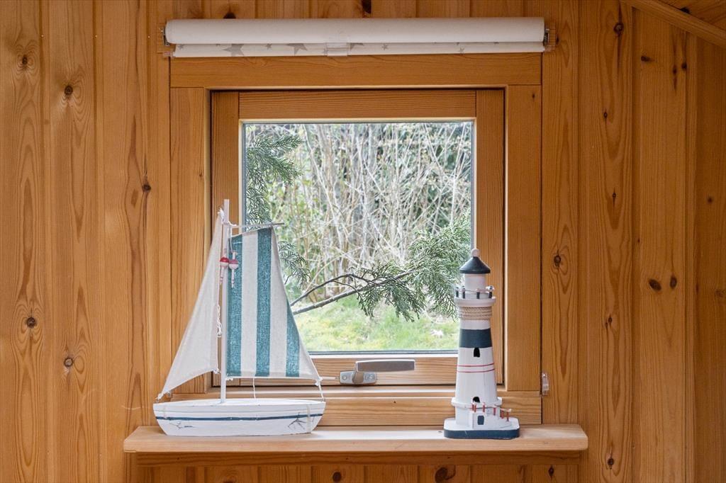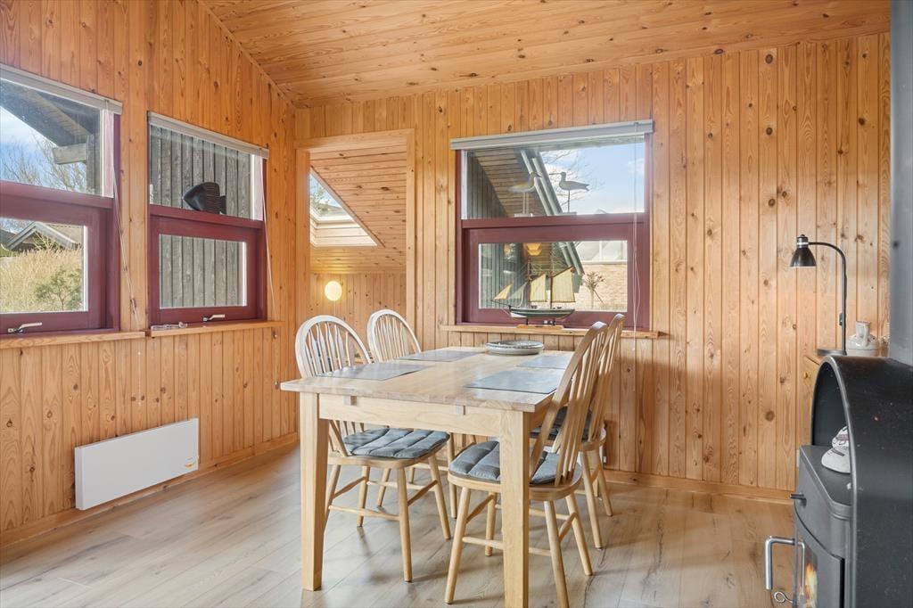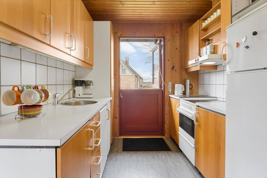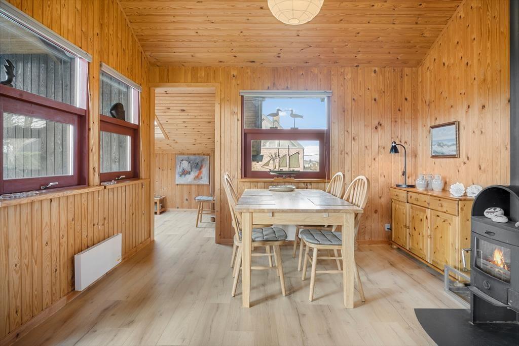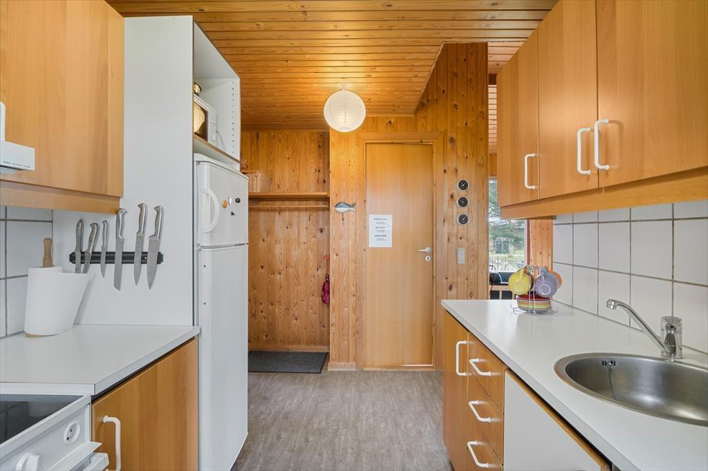 Sommerhuset er velholdt og funktionelt. Køkkenet er i åben forbindelse med stuen, hvor brændeovnen er husets centrum. Her kan man sidde og slappe af sammen med familien. Køkkenet er godt og funktionelt og indeholder opvaskemaskine. Her er barnestol og barneseng.