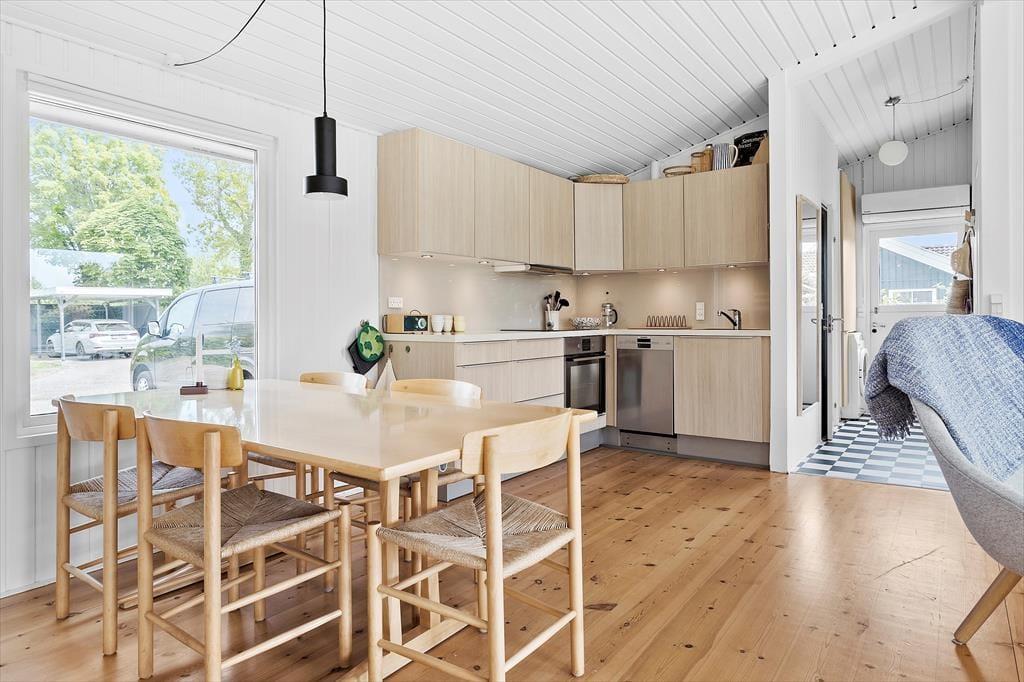 Centralt placeret i huset er der køkken/alrum, hvor køkkenet indeholder alt I har brug for under jeres ophold, af moderne faciliteter til god madlavning. Her kan I nyde lysindfaldet og den fine udsigt til haven.