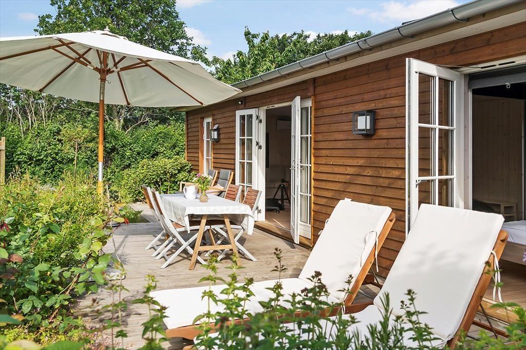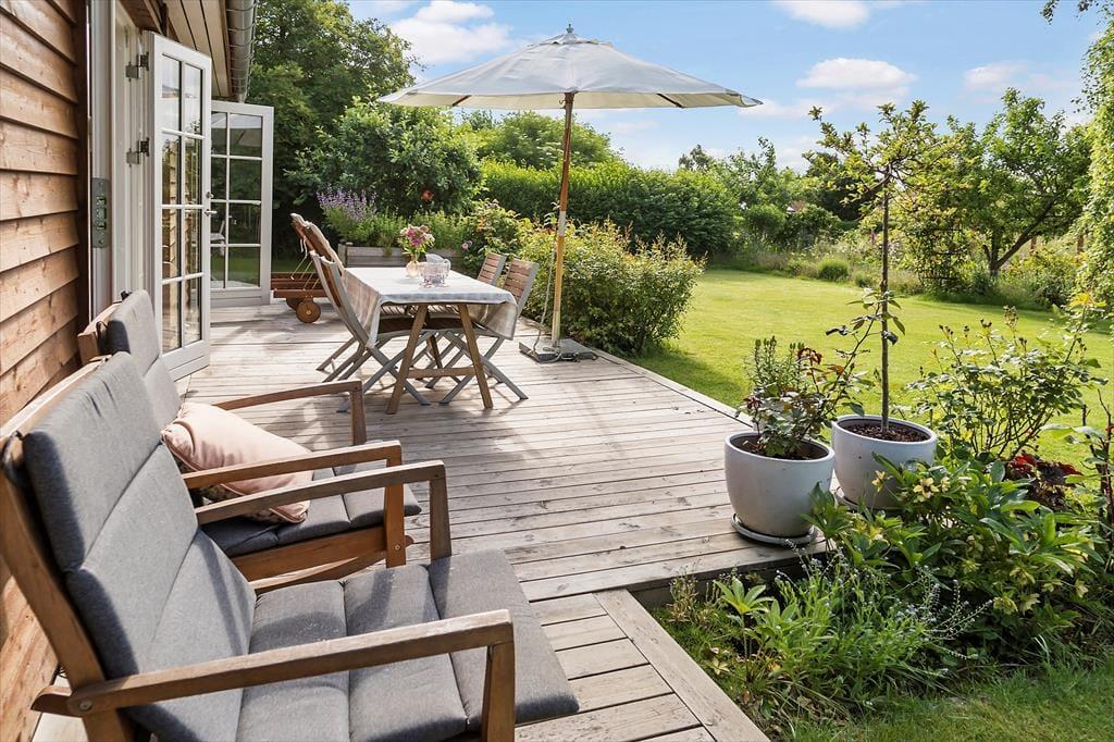 I denne have kan det gode ferieliv leves til fulde. Haven er stor og giver mulighed for leg og spil for både hund, børn og voksne. Terrassen byder på de bedste solspots med komfortable ligge- og solstole og skygge fra parasollen, som passer perfekt ind i stilen.