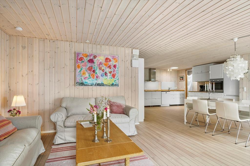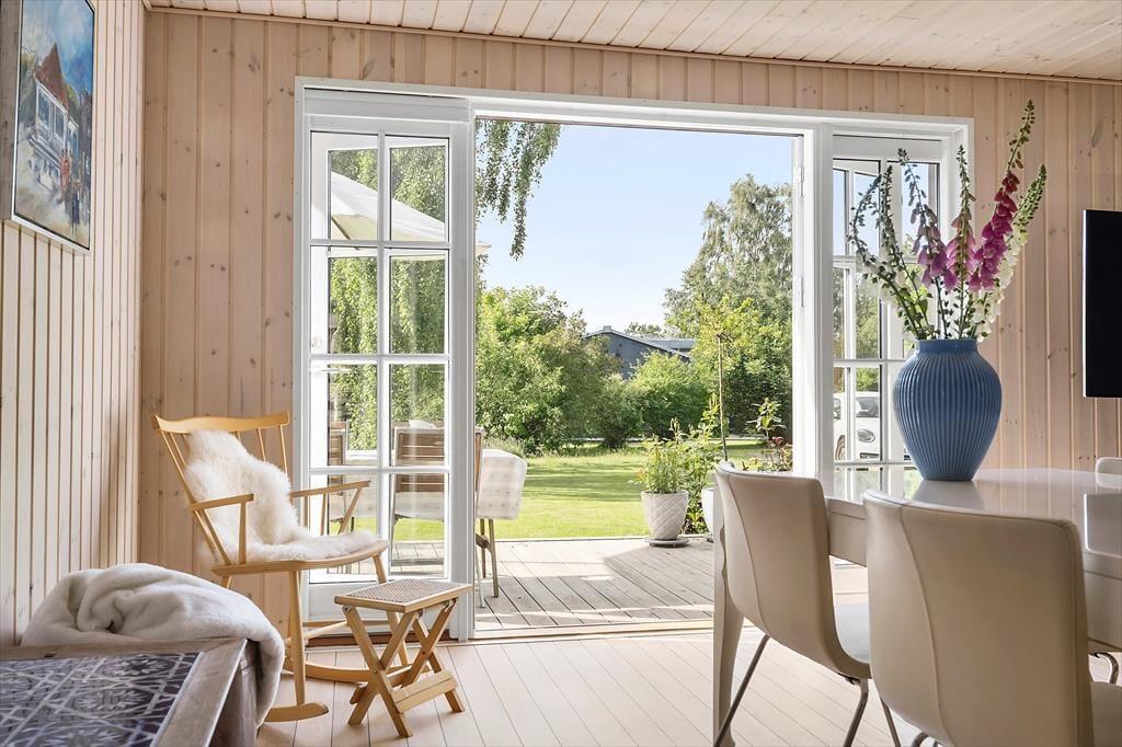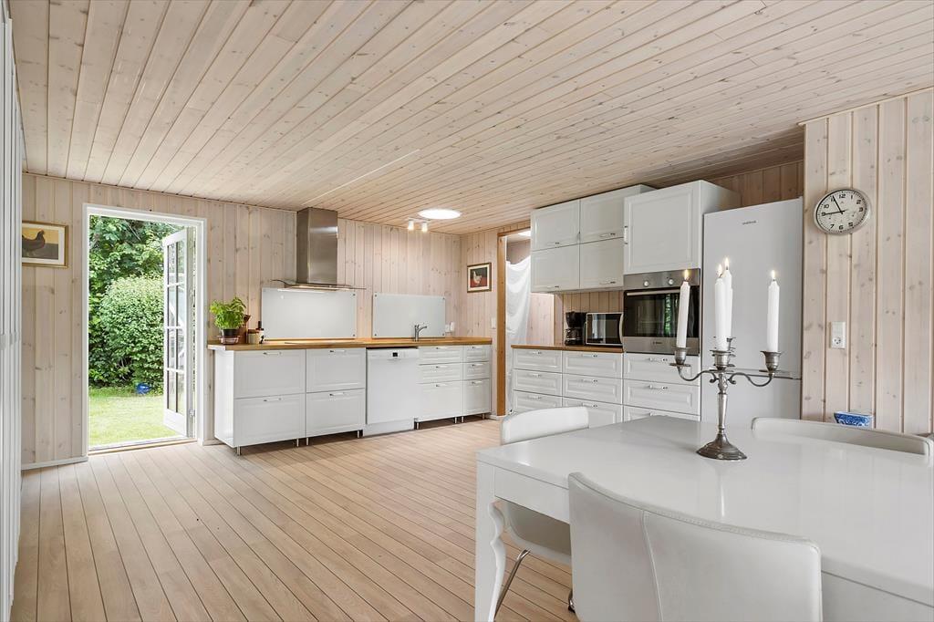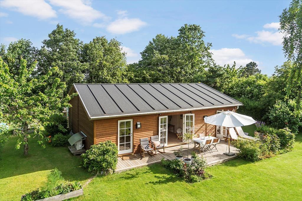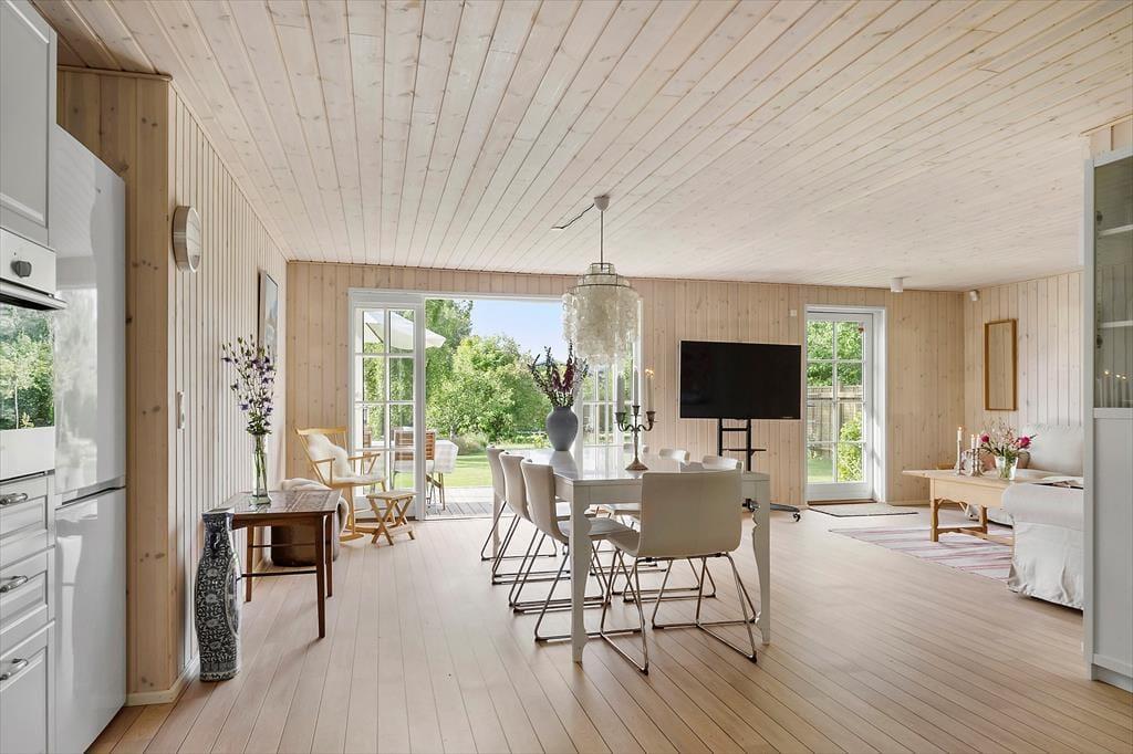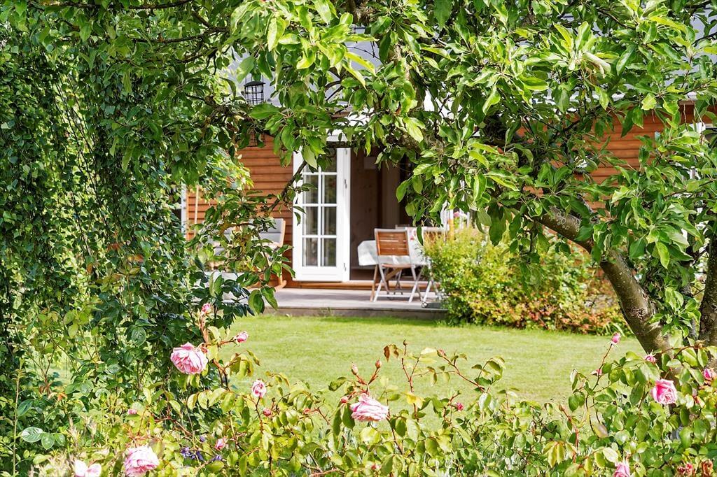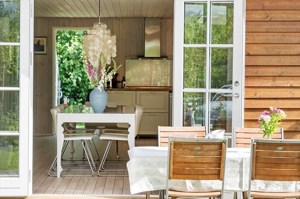 Stilen i sommerhuset er hyggelig og romantisk. Sommerhuset er meget veldisponeret så her er der god plads. To gode lyse værelser og et stort åbent køkken-alrum i forbindelse med stuen gør, at I har plads til at kunne være sammen. Lyset strømmer ind gennem de klassiske danebro sprossede terrassedøre og giver en fortryllende udsigt. Med adgang direkte til terrassen fra stuen, køkkenet og alrummet smeltet ude- og inderummet sammen.