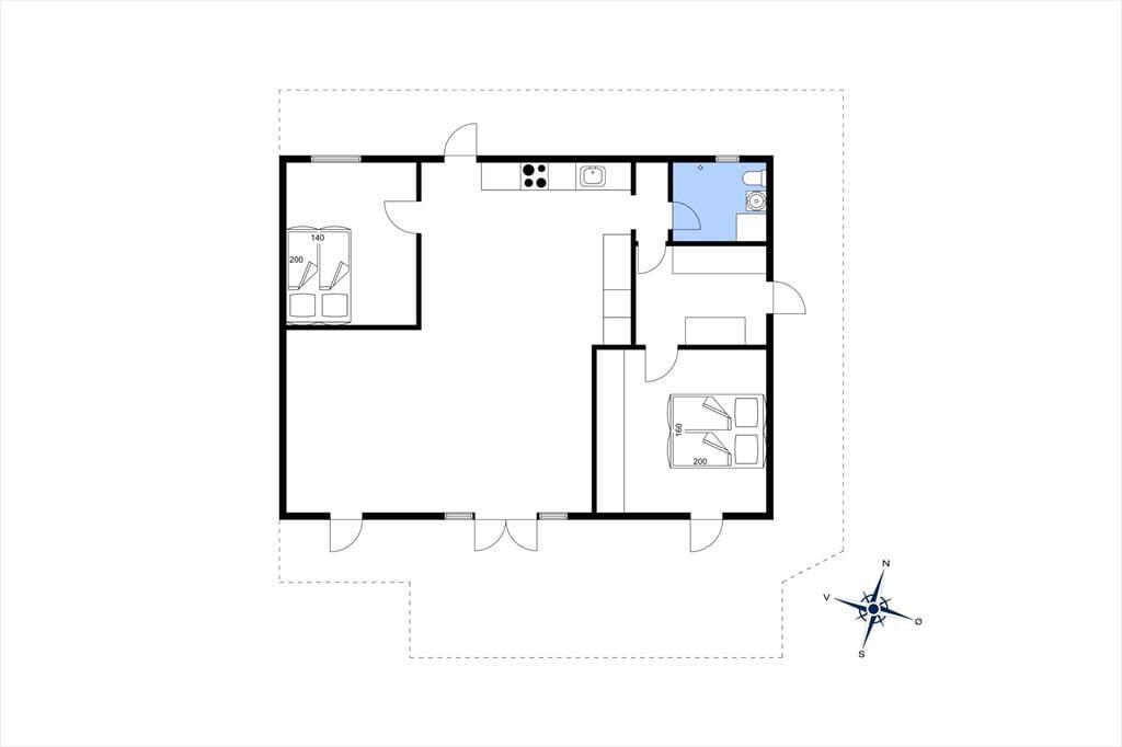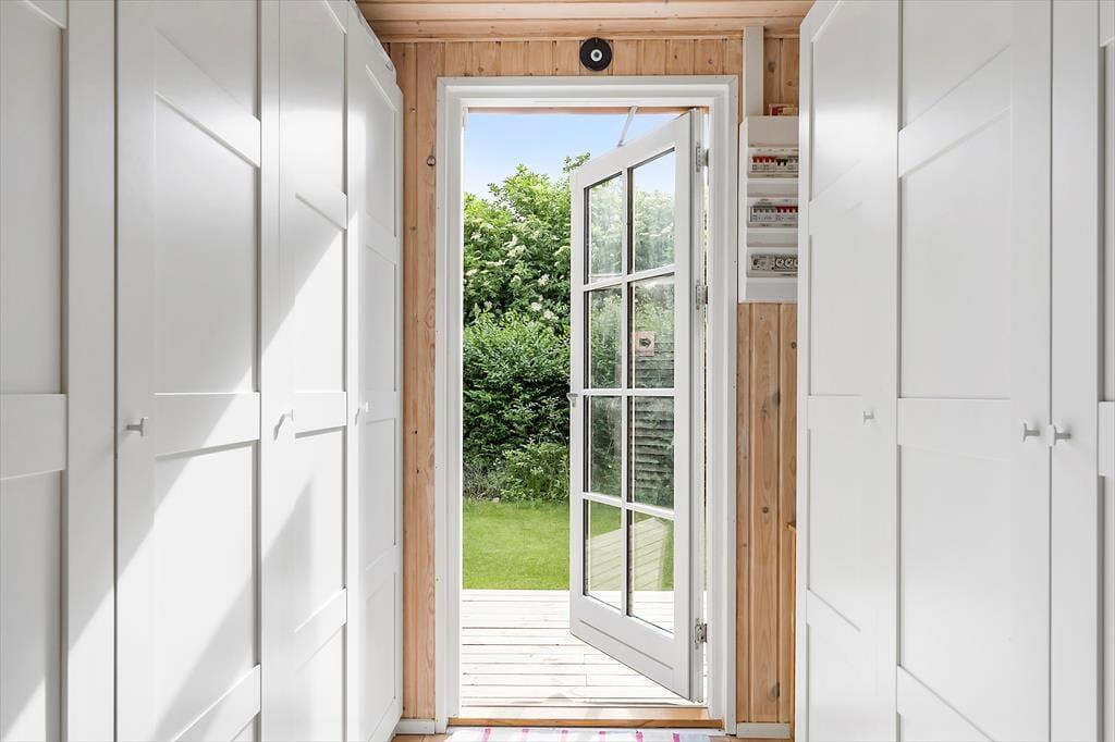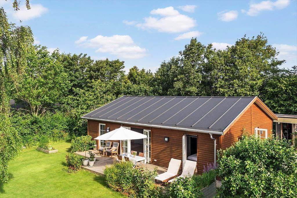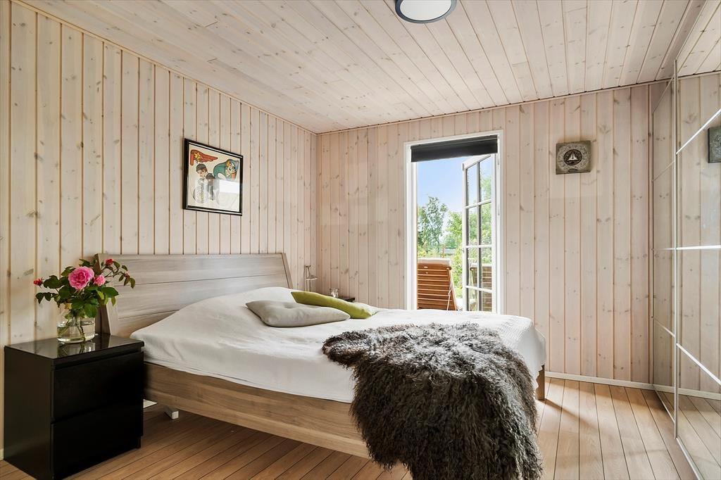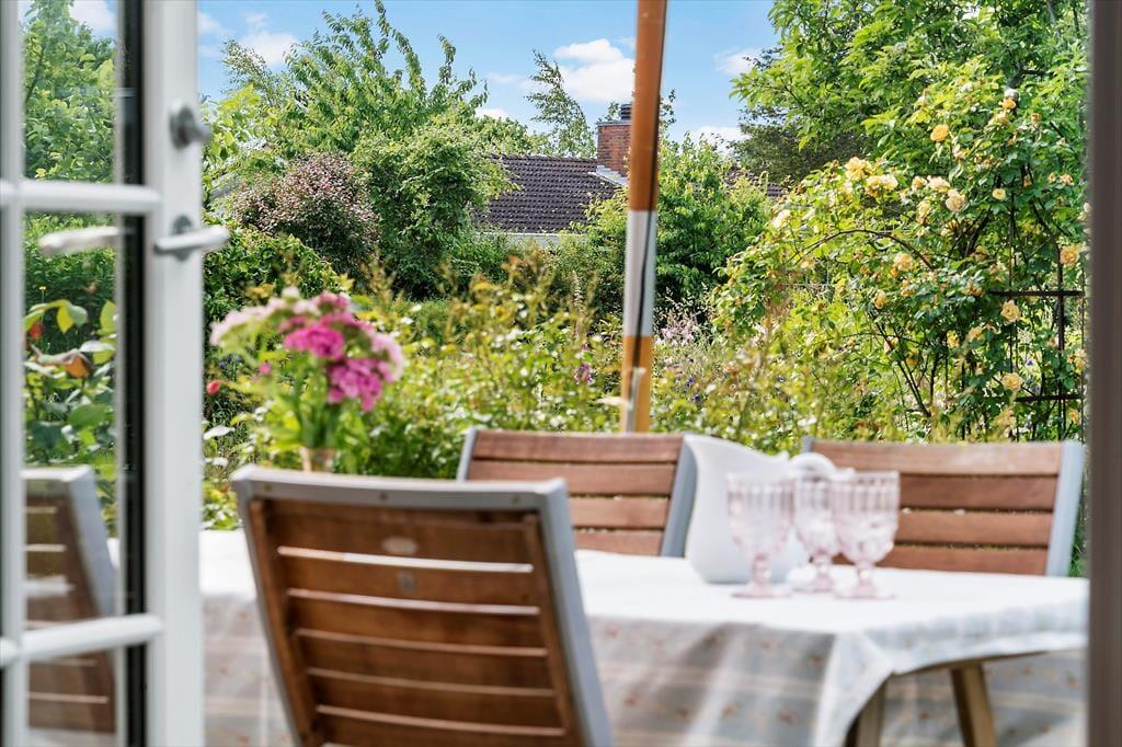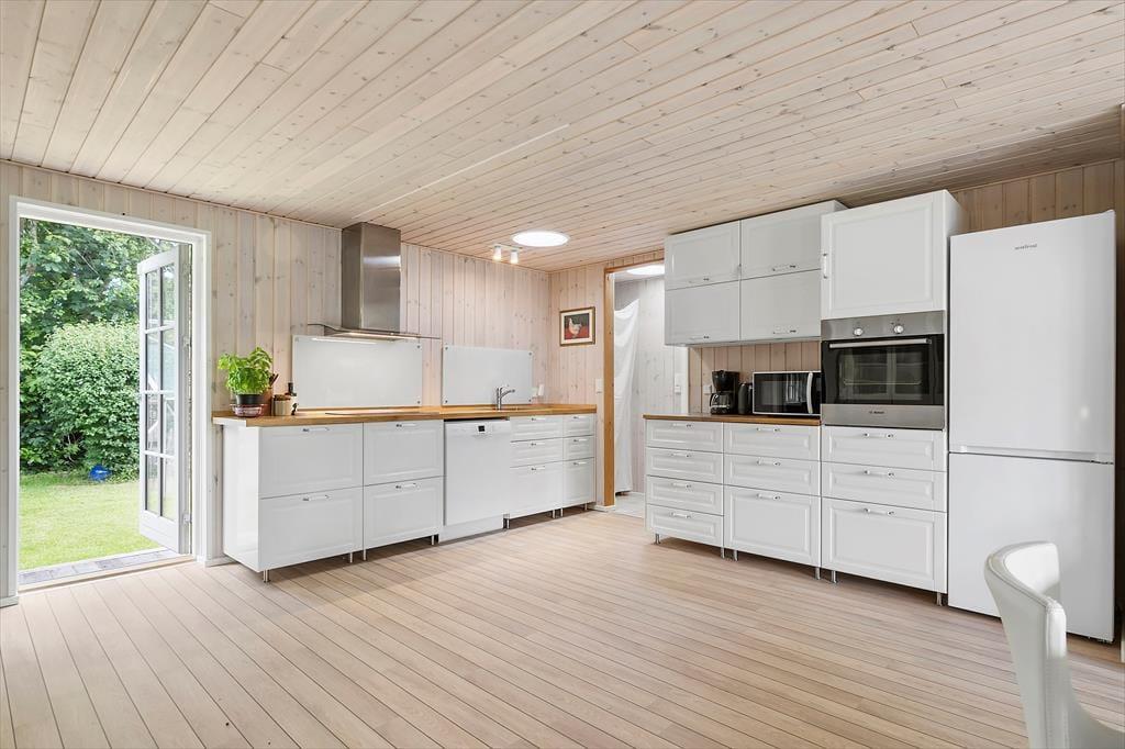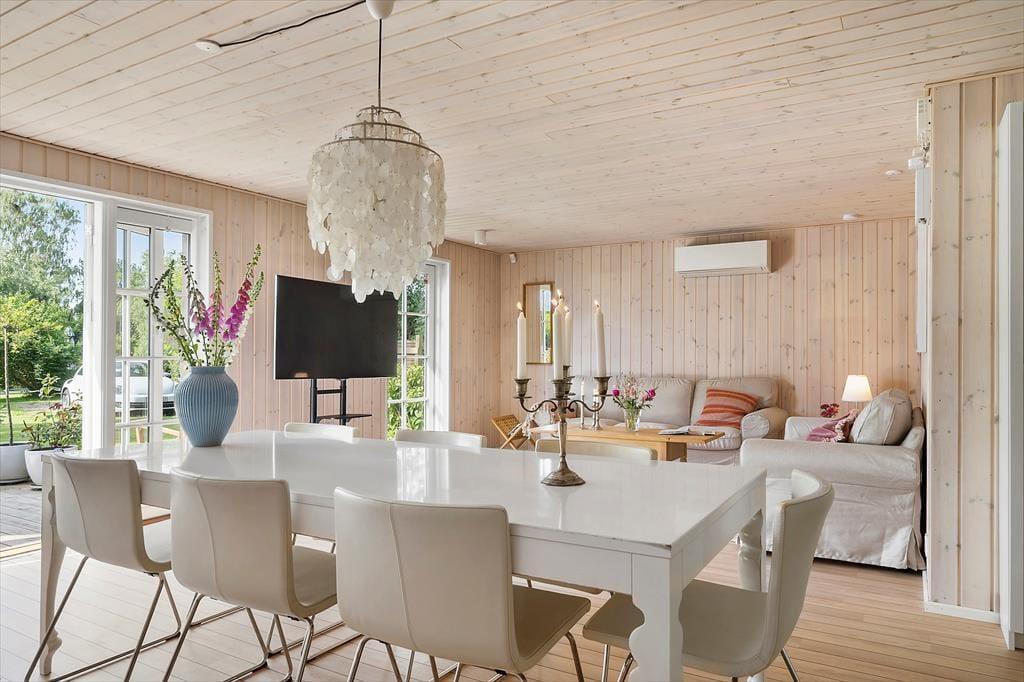 Stilen i sommerhuset er hyggelig og romantisk. Sommerhuset er meget veldisponeret så her er der god plads. To gode lyse værelser og et stort åbent køkken-alrum i forbindelse med stuen gør, at I har plads til at kunne være sammen. Lyset strømmer ind gennem de klassiske danebro sprossede terrassedøre og giver en fortryllende udsigt. Med adgang direkte til terrassen fra stuen, køkkenet og alrummet smeltet ude- og inderummet sammen.
