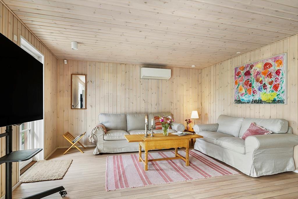 Om aftenen, når duggen falder, kan du trække indenfor og slænge sig i den behagelige sofa. Her kan du slappe af med dine yndlingsfilm, som du selv kan streame via husets Chromecast.